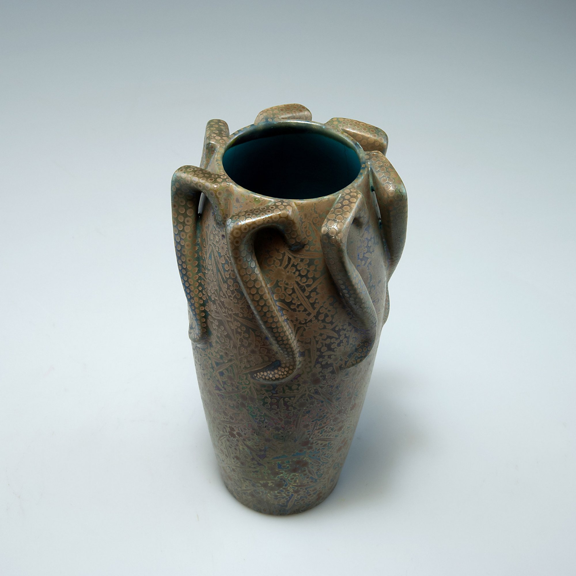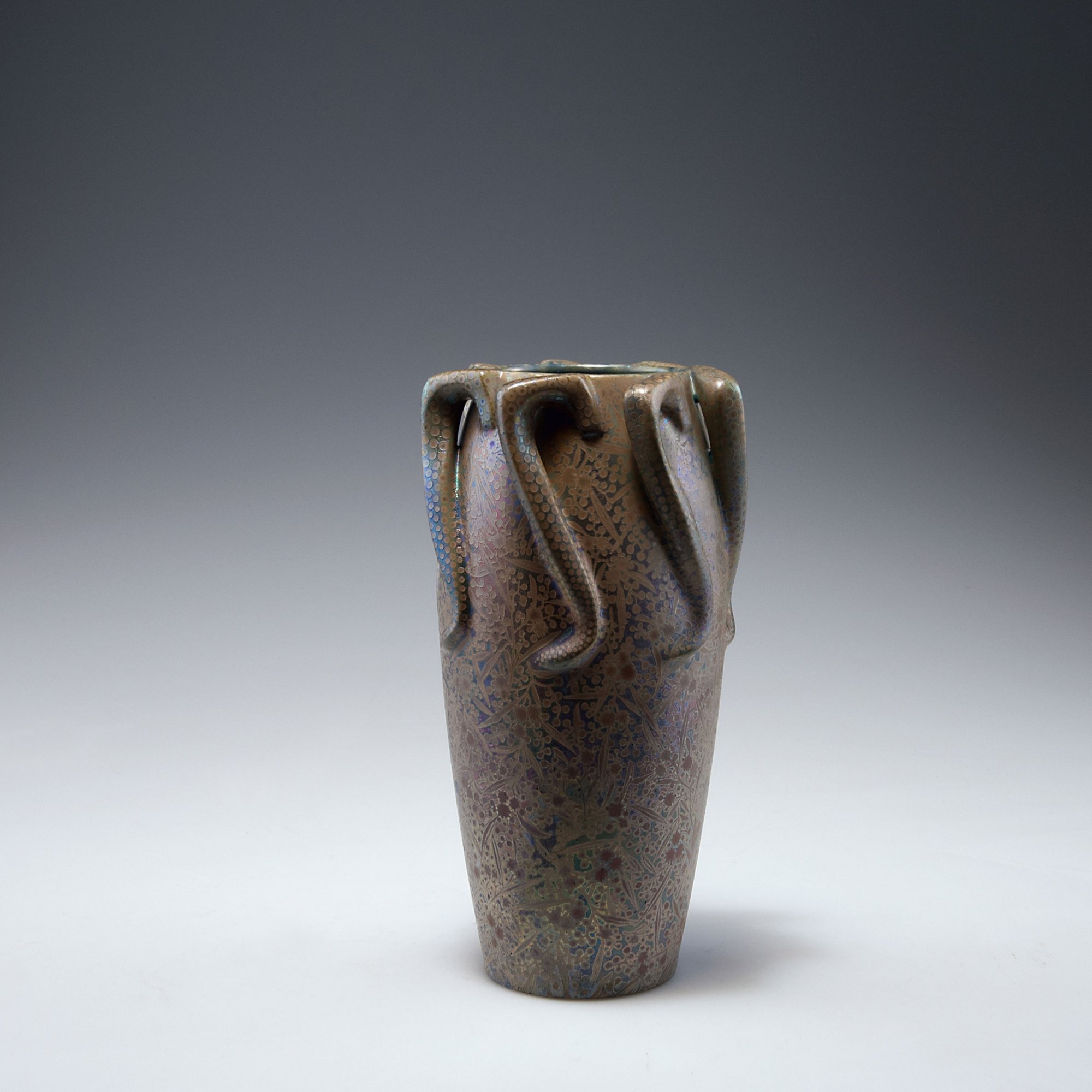 Clément Massier, Golfe-Juan. Vase with snake, c1890. H. 20.4 cm. Earthenware, lustre glaze, different kinds of grass, beige/brown. Marked: C. M. Golfe-Juan (A.M.).