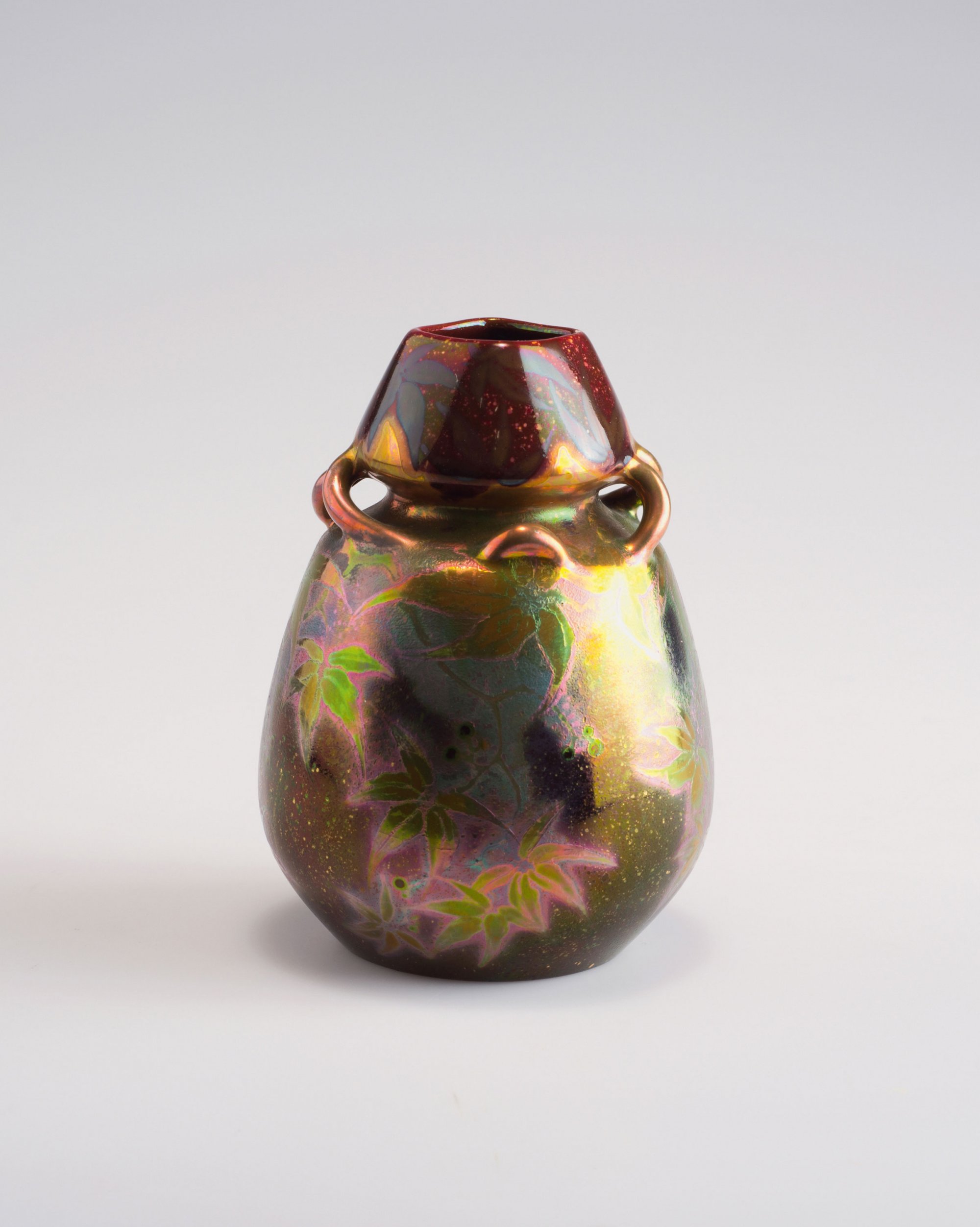 Clément Massier, Golfe-Juan. Vase with handles, c1890. H. 12 cm. Earthenware, lustre glaze, dark red and gold. Flowers. Marked: Clément Massier Golfe-Juan A. M.