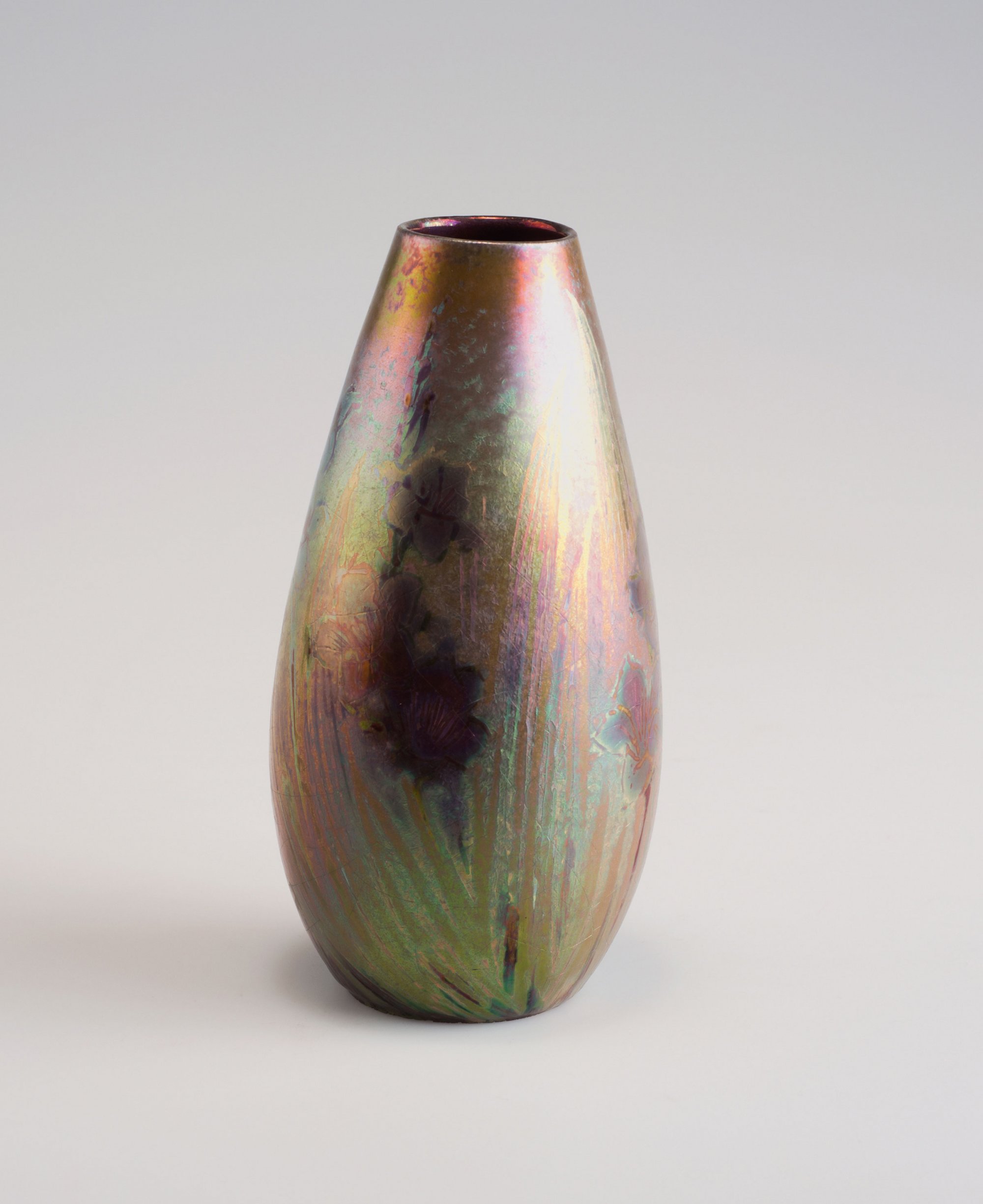 Clément Massier, Golfe-Juan. Small vase, c1890. H. 16.3 cm. Faience, lustre glaze, gold and dark red. Flowers. Marked: CM GOLFE-JUAN AM.
