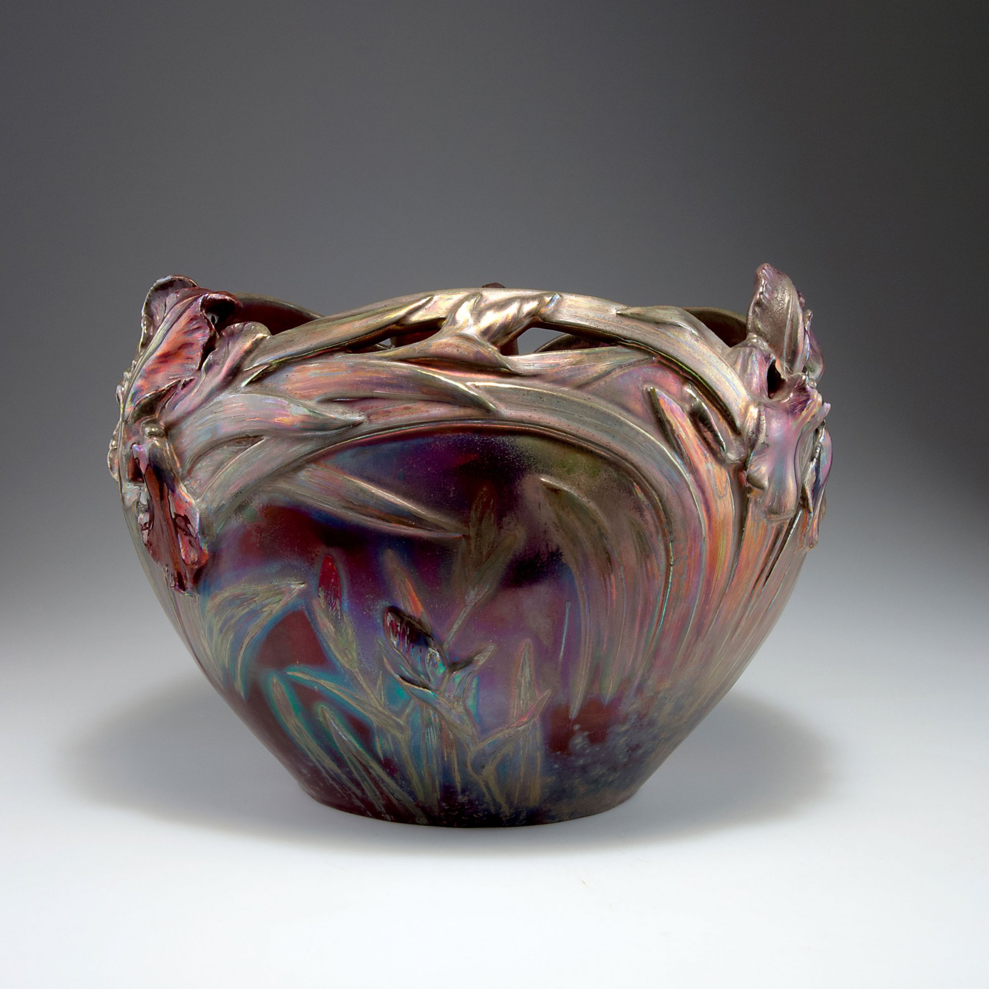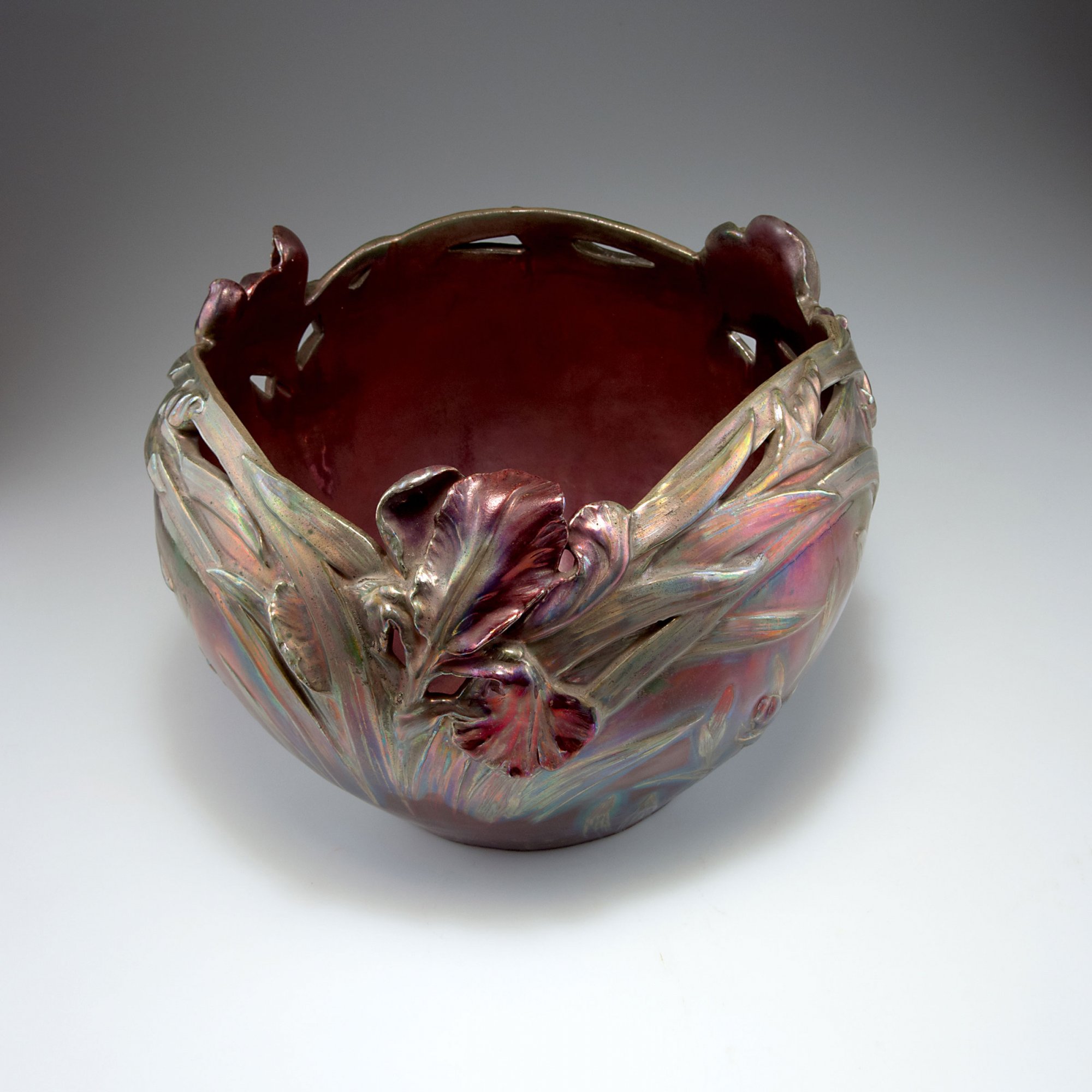 Delphin Massier, Vallauris. Flowerpot with iris, c1890. H. 24.5 cm; D. 33 cm. Faience, lustre glaze, dark red, green and gold, reliefed pattern with iris. Marked: DELPHIN MASSIER VALLAURIS AM.