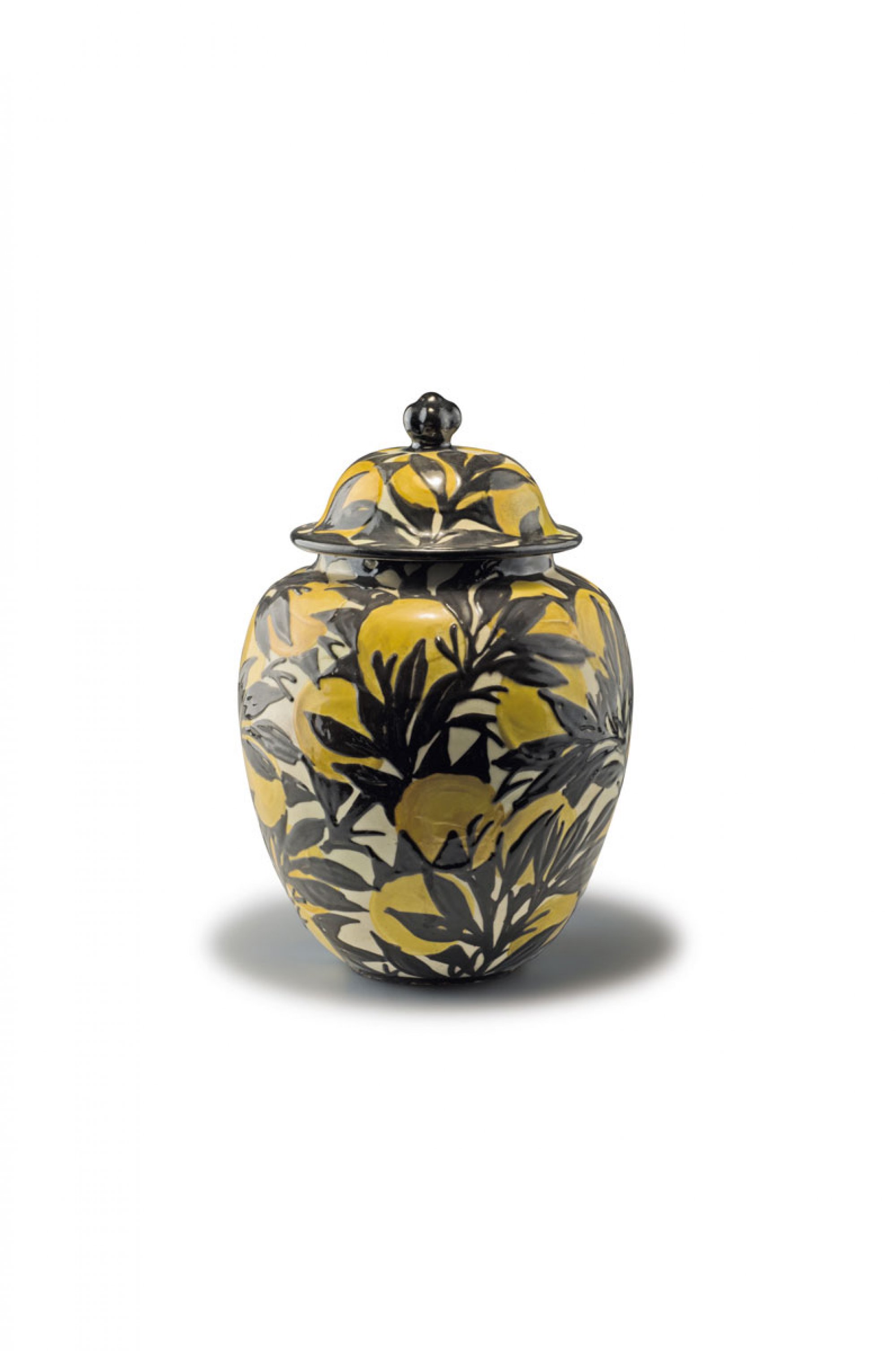 Max Laeuger. Vase and cover, 1921-23. H. 34 cm; D. 23.5 cm. Made by Majolikamanufaktur Karlsruhe. Majolica, glazed white, yellow and black slip glaze. Marked: Maker's mark, 1802, PROF. LÄUGER Baden Eb 30, Germany.