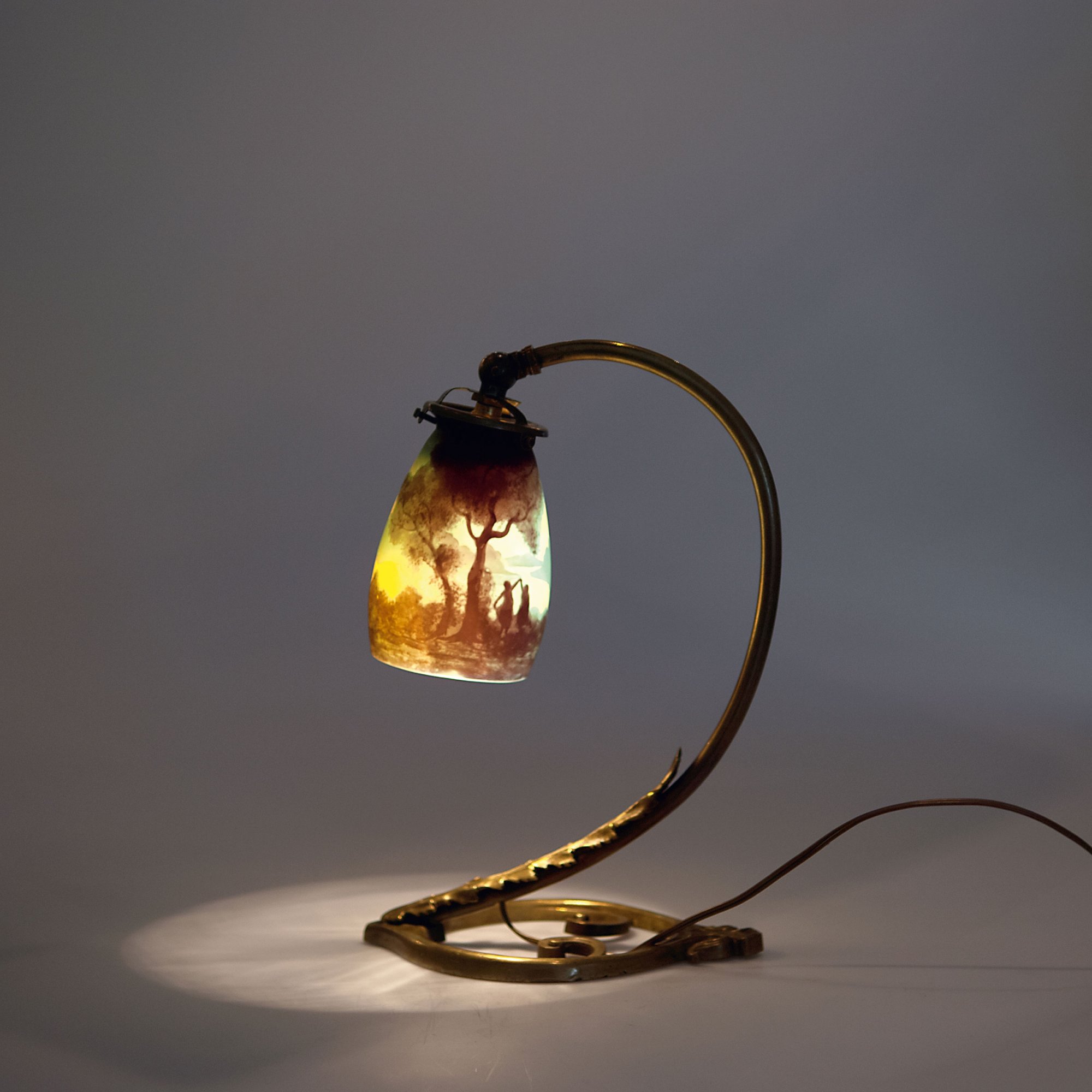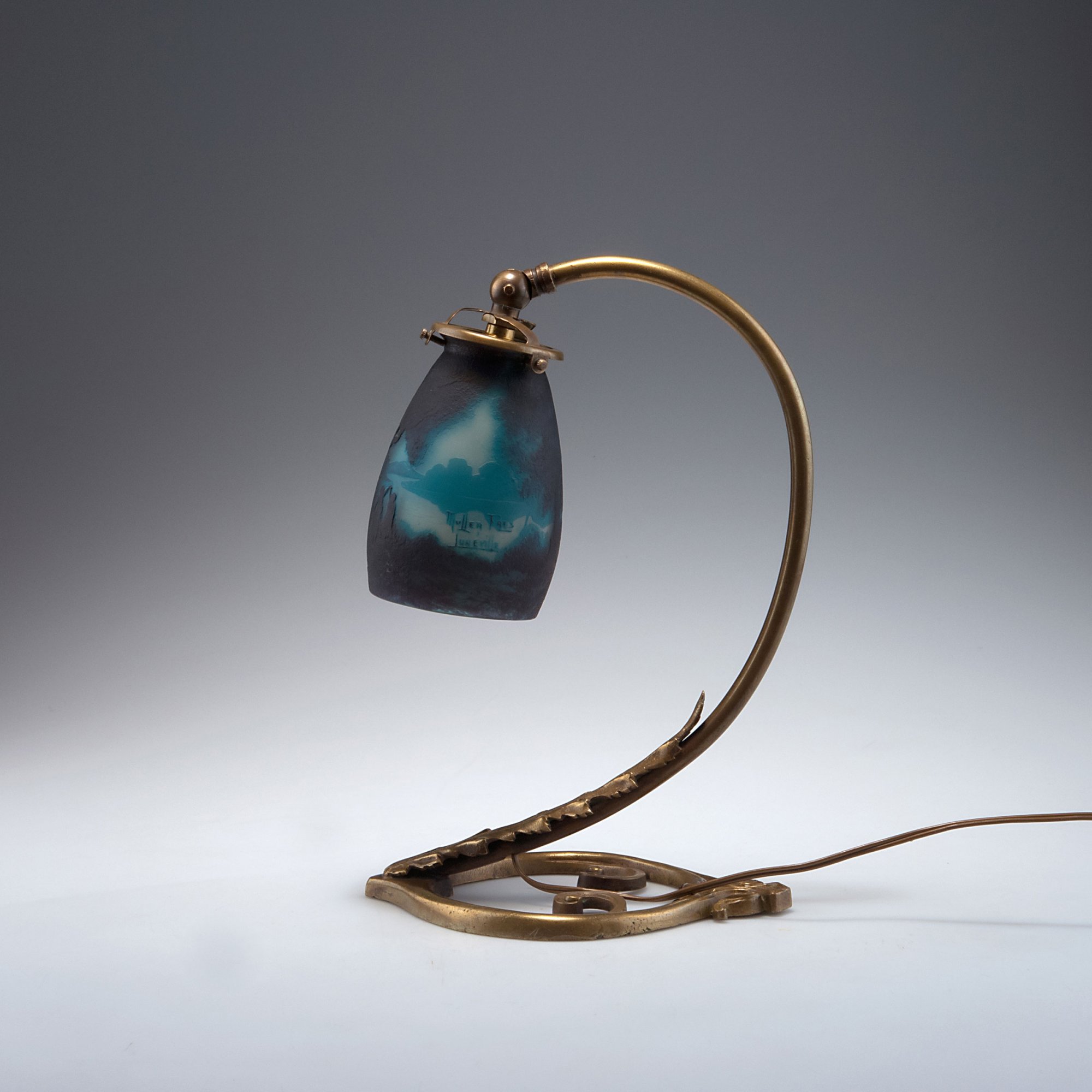Muller Frères, Lunéville. 'La cueillette' table light, 1920-25. H. 29.5 cm. Brownished brass base, shade: cased glass, clear, white and blue. Etched pattern, landscape with lake and trees, two women harvesting. Signed: MULLER FRES LUNEVILLE.