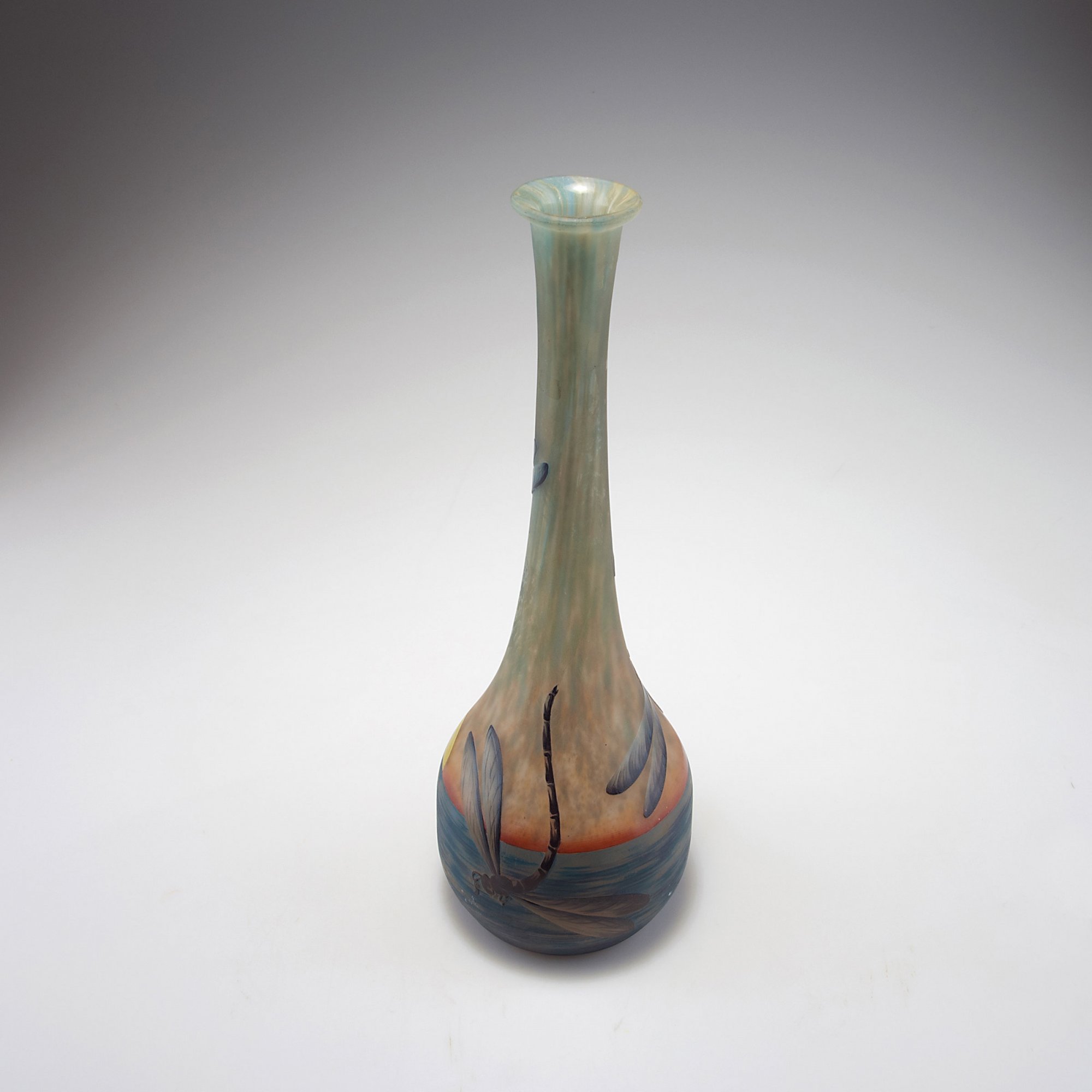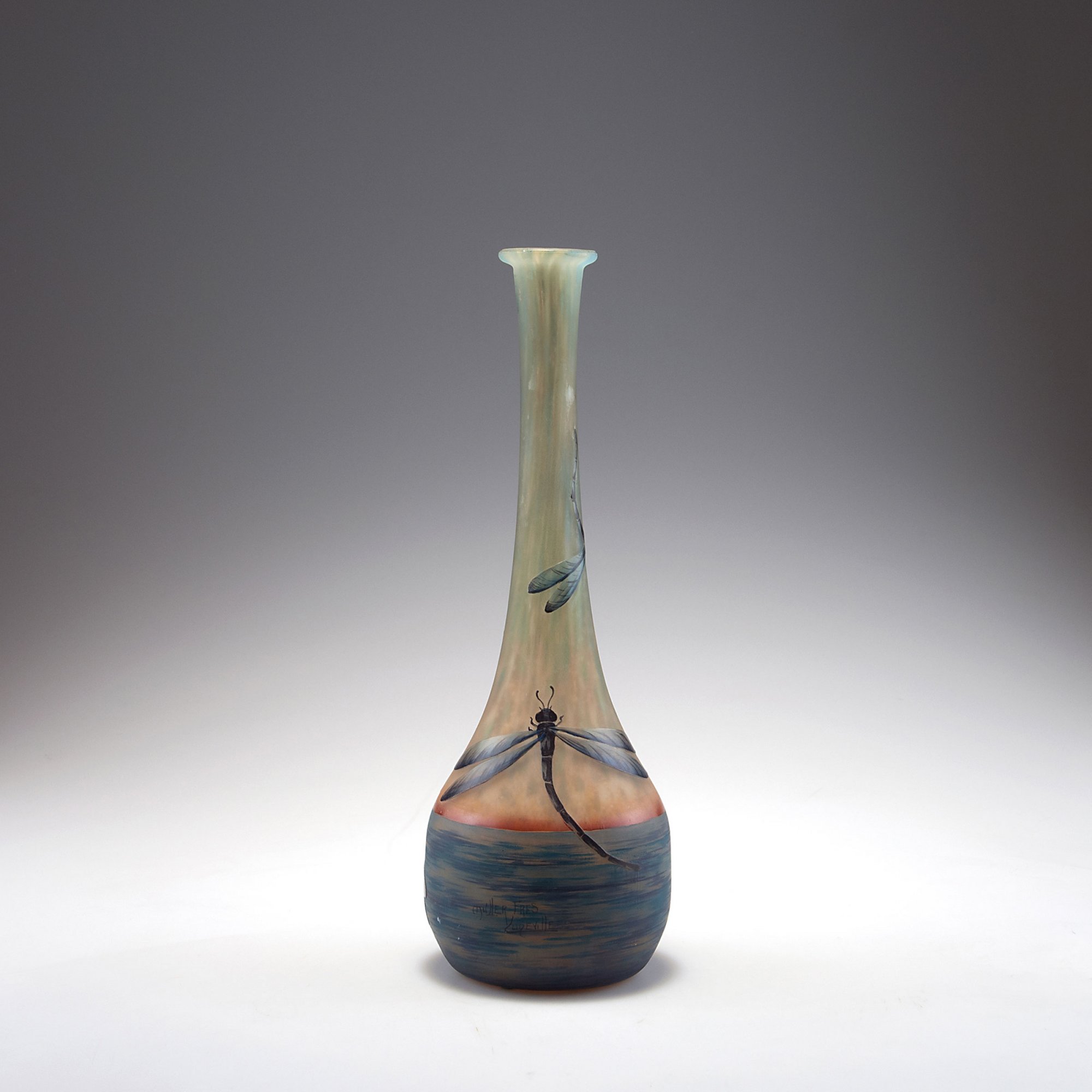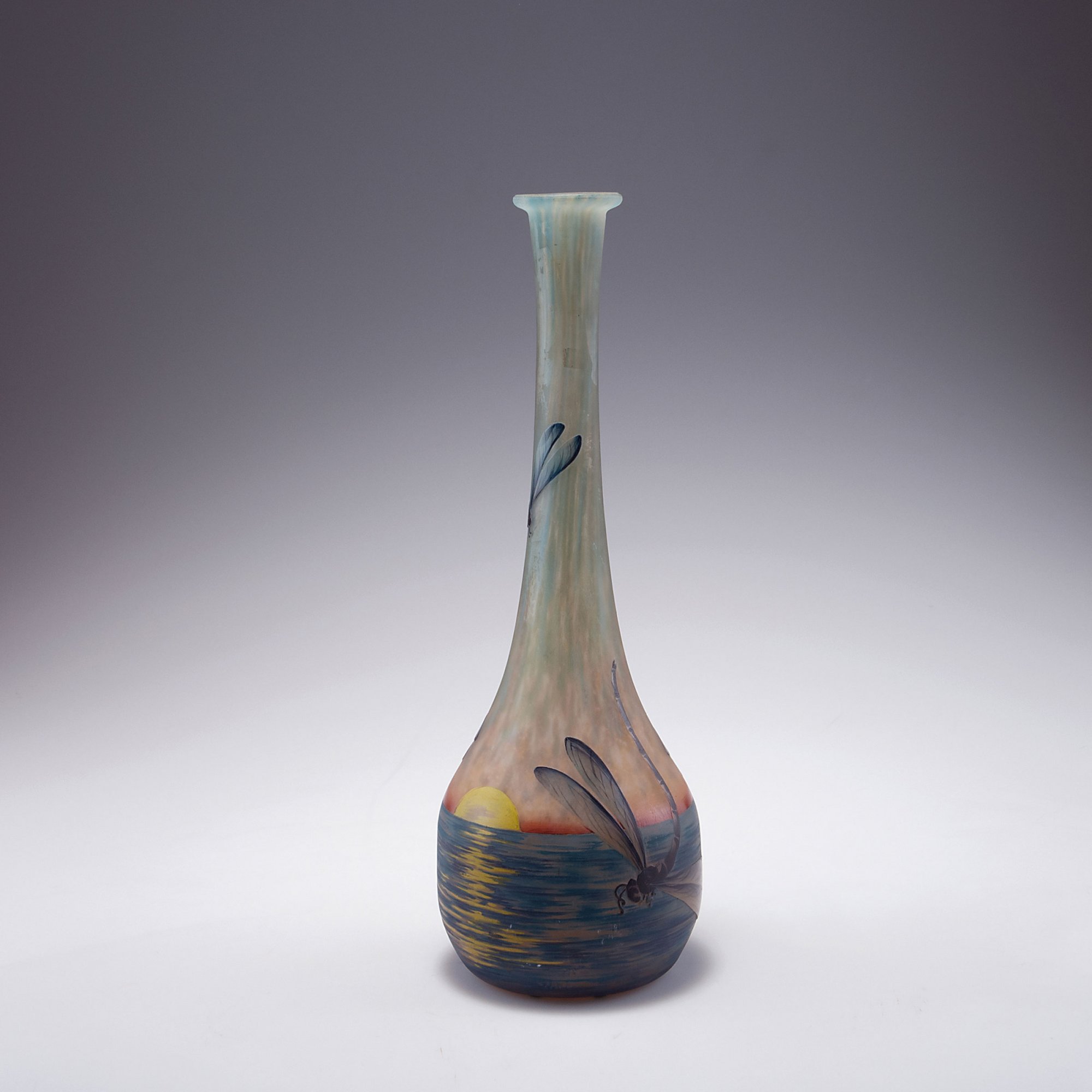 Muller Frères, Lunéville. Vase with dragonfly at dusk, c1925. H. 35 cm. Cased glass, clear, powder inclusions, orange, yellow and green. Etched and enamelled pattern with three dragonflies and sunset above the sea. Signed: MULLER FRES LUNEVILLE.