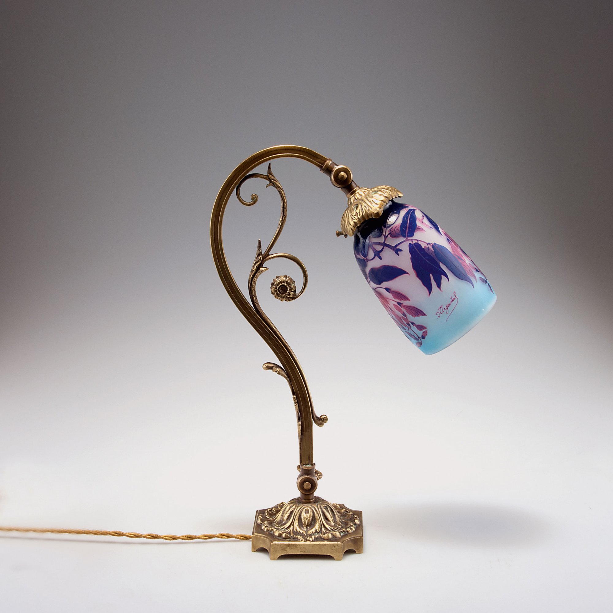 Paul Nicolas, Nancy. 'Glycines' table light, 1919-24. H. 38 cm. Brass base, stylised flowers, part brownished. Shade of cased glass, clear, sky blue, red and cobalt, etched pattern, wisteria. Signed: D'Argental.