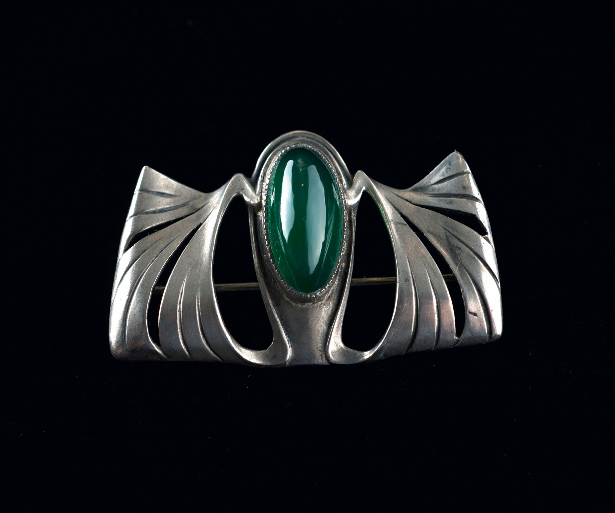 Patriz Huber. Brooch, 1901/02. 2.5 x 4 cm. Made by Theodor Fahrner, Pforzheim. Silver, chrysoprase. Marked: Maker's mark 935 DEPOSE, artist's signet.