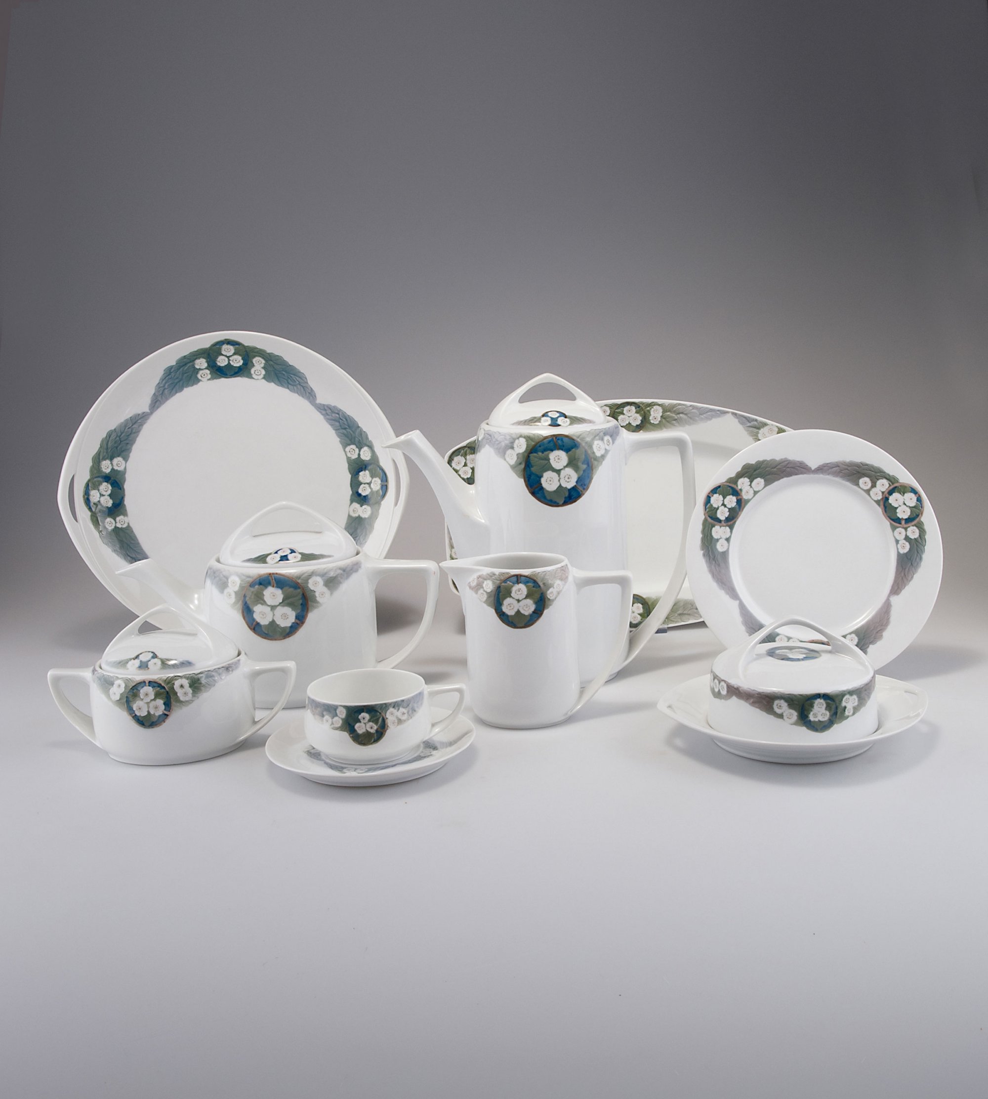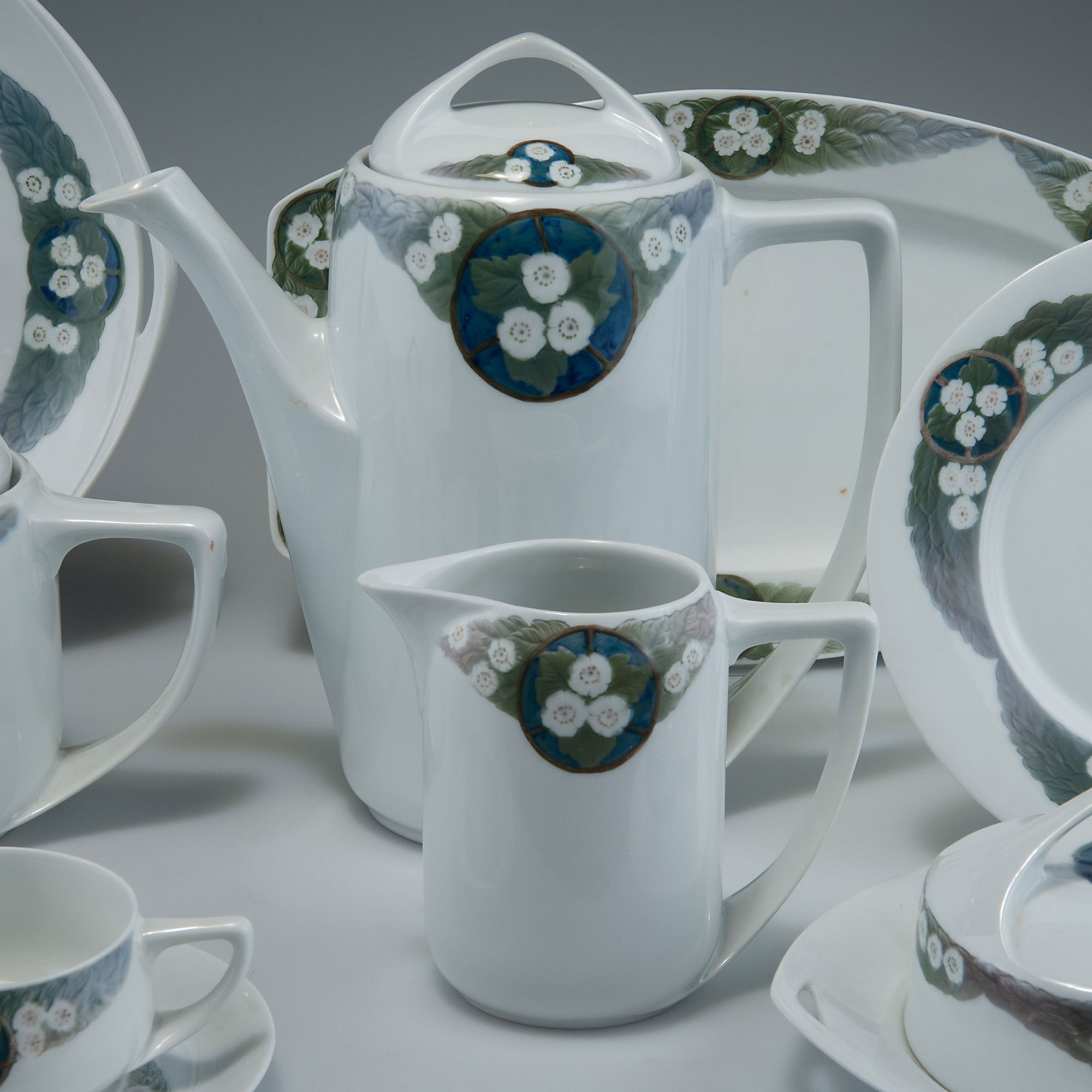 Rosenthal, Selb. 'Donatello' coffee and tea set with 'Hawthorn' pattern, c1910. 37 pieces. Coffee pot, H. 24.3 cm; teapot, H. 15.2 cm; creamer, H. 11.7 cm; sugar bowl, H. 10.3 cm; butter dish, H. 8.6 cm; 19 x 17.5 cm; 6 cups and saucers, H. 4.7 cm; 8 bread plate, D. 15.6 cm; 6 dessert plates, D. 19.8 cm; 7 plates, D. 21.5 cm; platter with handles, 29.8 x 27 cm; 2 rectangular platters, 28 x 17.5-32.4 x 20 cm. Designed by Hans Günter Reinstein. Made c1910. Porcelain, white, glazed, polychromatic underglaze by Julius Vilhelm Gulbrandsen. Marked: Maker's mark.
