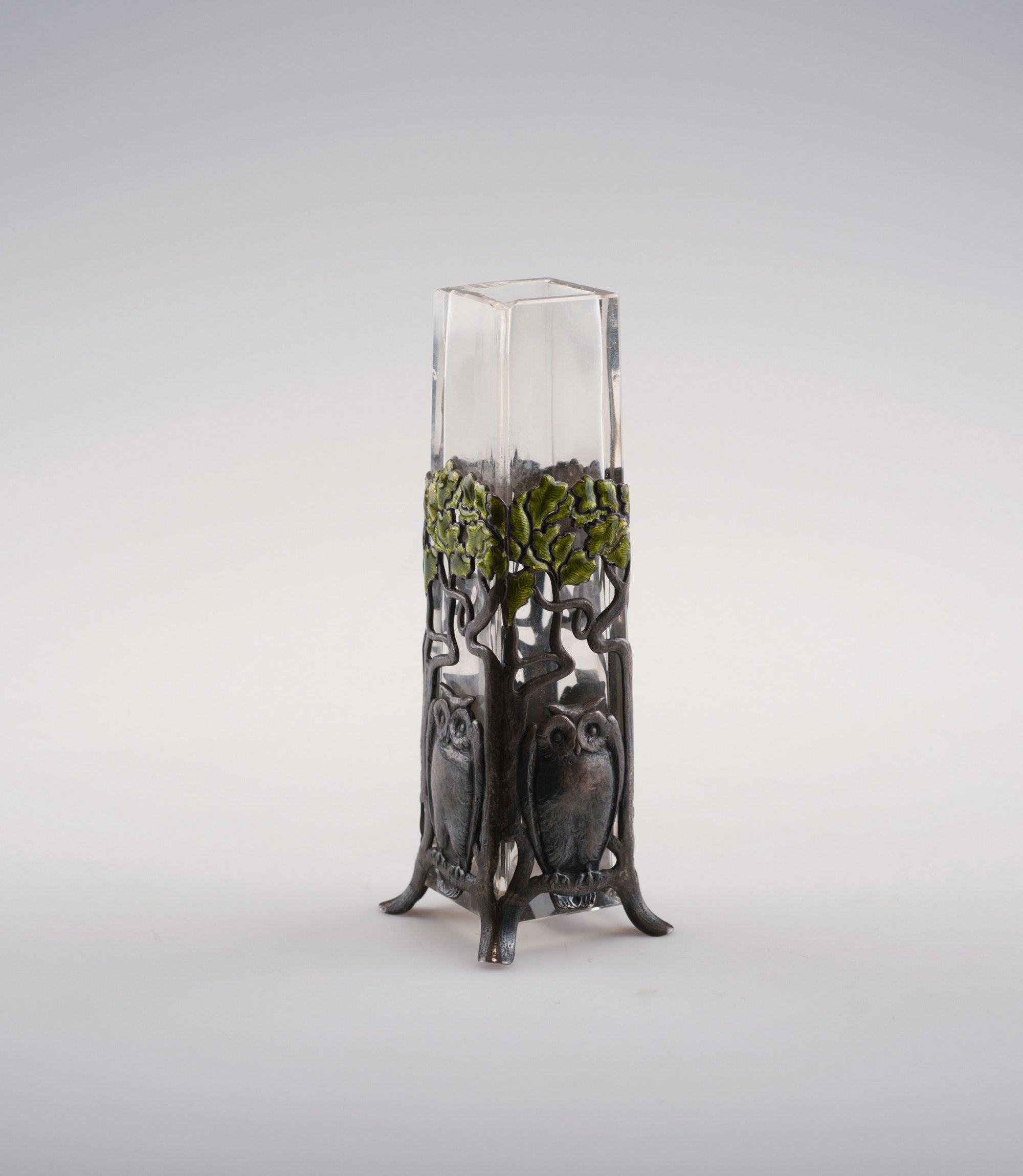 G. A. Scheid, Vienna. Small vase with mounting, c1905. H. 13.9 cm. Silver, part enamelled green. Owls. Clear glass inset. Marked: GAS, Diana's head.