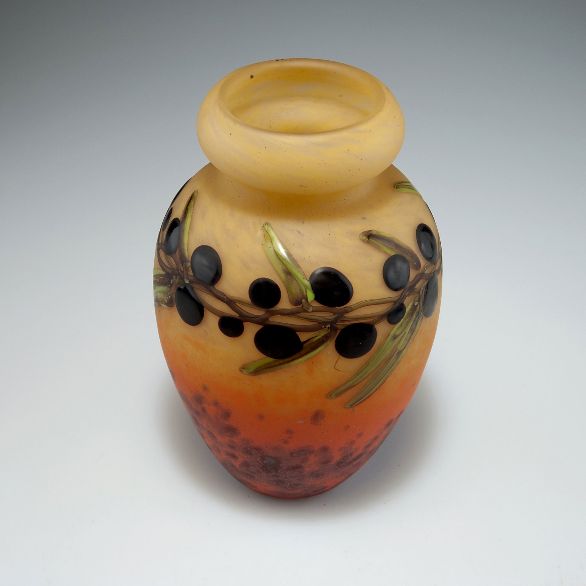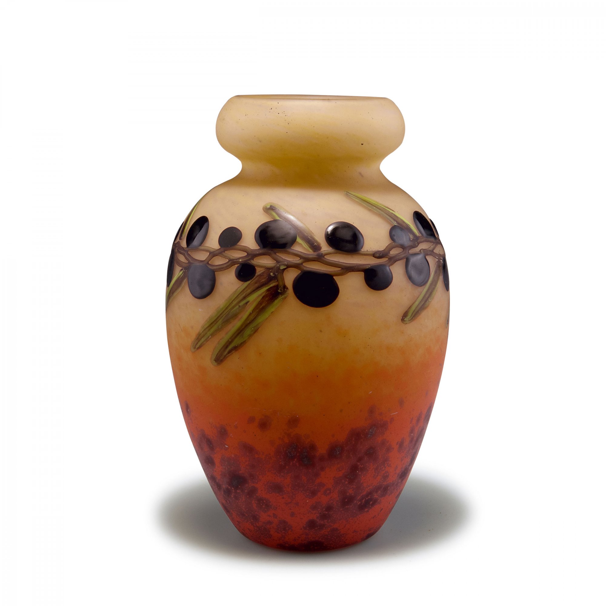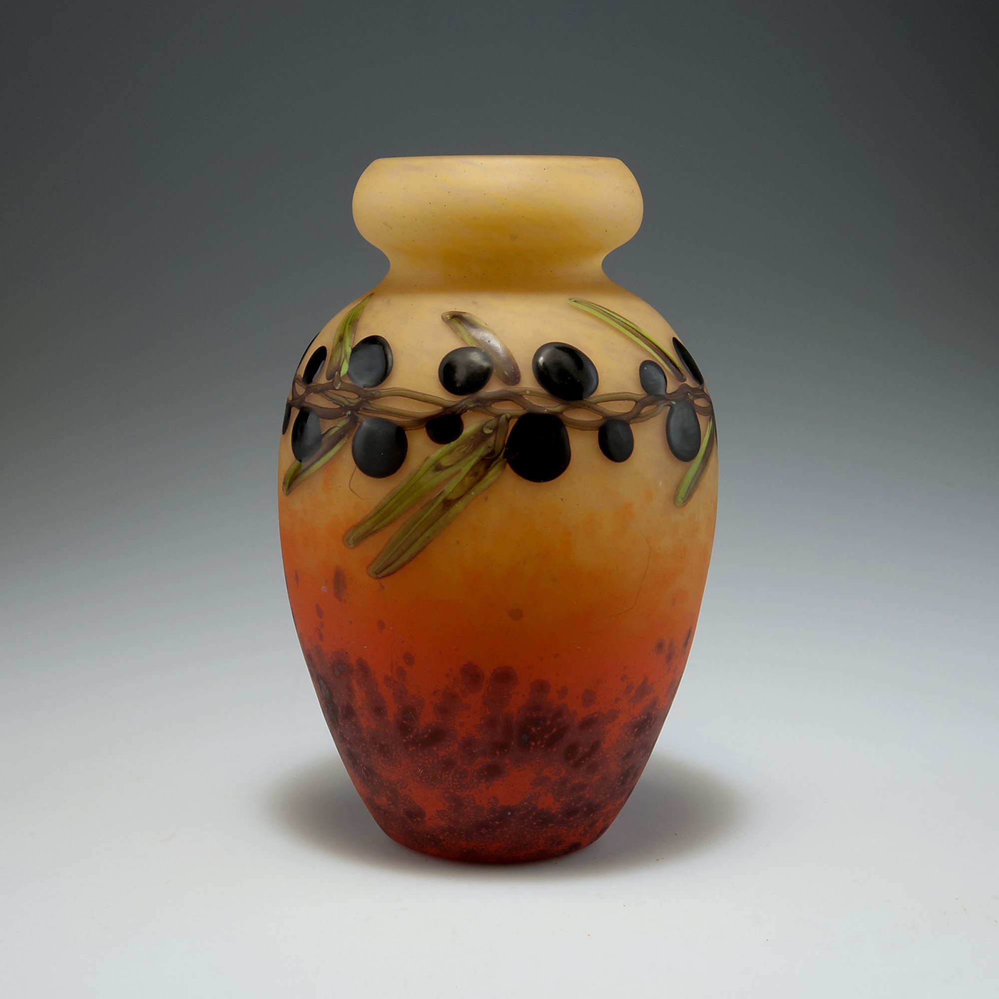 Schneider, Epinay-sur-Seine. 'Olives' vase, 1920-22. H. 25.6 cm. Cased glass, clear, pale yellow powder inclusions, powder fusions, purple and orange. Applied leaves with olives, black and green gather. Part iridescent. Signed: Schneider.