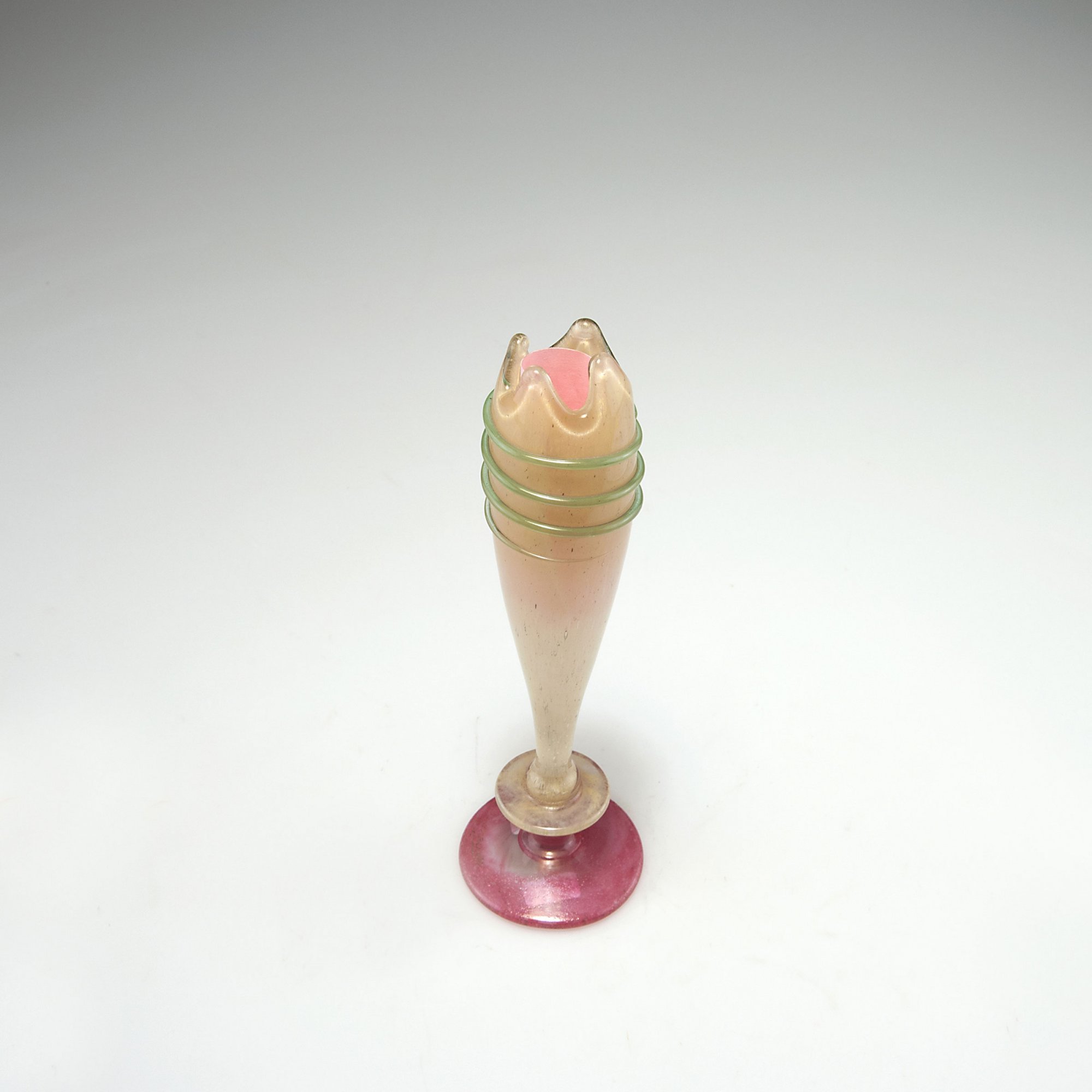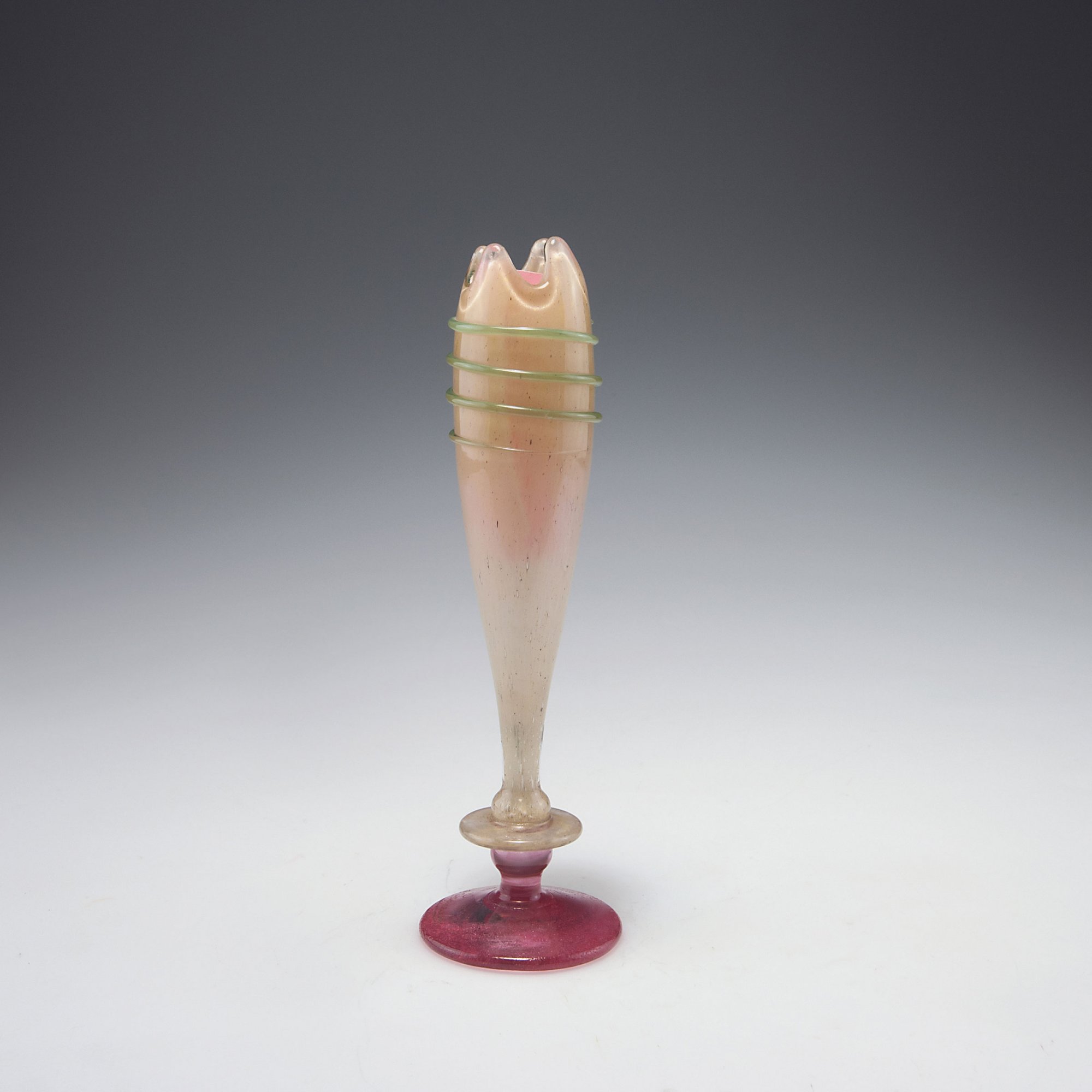 Schneider, Epinay-sur-Seine. 'Coupe bijou', c1920-22. H. 20.8 cm. Clear glass, powder inclusions, yellow. Applied green threads, foot purple. Marked: Schneider.