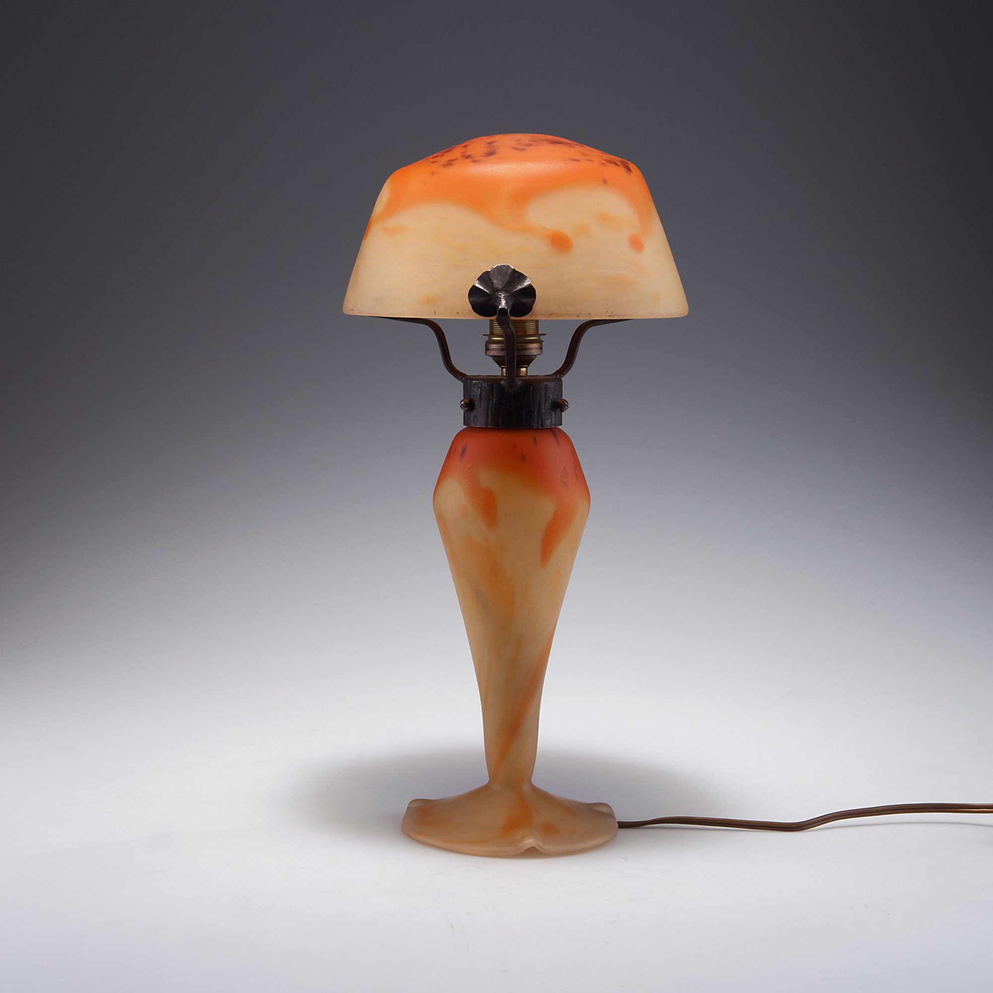 Schneider, Epinay-sur-Seine. Table light, 1918-22. H. 36.8 cm. Cased glass, clear, yellow, orange and purple powder inclusions. Signed: Schneider.