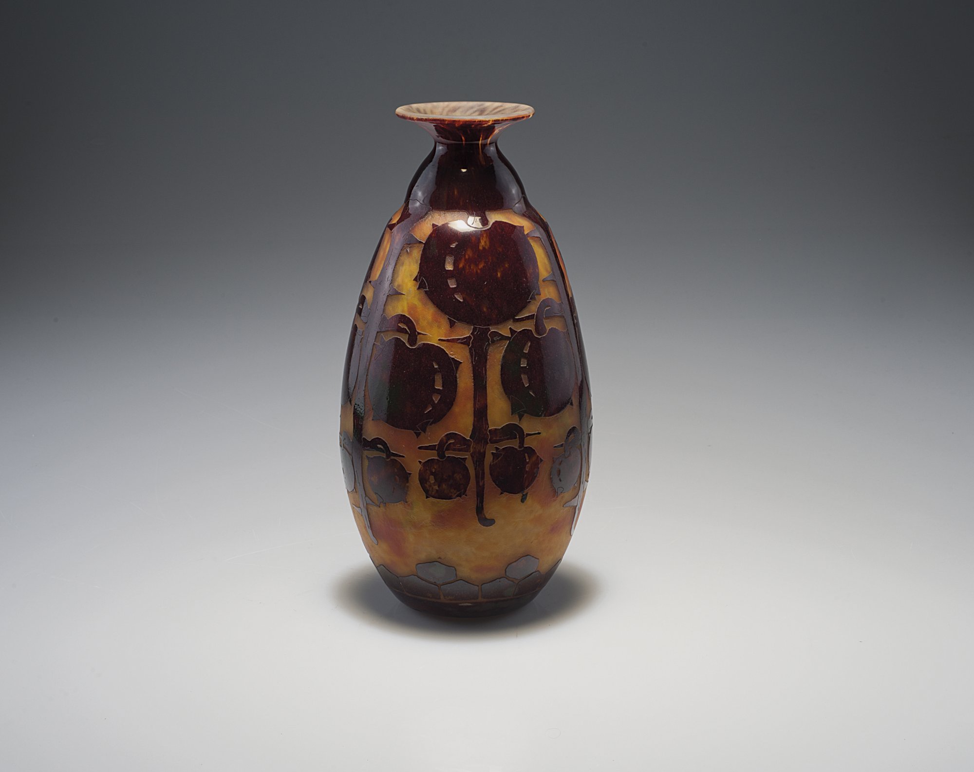 Schneider, Epinay-sur-Seine. 'Marrons' vase, 1922-25. H. 30.6 cm. Clear glass, yellow and orange powder inclusions, purple powder fusions. Multiply etched pattern with chestnuts. Marked: Le Verre Français.
