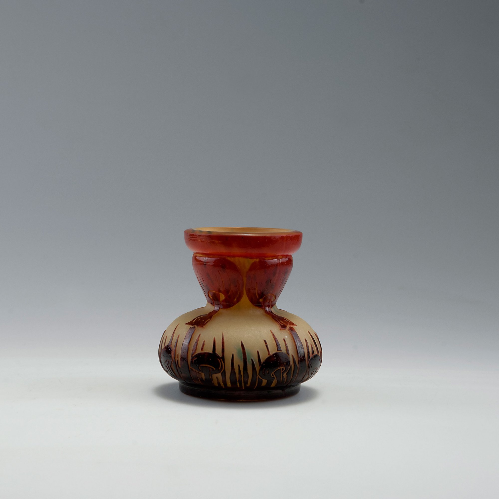 Schneider, Epinay-sur-Seine. Small 'Coprins' vase, 1923-26. H. 8 cm. Cased glass, clear, yellow and blue powder inclusions. Purple and red enamel fusions. Multiply etched pattern. Signed: Le Verre Français.