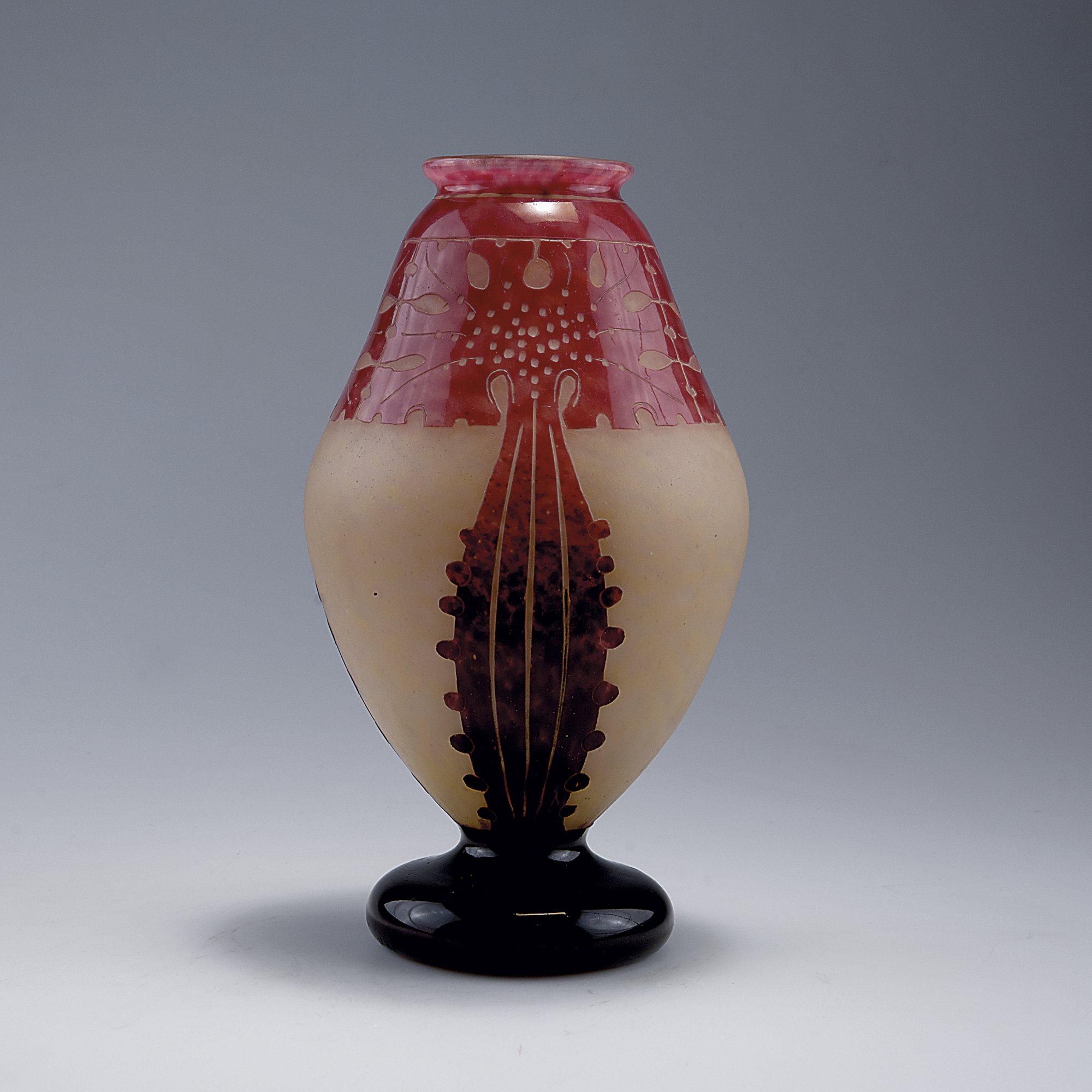 Schneider, Epinay-sur-Seine. 'Amarantes' vase, 1923-26. H. 28.5 cm. Cased glass, clear, milky white and pale yellow powder inclusions, pink and deep purple enamel fusions. Multiply etched pattern. Not signed.