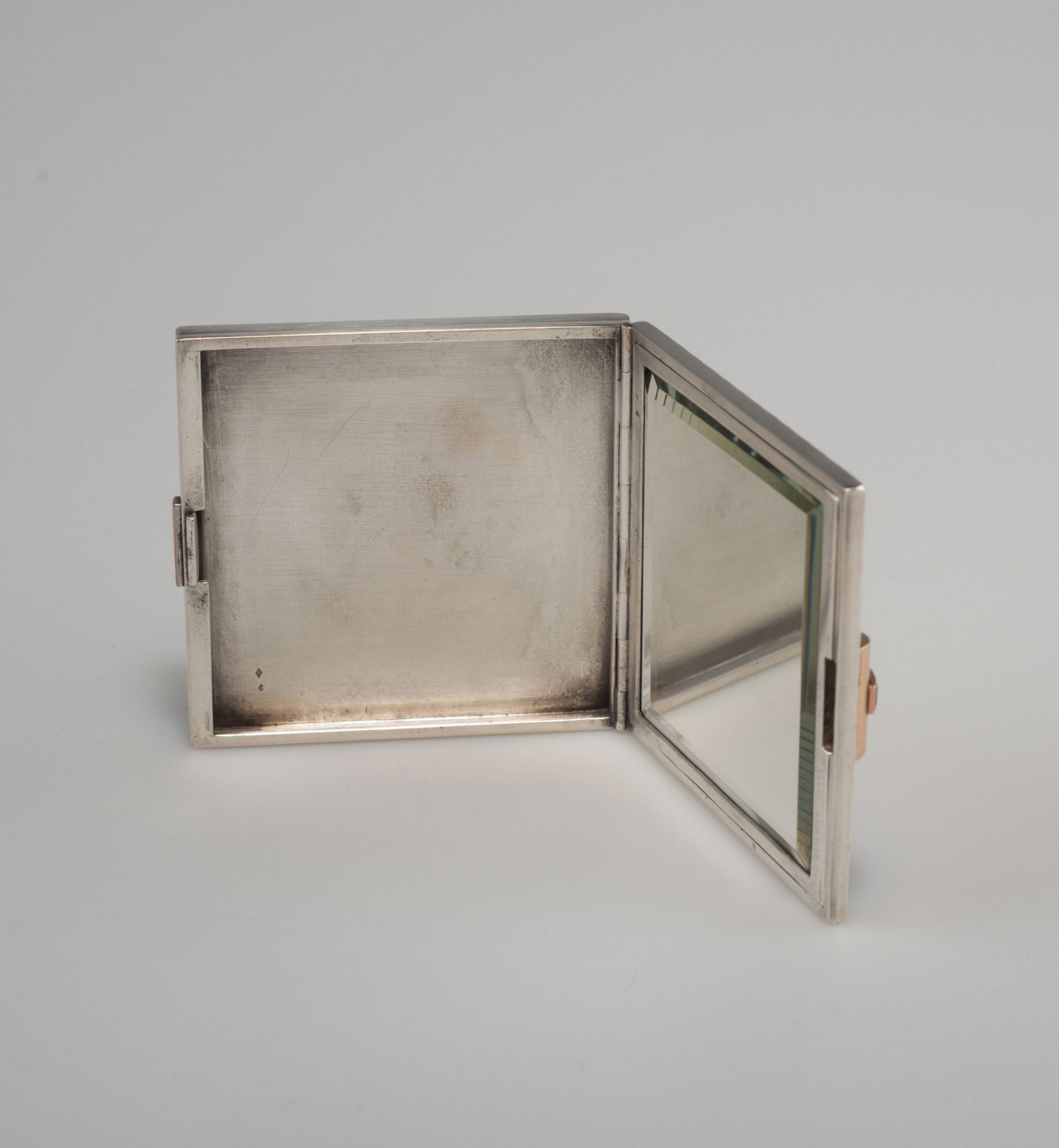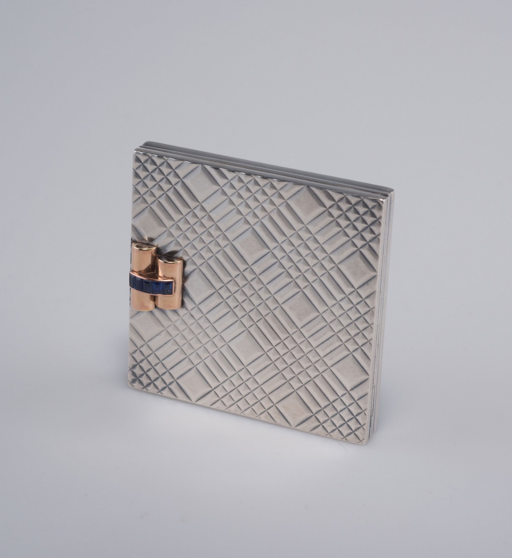 André Schwob. Compact, c1925. 6.7 x 6.6 cm. Silver, yellow gold, sapphires, cut plate glass. Marked: ANDRE SCHWOB, maker's mark in a lozenge, boar's head.