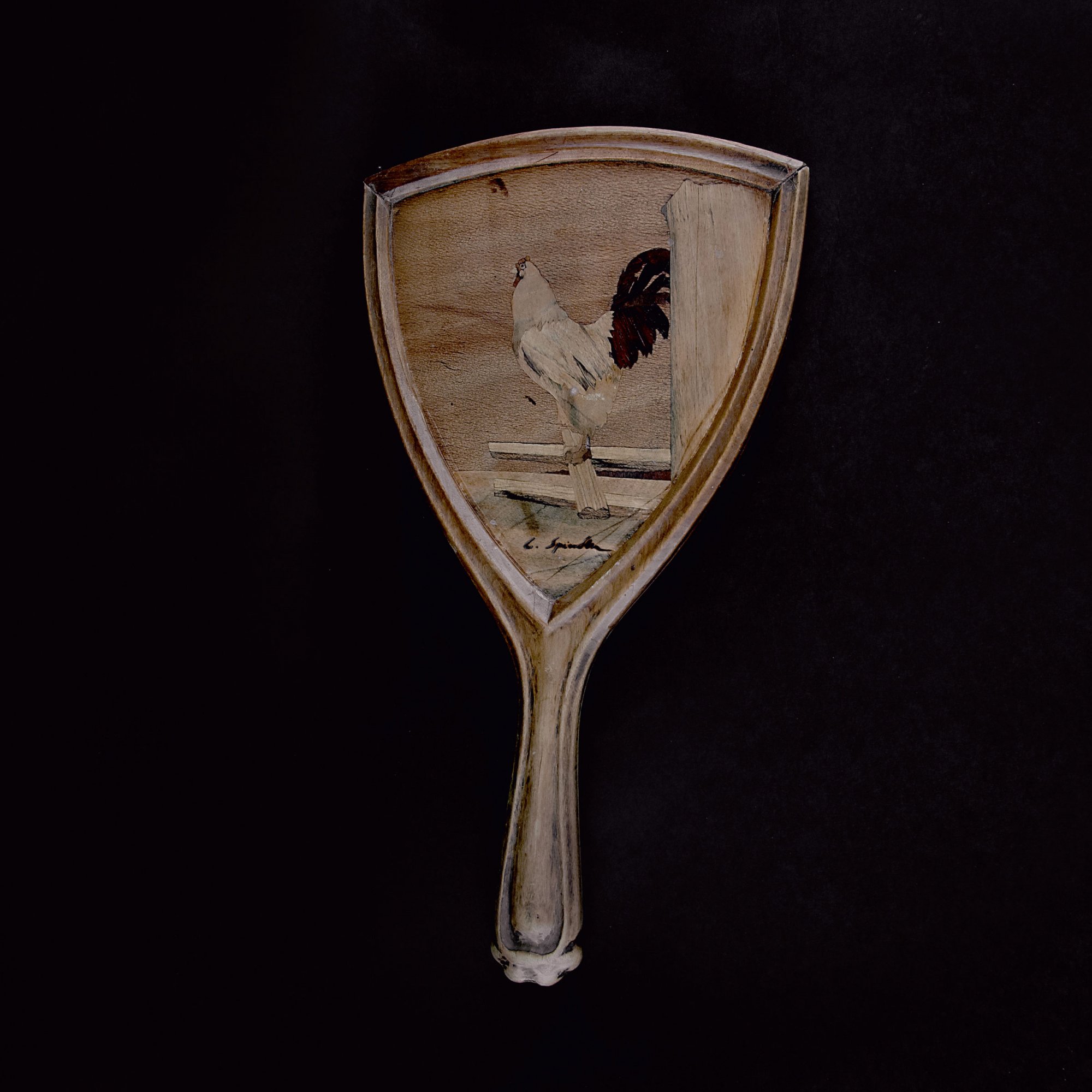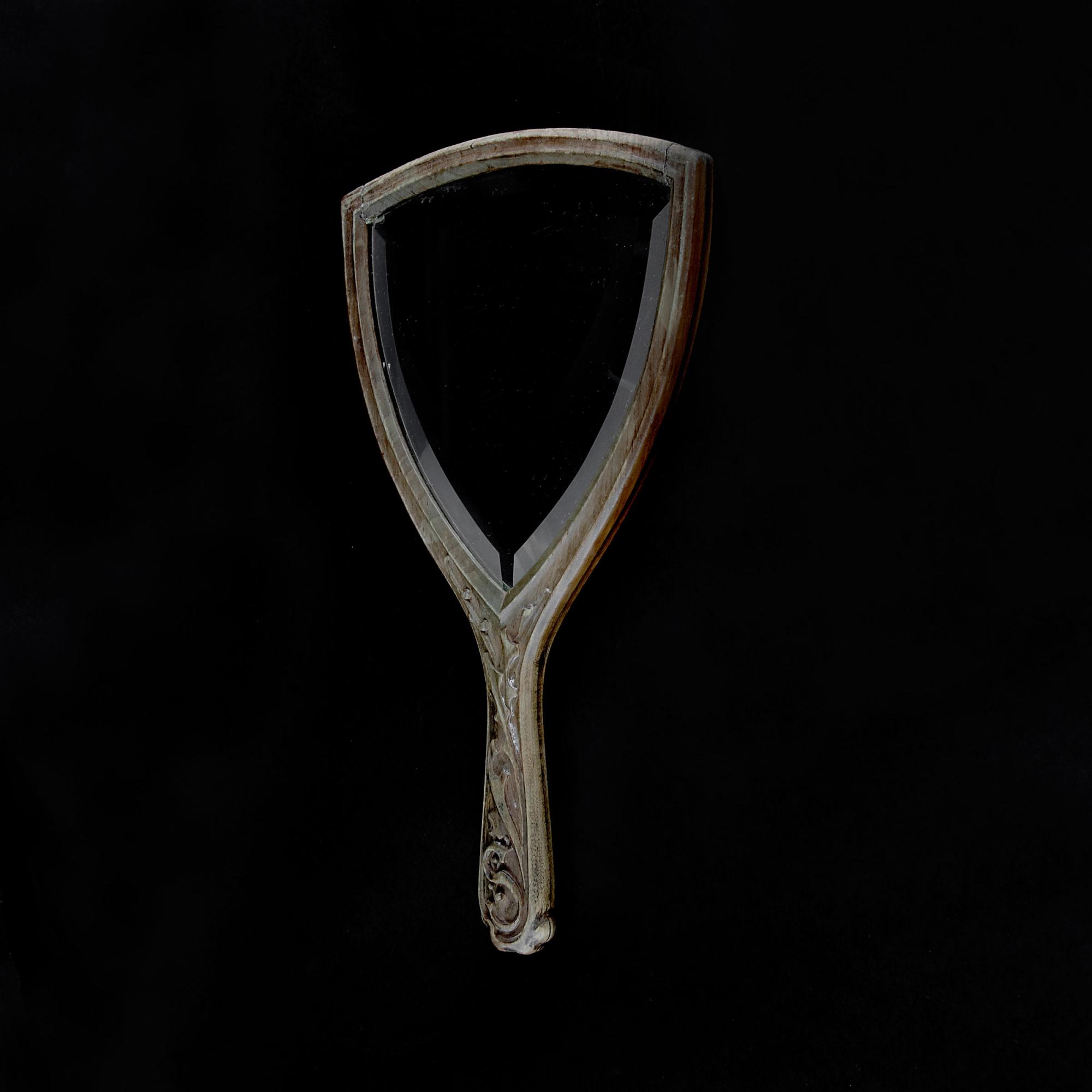 Charles Spindler. Handheld mirror, c1900. 28 x 15.2 cm. Carved wood, inlaid veneers. Cut plate glass. Marked: C. Spindler.