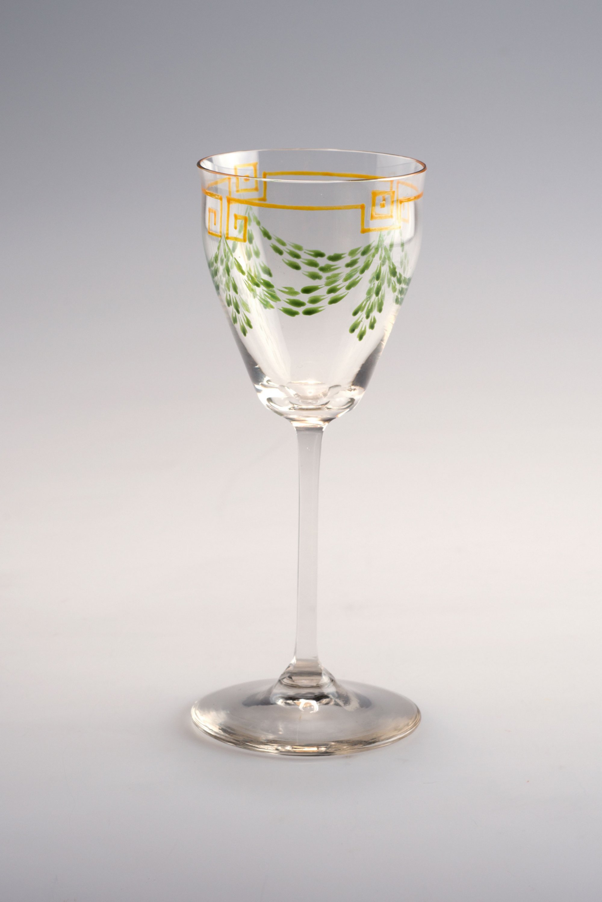 Theresienthal. '1719' wine glass, pattern '1830', c1904. H. 16 cm. Clear glass, enamel green and yellow.