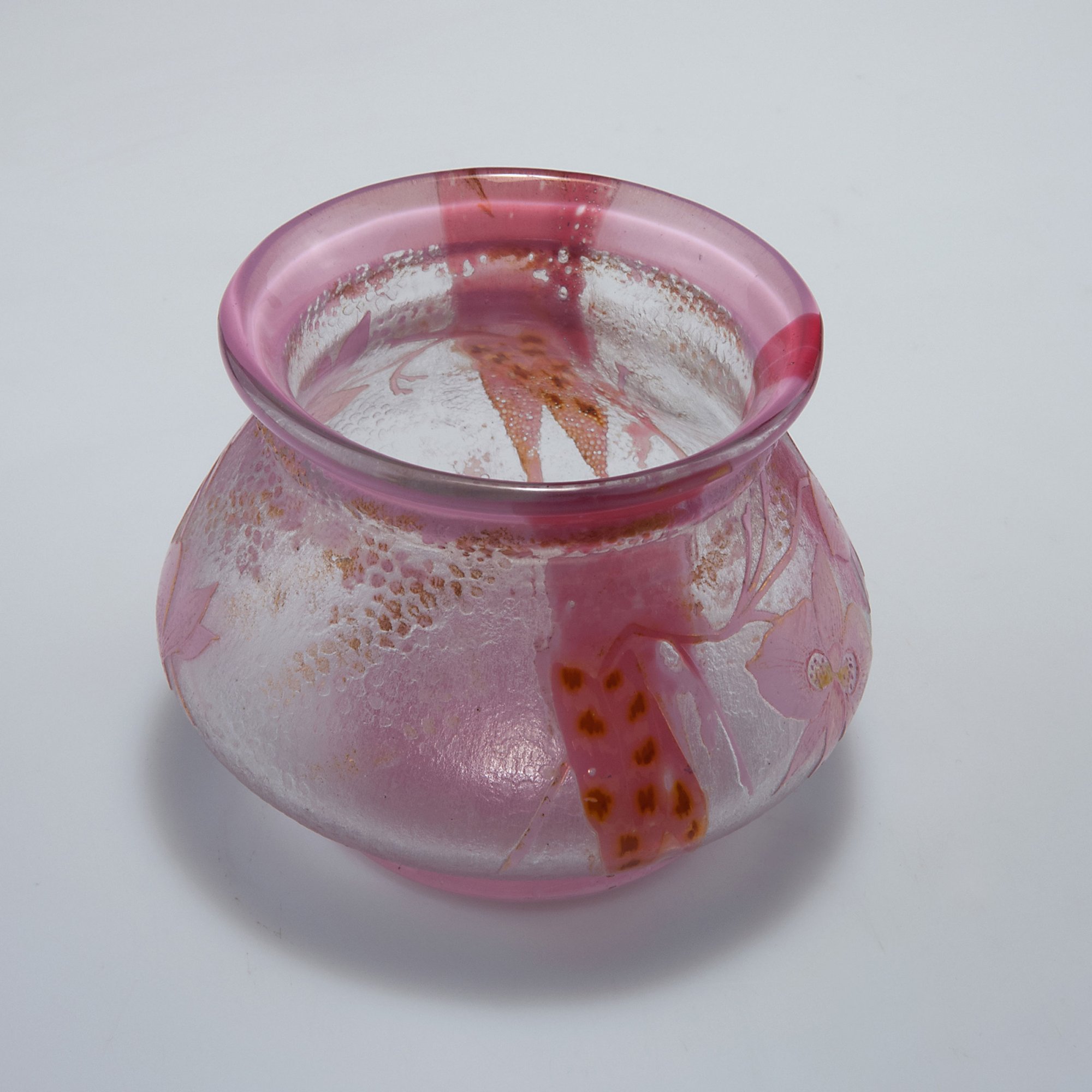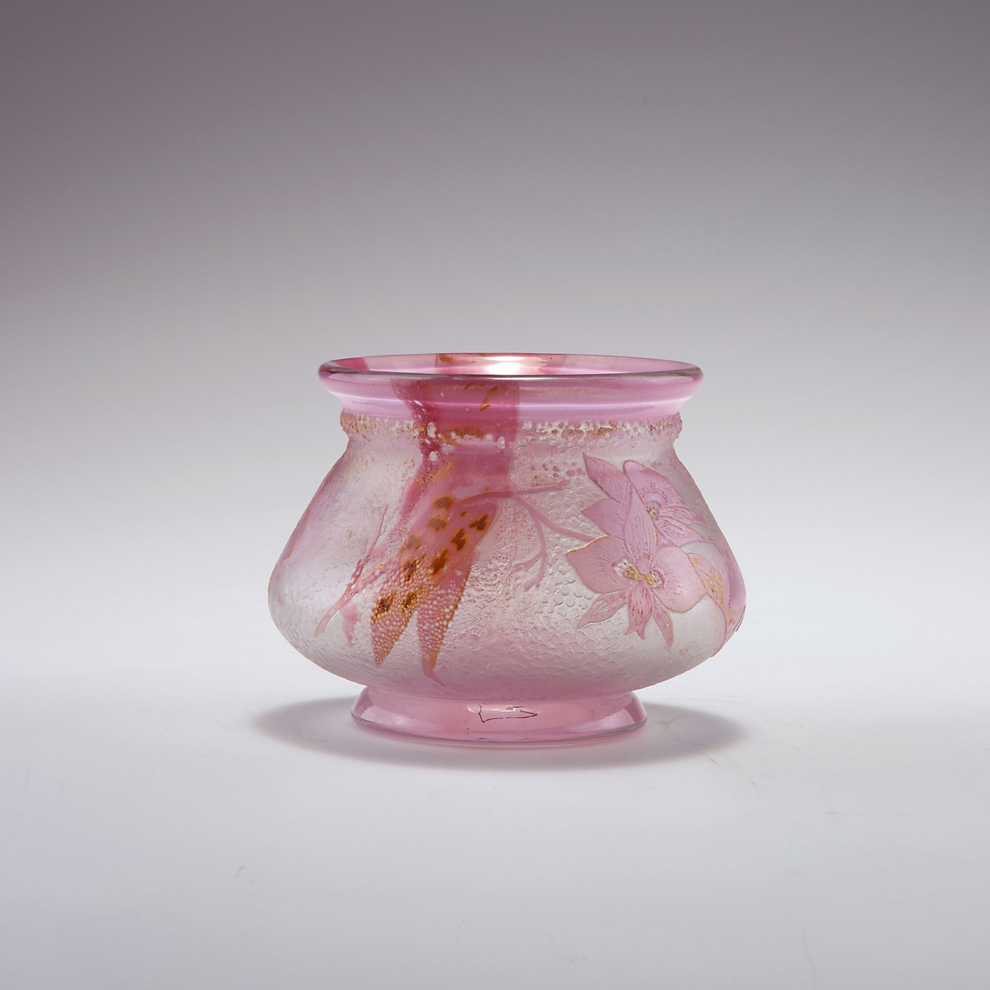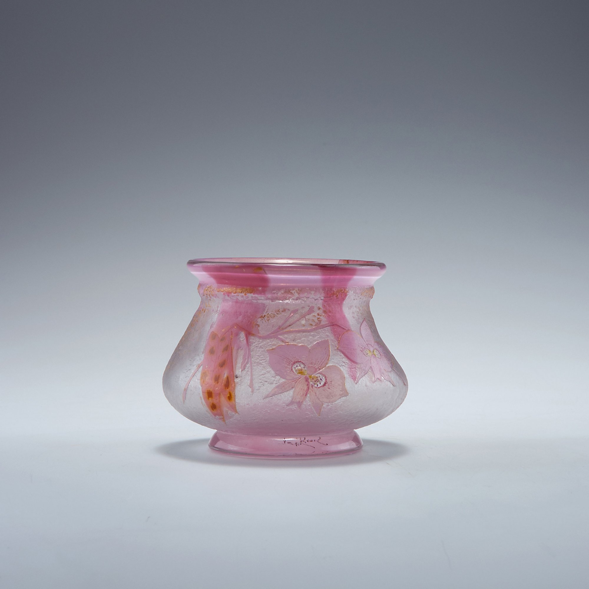 Verreries Réunies de Vallerysthal et Portieux. 'Orchidées' vase, c1900. H. 9.3 cm. Cased glass, clear, milky opalescent and pale pink. Two pink applications. Pattern with orchid panicles, part yellow and gilded on rough ground. Signed: Vallerysthal, orchid flowers.