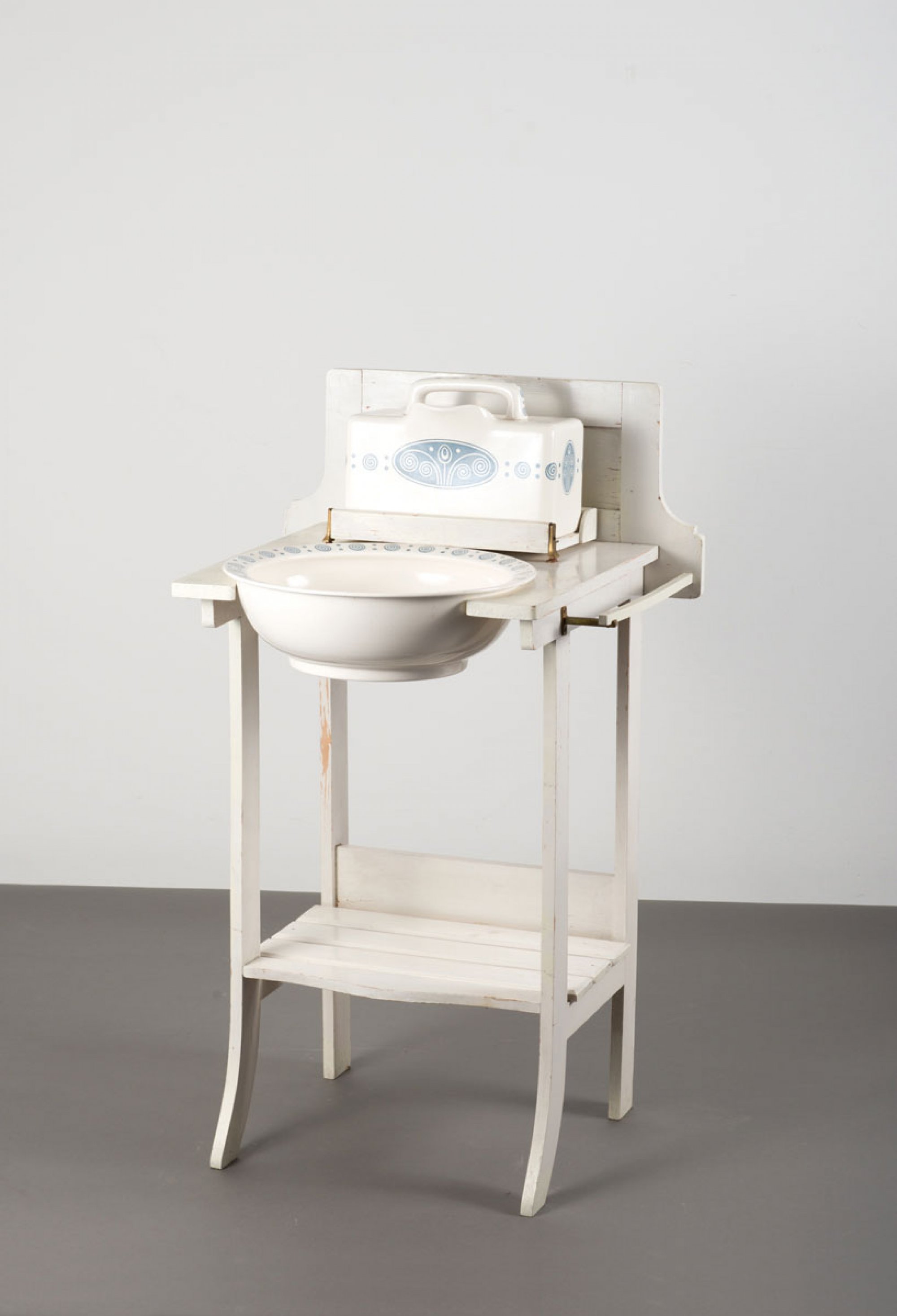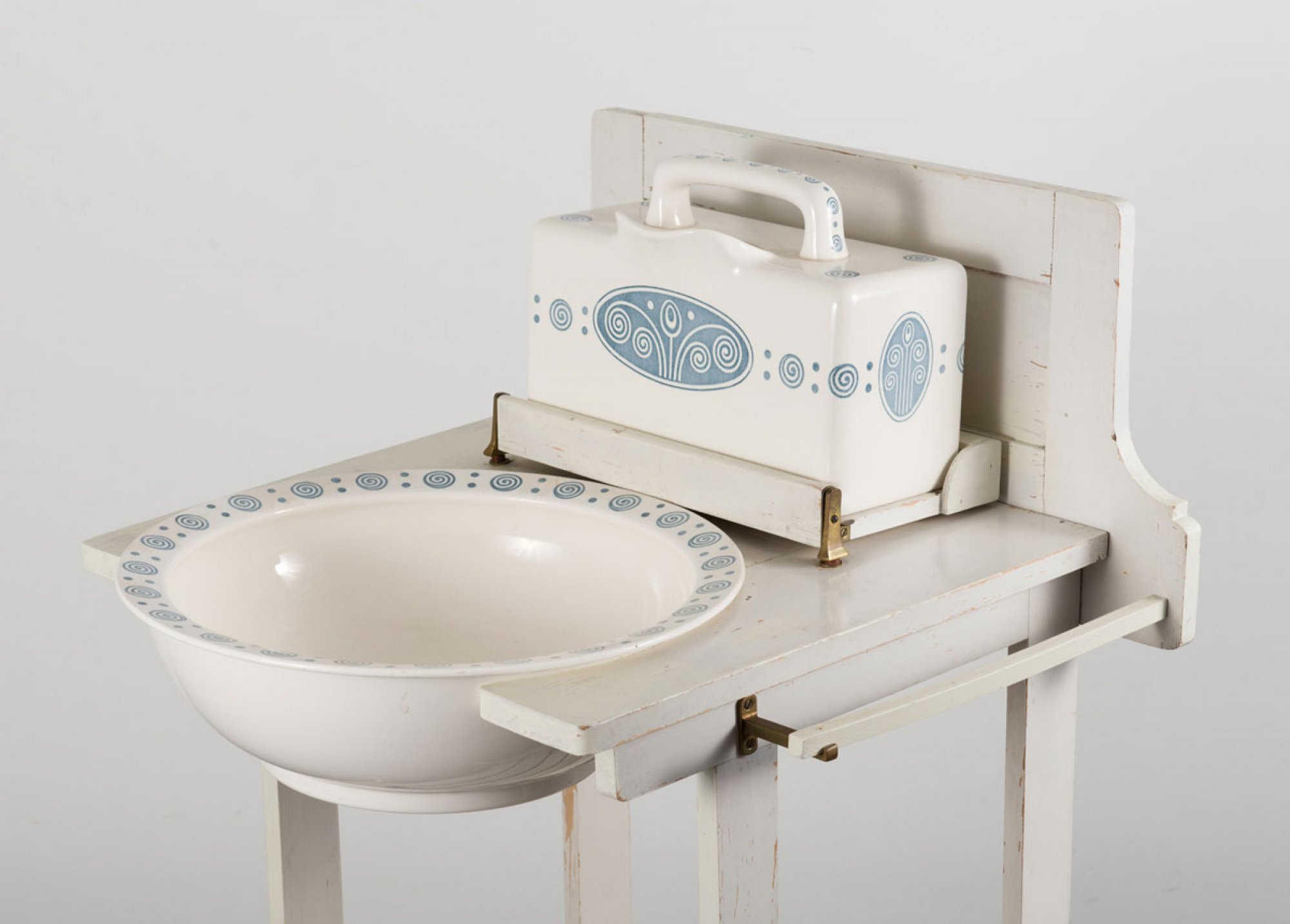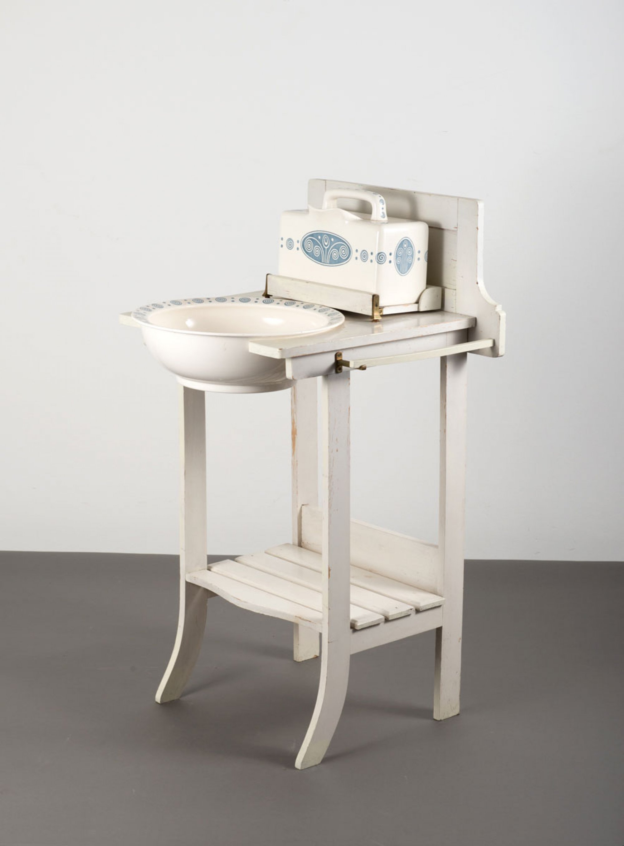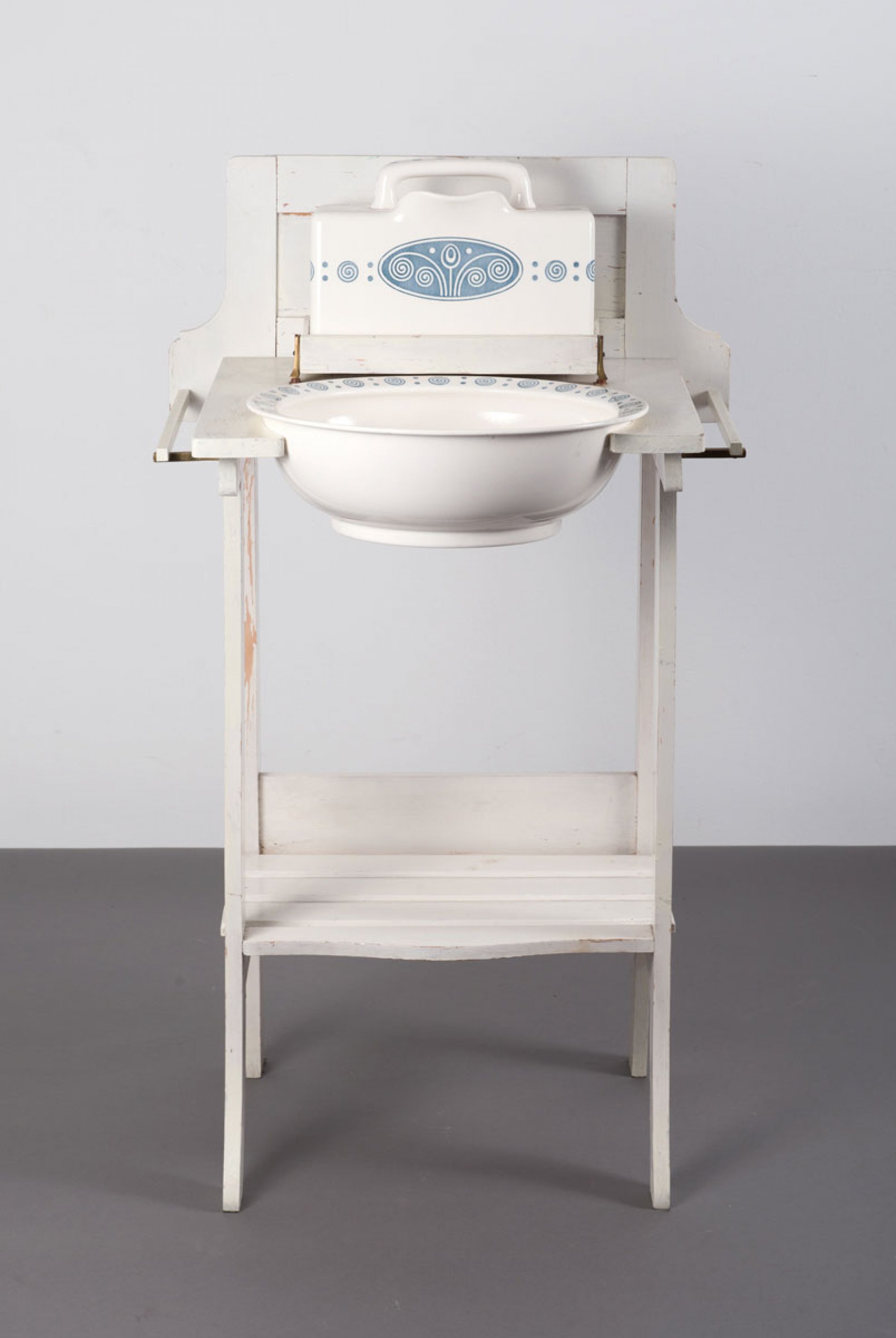 Joseph Maria Olbrich (surroundings). Washstand, c1905. H. 103.5 cm; 60 x 64 cm. Wood, painted white. Sink and jug of earthenware by Wächtersbach. Blue pattern. Marked: Maker's mark DECOR DEPOSE.