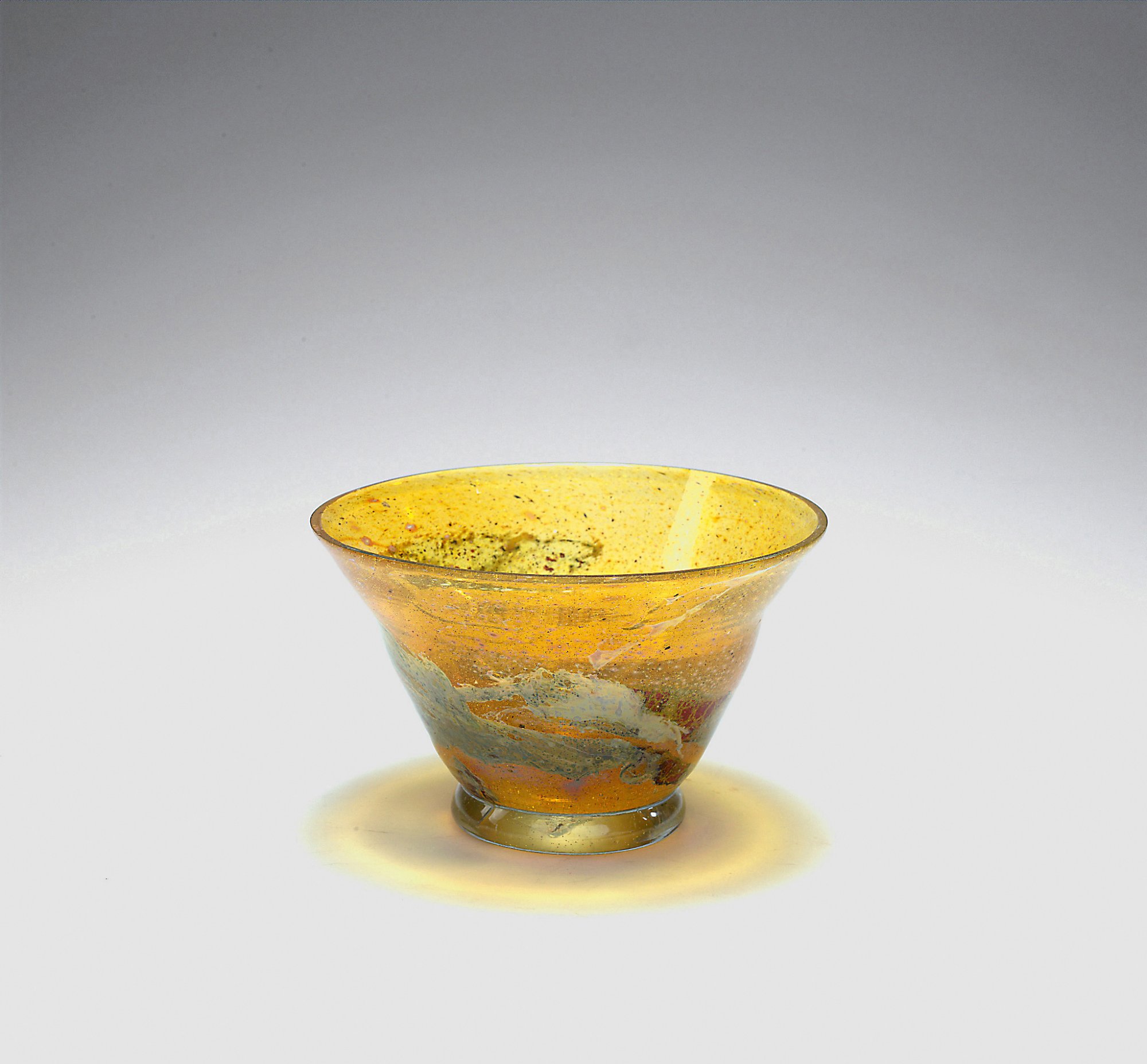 WMF, Geislingen. 'Ikora' bowl, c1937. H. 8.7 cm; D. 13.8 cm. Clear glass, amber powder inclusions, whitish pale blue décor, burst red metal foil.