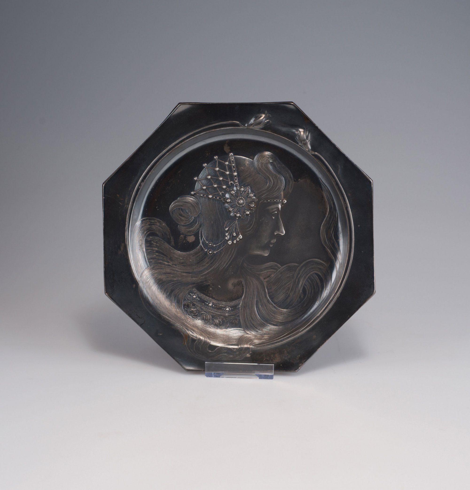 WMF, Geislingen. Decorative plate, c1900. D. 23.4 cm. Silver-plated pewter. Not signed.