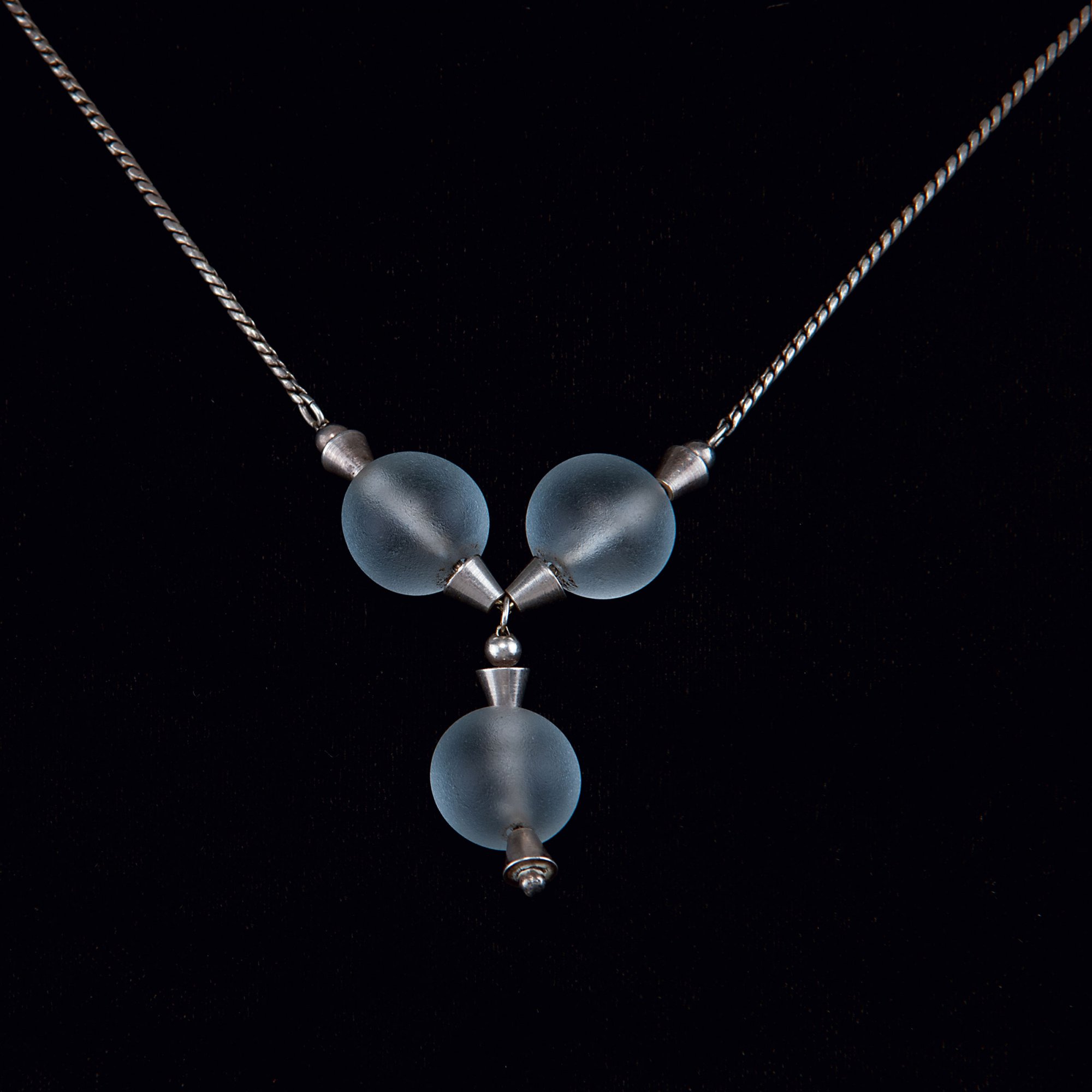 WMF, Geislingen. 'Myra' necklace, c1930. L. 44.5 cm. Silver-plated metal, three 'Myra' beads, clear, iridescent.
