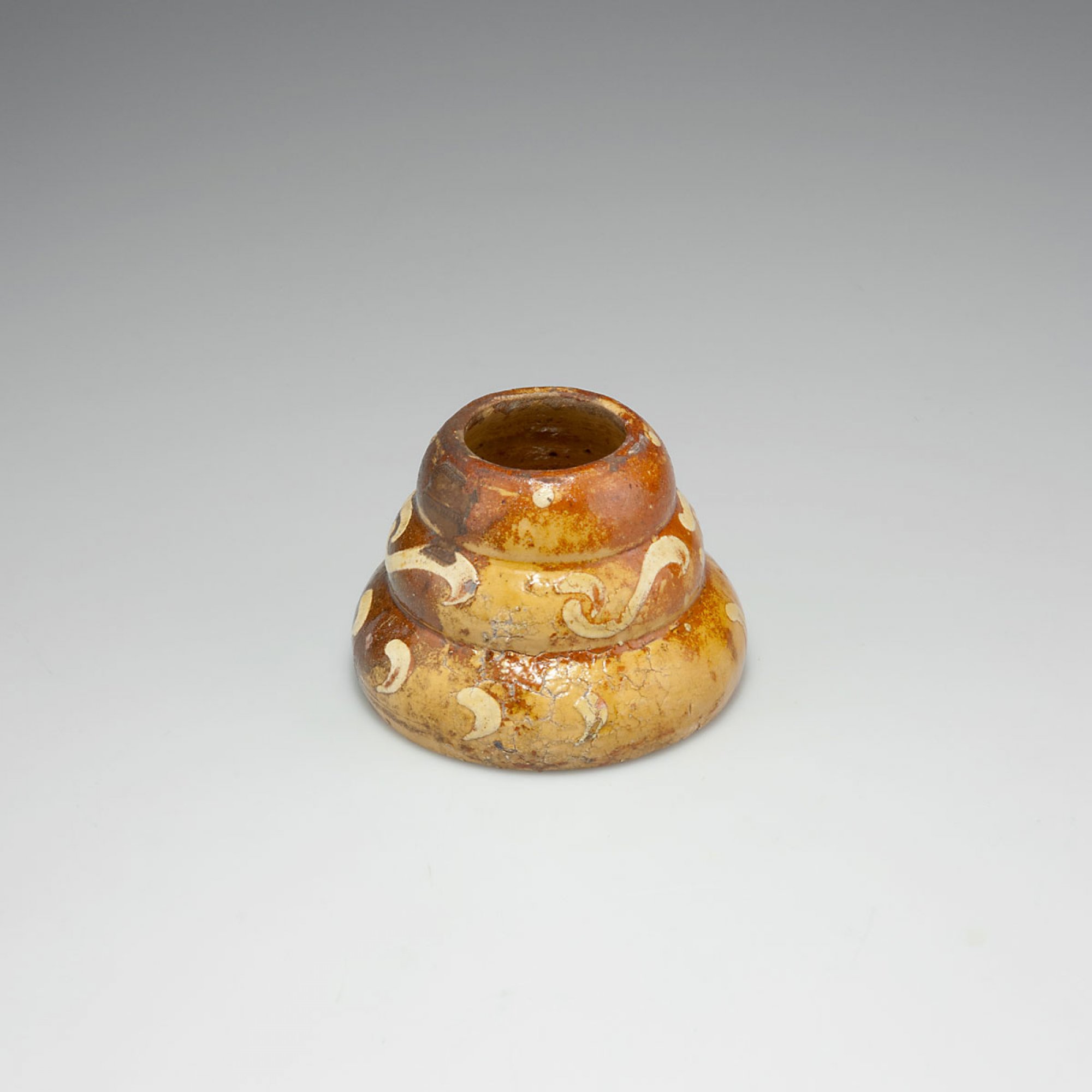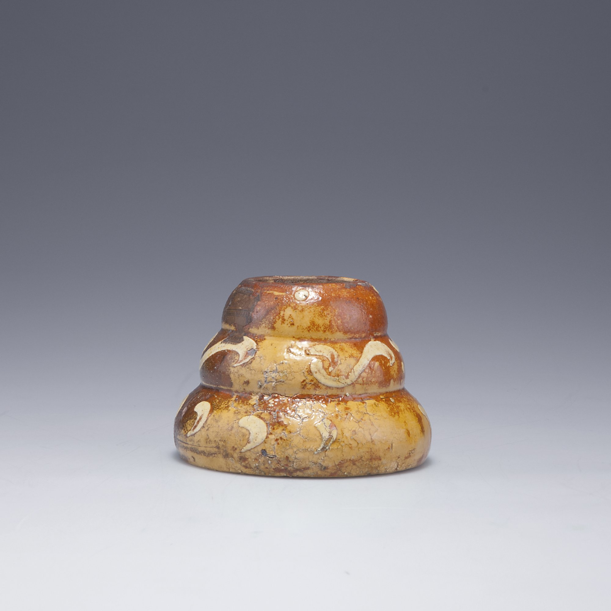 Alfred William Finch. Small vase, c1896/97. H. 8.2 cm. Majolica, glazed yellow and brown, crème-white slip glaze. Signed: A. W. F., remains of an original paper label.