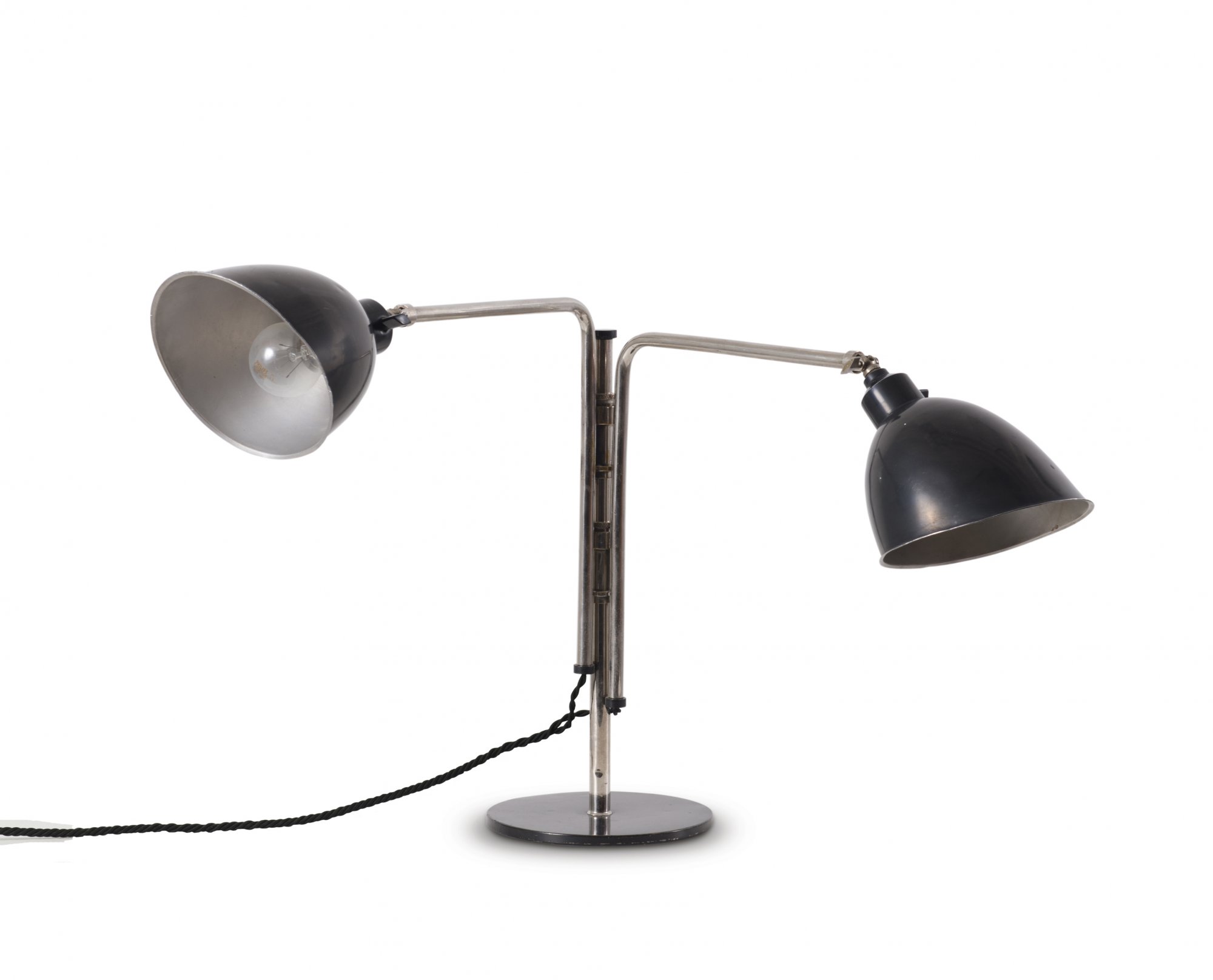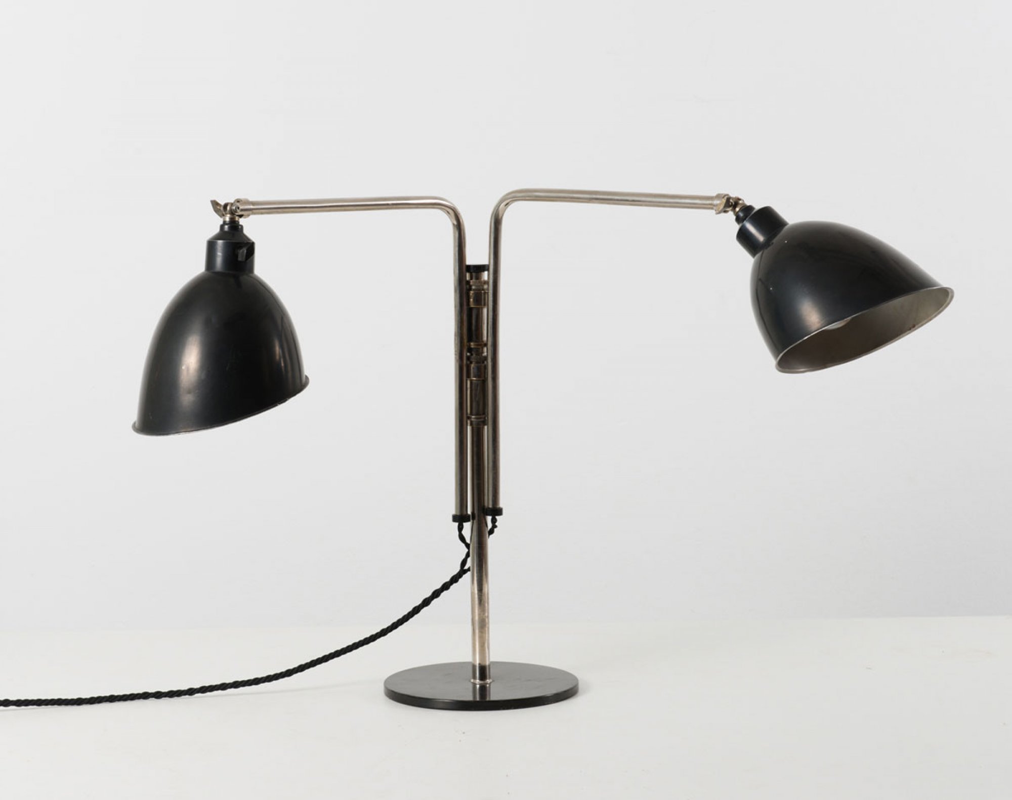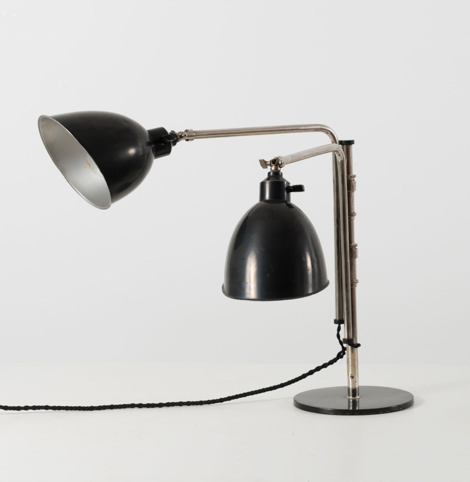 Christian Dell. Rare table light with two shades, 1927/28. H. 49 cm (max.); shade: 16 x 15 cm. Made by Rondella, Oberursel. Nickel-plated tubular brass, sheet brass, painted black, black bakelite, iron plate.