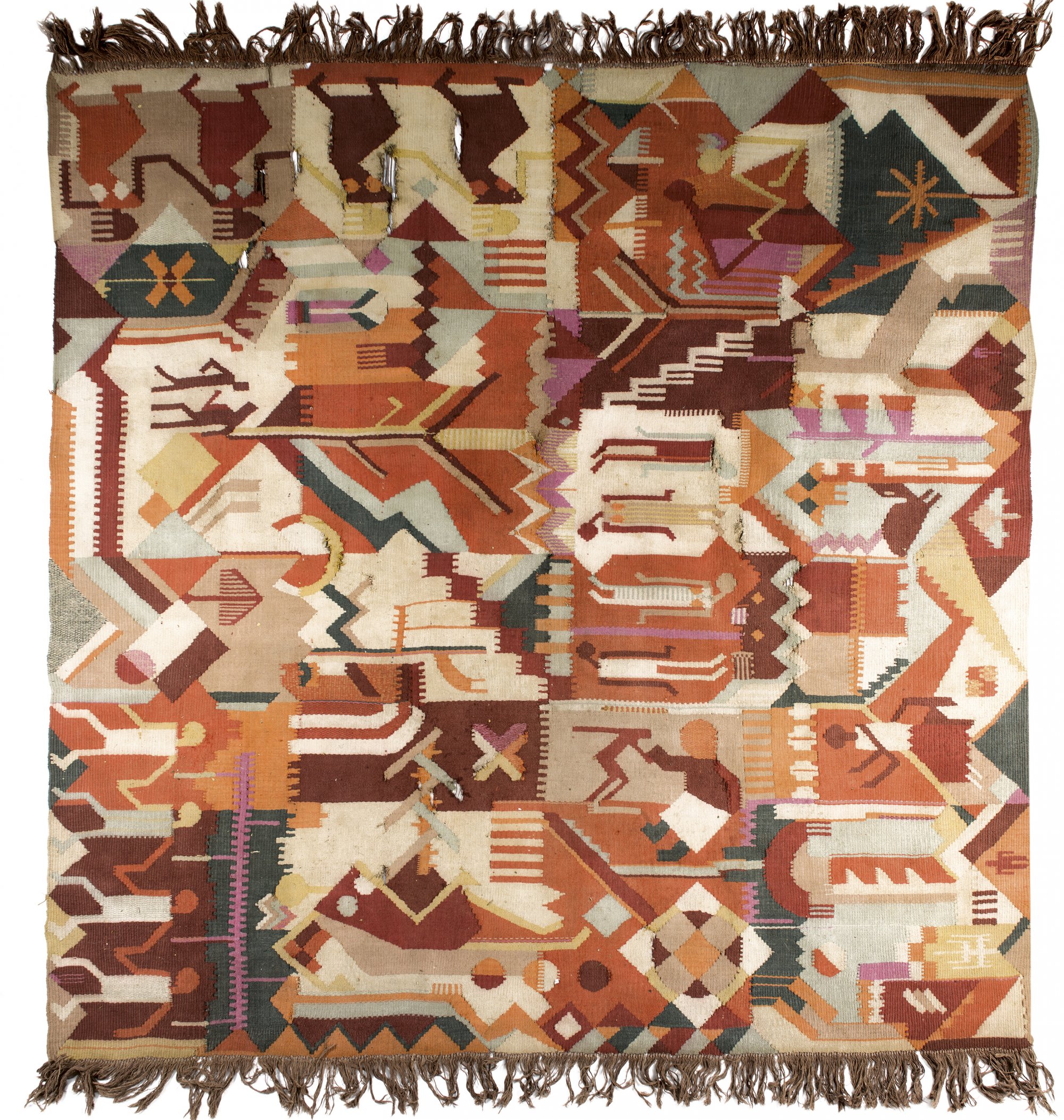 'One of the most important designs of Heckemann' wrote Horst Dauer about the carpet in his essay on the weaving department of Bauhochschule Weimar. The carpet was custom-made for Dr. Kurt Luthmer, most probably a collaboration between Hedwig Heckemann and Prof. Ewald Dülberg. The figurative motifs reveal a personal connection between the patron and Dülberg. Depicted are, among others, Dr. Luthmer and Prof. Dülberg having a conversation, his daughter holding a doll, and Hedwig Heckemann herself. Heckemann and Dülberg had been working together at the Art Academy Kassel. From 1924 onwards, they had presided over the weaving department of the Bauhochschule Weimar. The carpet had been made in their last year in Kassel. Heckemann and Dülberg got their influence from the late expressionism. The carpet shows first features of Heckemann's and the Bauhochschule's later popular style with its geometrical precision using triangle, rectangle and square. Provenance: The carpet has always been in the family of commissioner Dr. Kurt Luthmer and had been exhibited at Torwache art collection Hesse Kassel since 1976.