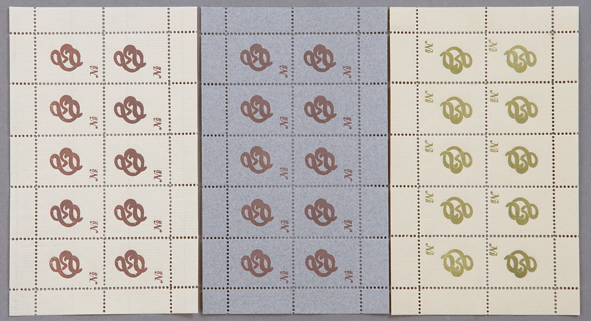 Henry van de Velde. Three sheets of paper with collection labels for Curt and Sophie Herrmann, c1906. 8.7 x 14.4 cm. 10 labels each. Print on laid paper, brown on crème-yellow, yellow brown and grey.