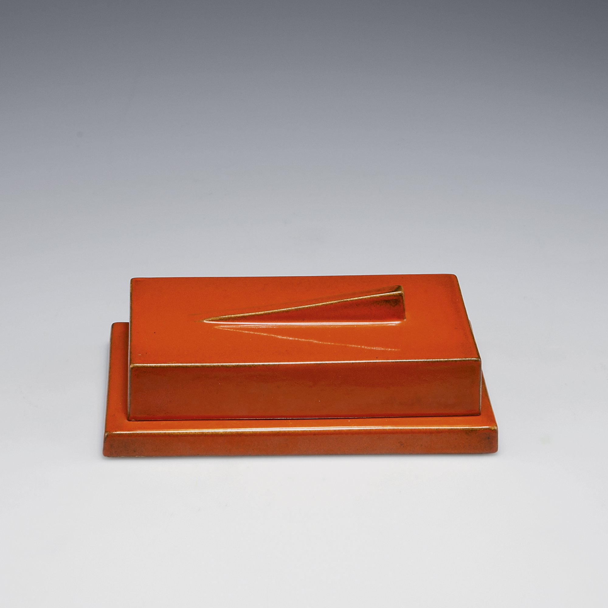 Margarete Heymann-Loebenstein. Cigarette box, c1929. H. 5.7 cm; 18.5 x 11.2 cm. Made by Hael-Werkstätten, Marwitz. Earthenware, glazed uranium red. Marked: Signet of workshop, faint model no.