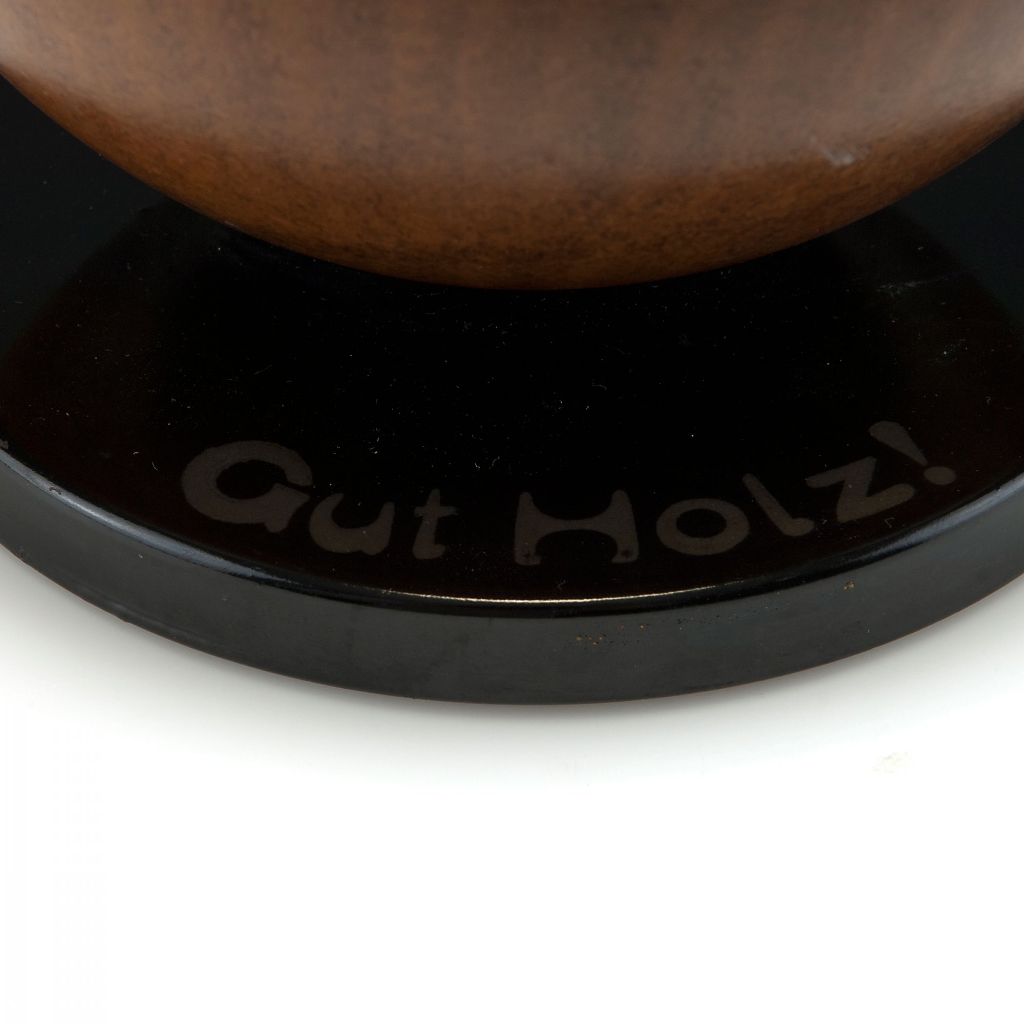 Marianne Brandt. Portable bar in the shape of a ball, 1929-32. H. 19 cm; D. 16.8 cm. Made by Ruppelwerk, Gotha. Sheet metal, painted brown and black, red brown inside. Liquor set, bottle and six glasses, clear glass. Inscribed: Gut Holz!