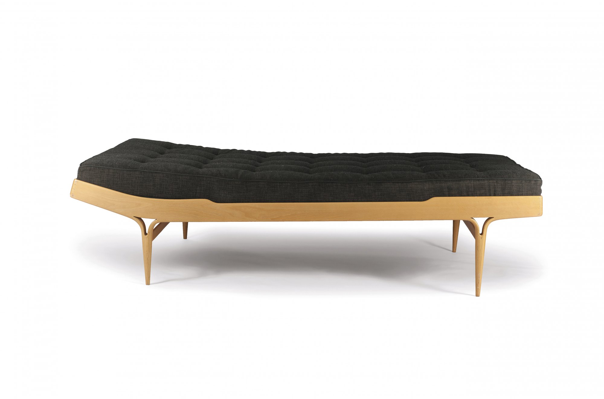 Bruno Mathsson. 'Berlin' daybed, 1957. H. 53 x 201.5 x 127 cm. Made by Karl Mathsson, Värnamo, in 1961. Birch plywood, birchwood, brown/black fabric mattrass. Marked: Maker's mark.