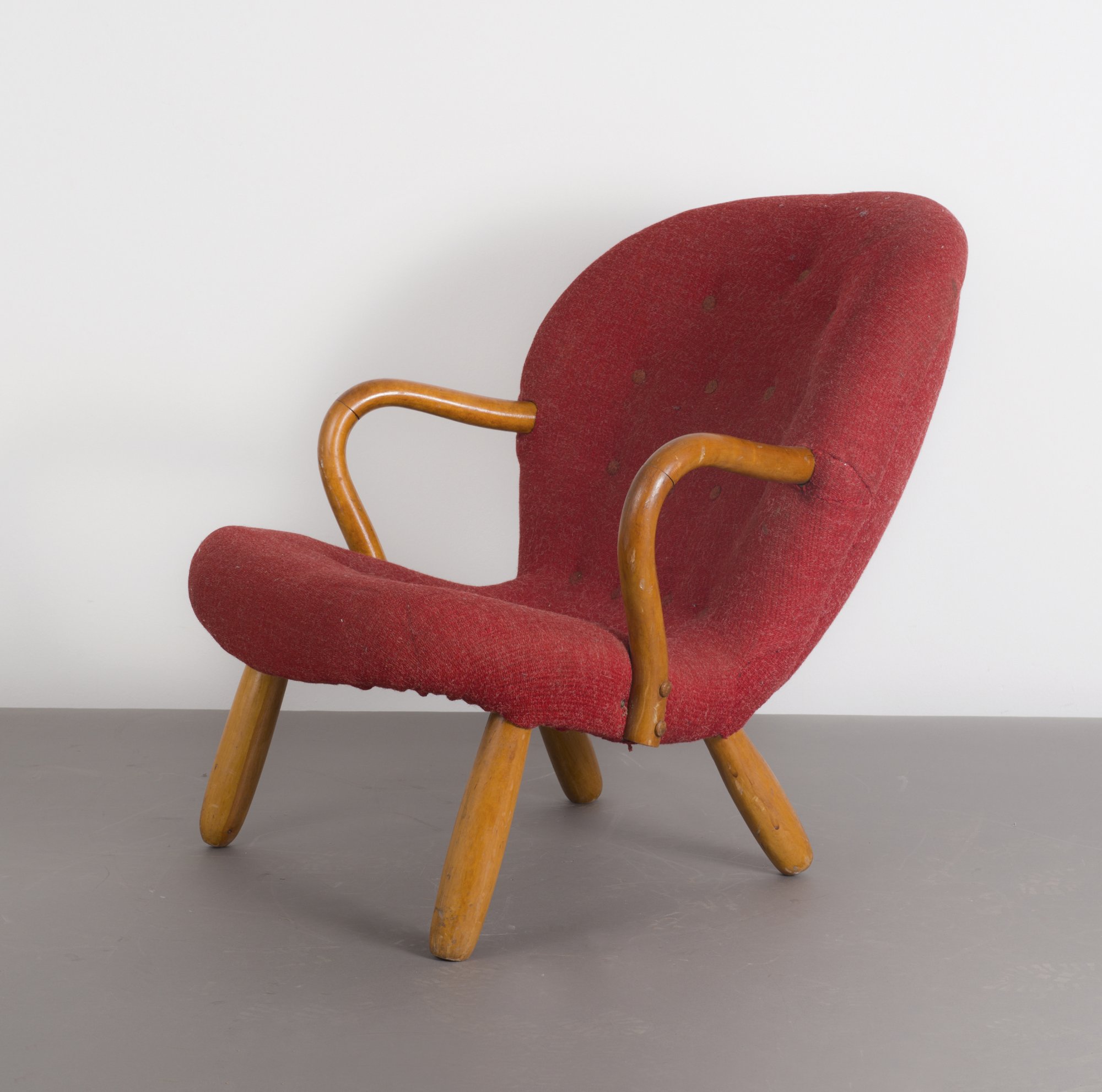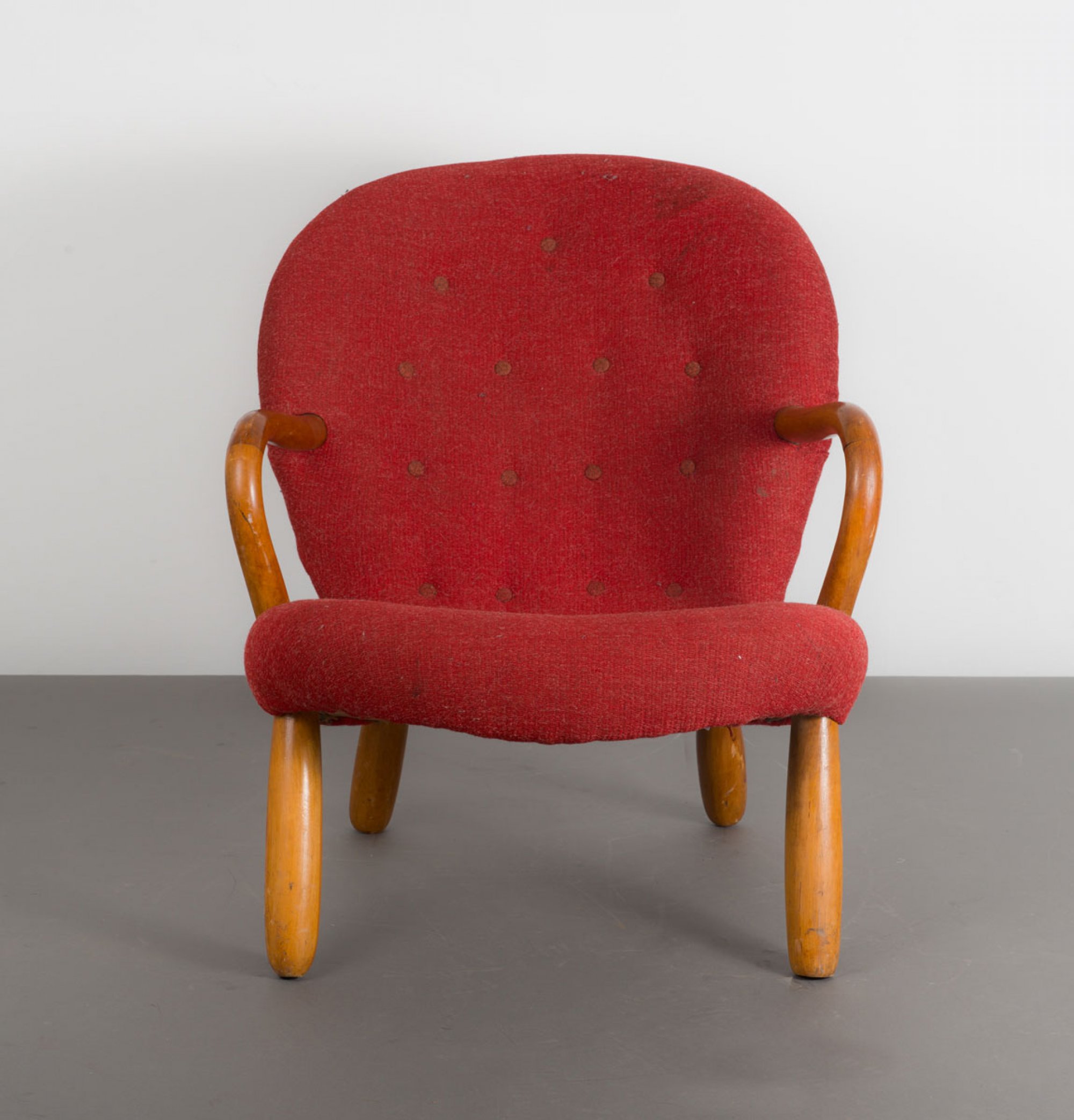 Philip Arctander (attributed). 'Clam chair', 1944. H. 75 x 69 x 91.5 cm. Made by Sune Johanssons Möbelfabrik, Nässjö, Sweden (attributed). Birchwood, red woollen cover.