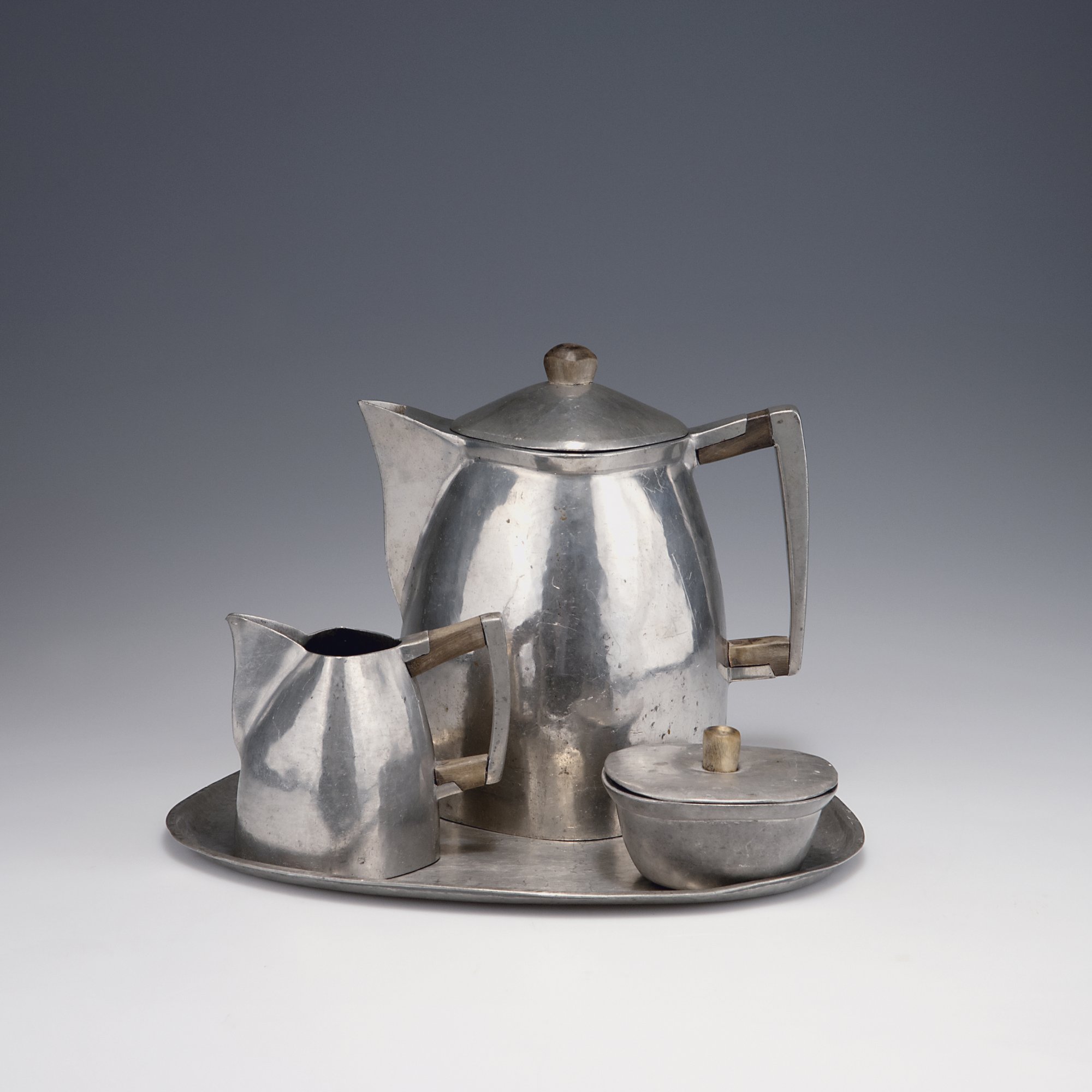Karl Raichle. Coffee set, c1930. Four pieces. Coffeepot, H. 20.4 cm; creamer, H. 10.4 cm; sugar bowl with lid, H. 6.3 cm; tray, 29.2 x 29.6 cm. Pewter, wooden knobs and isolators. Marked: r URACH, ZS2, 5, HANDMADE GERMANY.