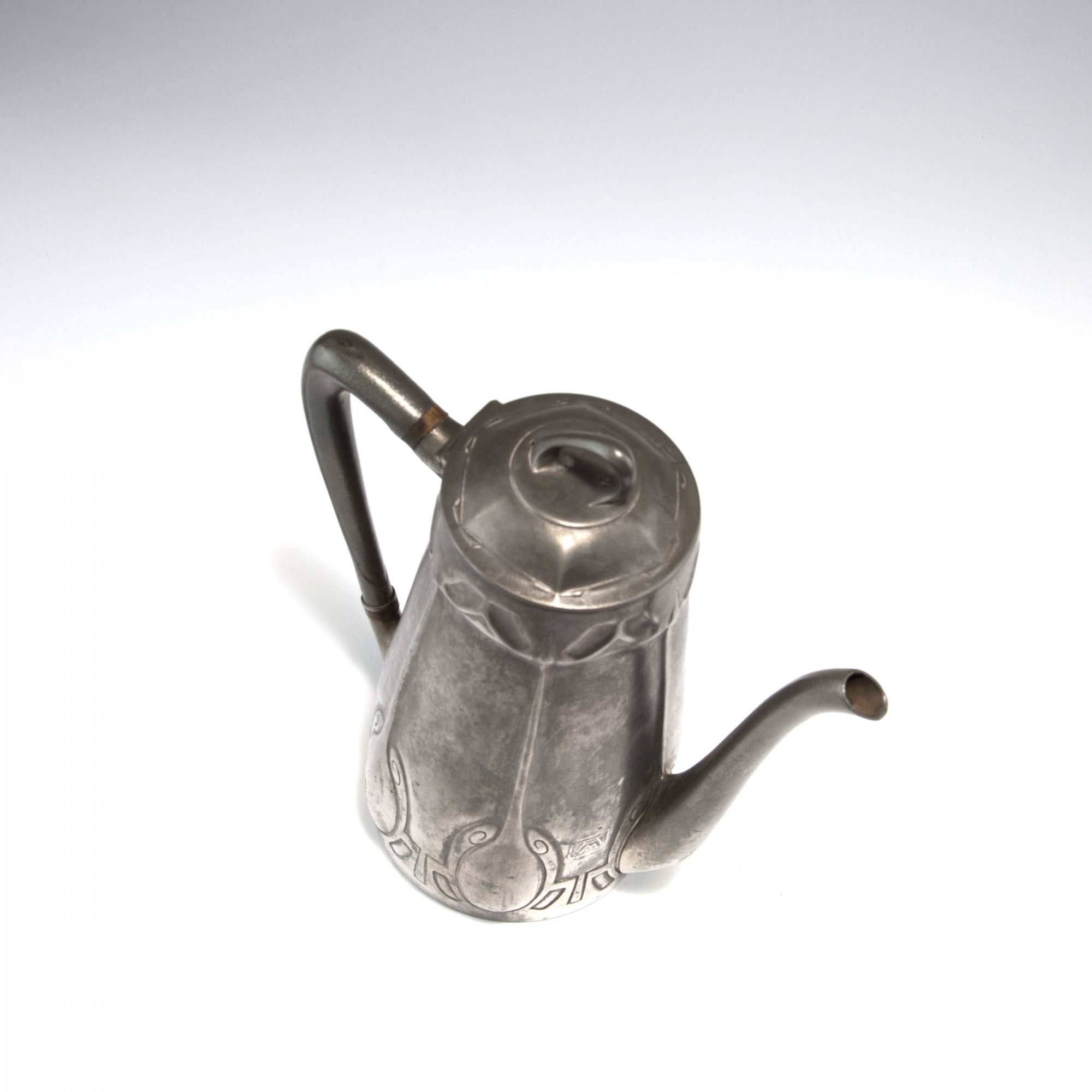 Albin Müller. Coffeepot, 1904/05. H. 22 cm. Made by Gerhardi Co., Lüdenscheid. Pewter, reliefed pattern. Signed: Artist's signet, GERHARDI & CO, 1818, 4.