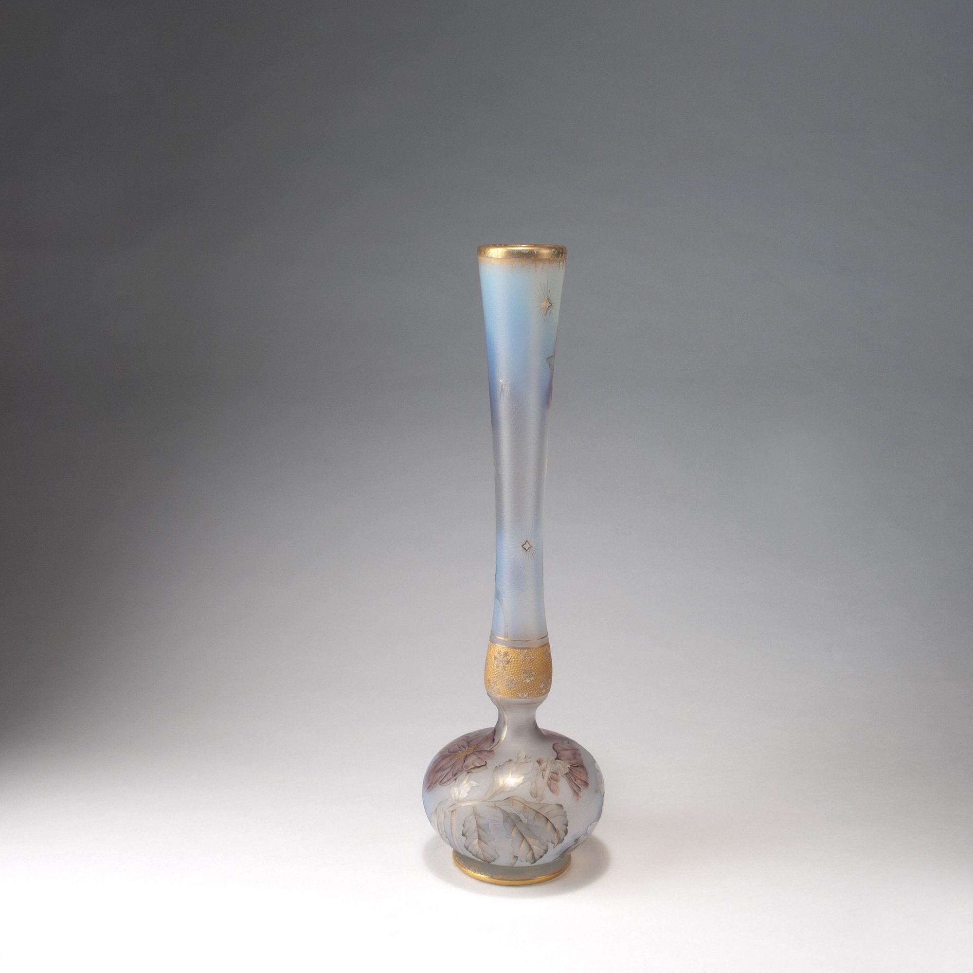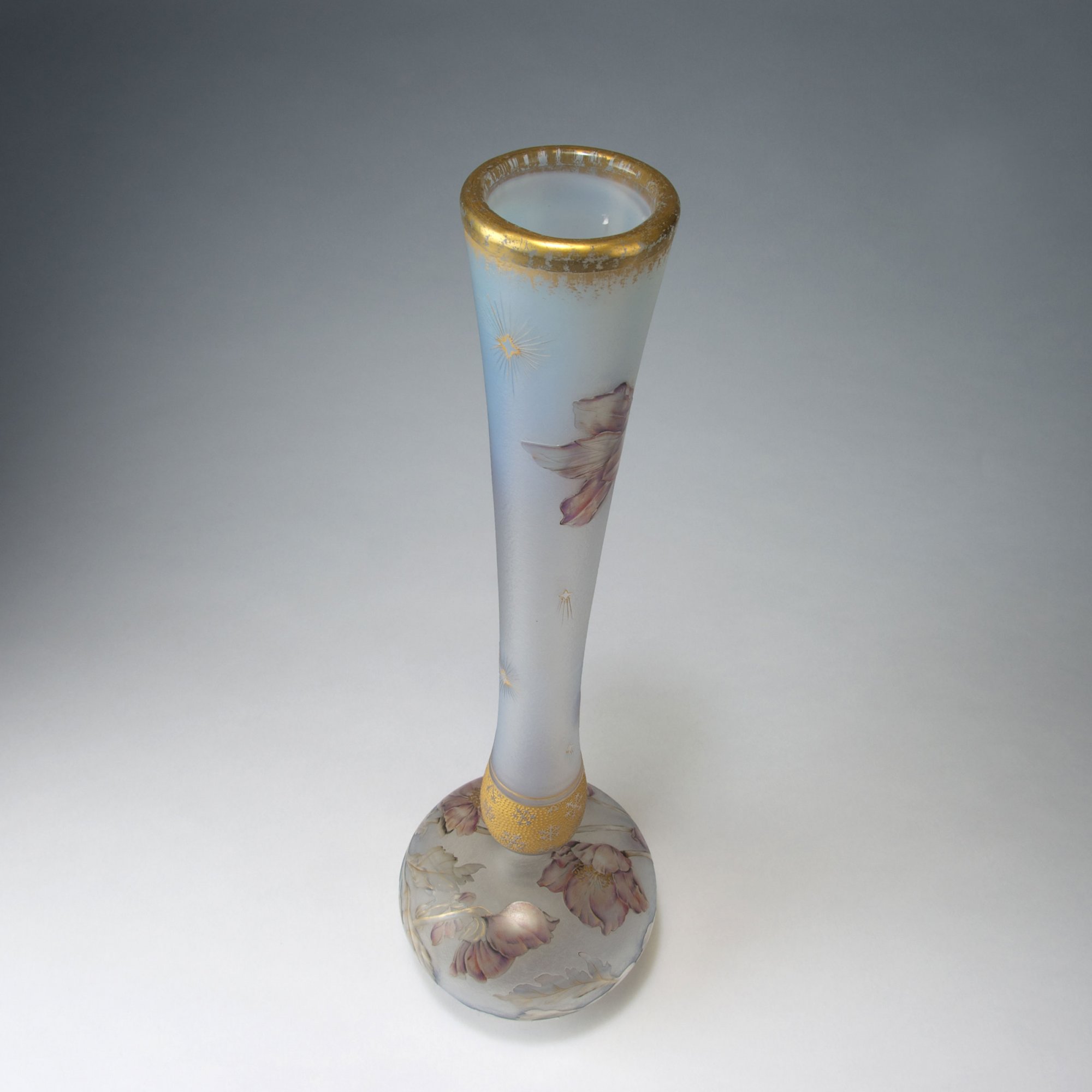Daum Frères, Nancy. Tall 'Anémones' vase. c1898. H. 49 cm. Cased glass, clear, opalescent powder inclusions. Etched and polychromatic enamel, gilded. Easter roses and stars. Frieze with ice crystals. Signed: Daum Nancy, cross of Lorraine.