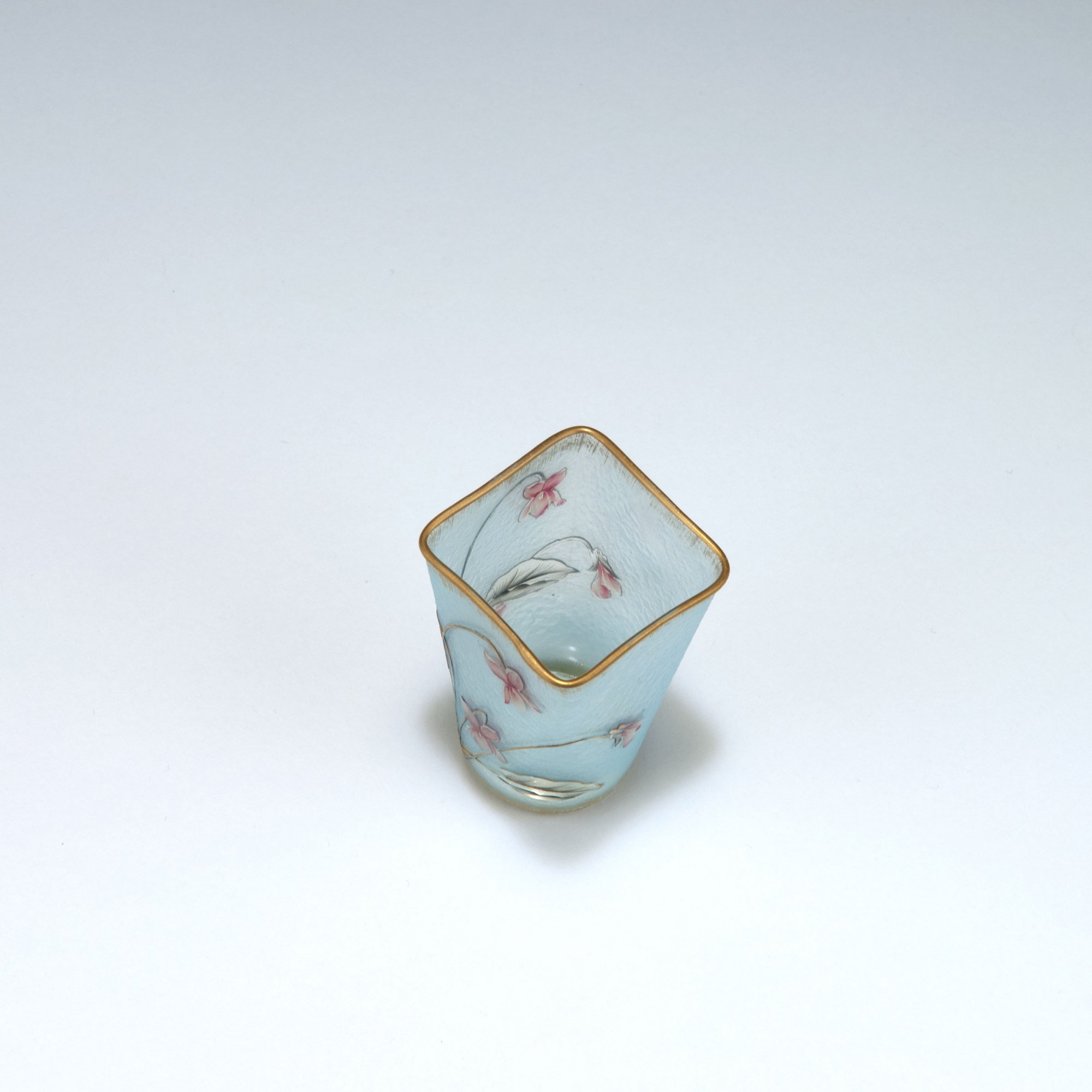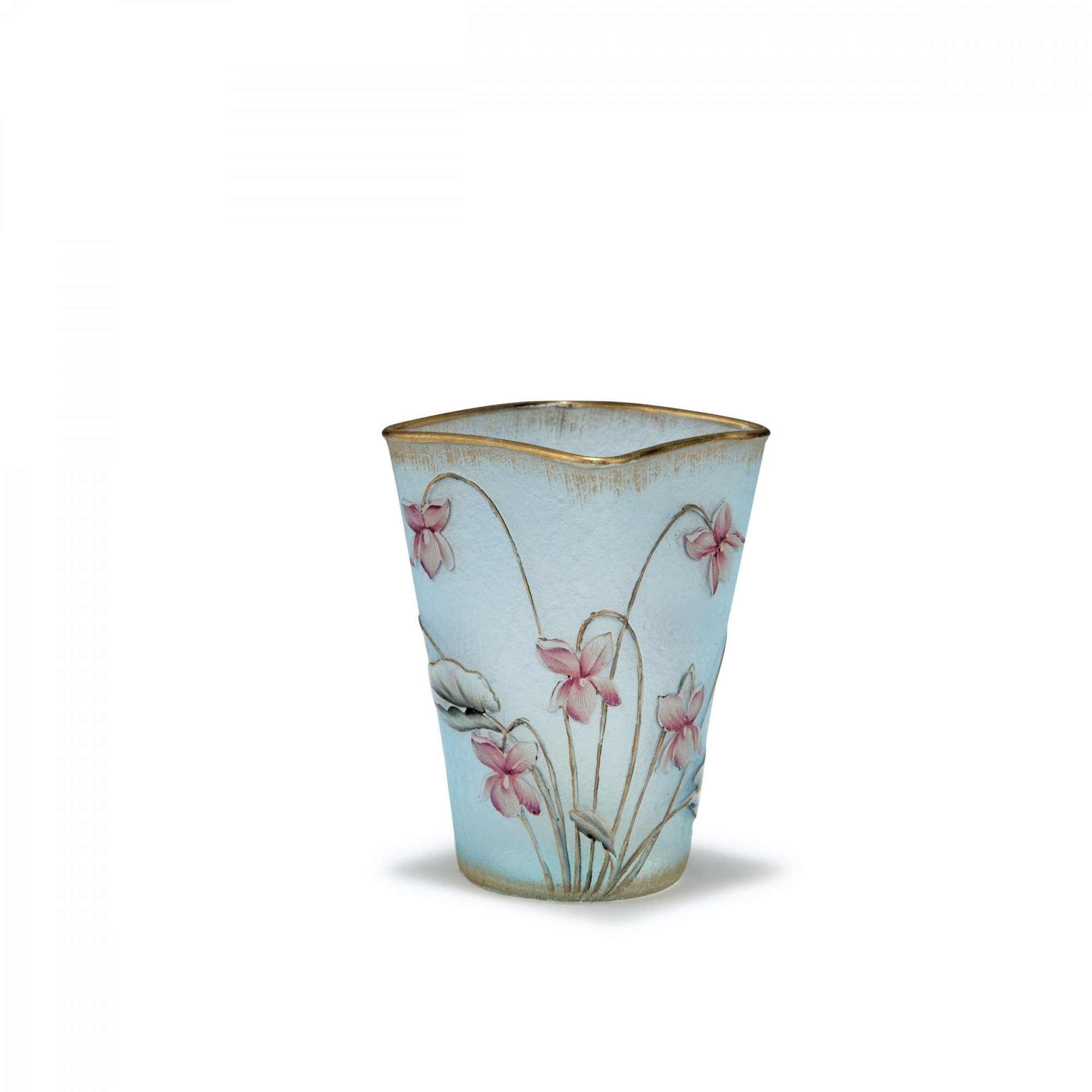 Daum Frères, ancy. 'Pensées' tumbler, c1895. H. 5.6 cm. Cased glass, slightly blue opalescent and clear, etched and enamelled pattern, gold hue. Pansies. Signed: Daum Nancy, cross of Lorraine.