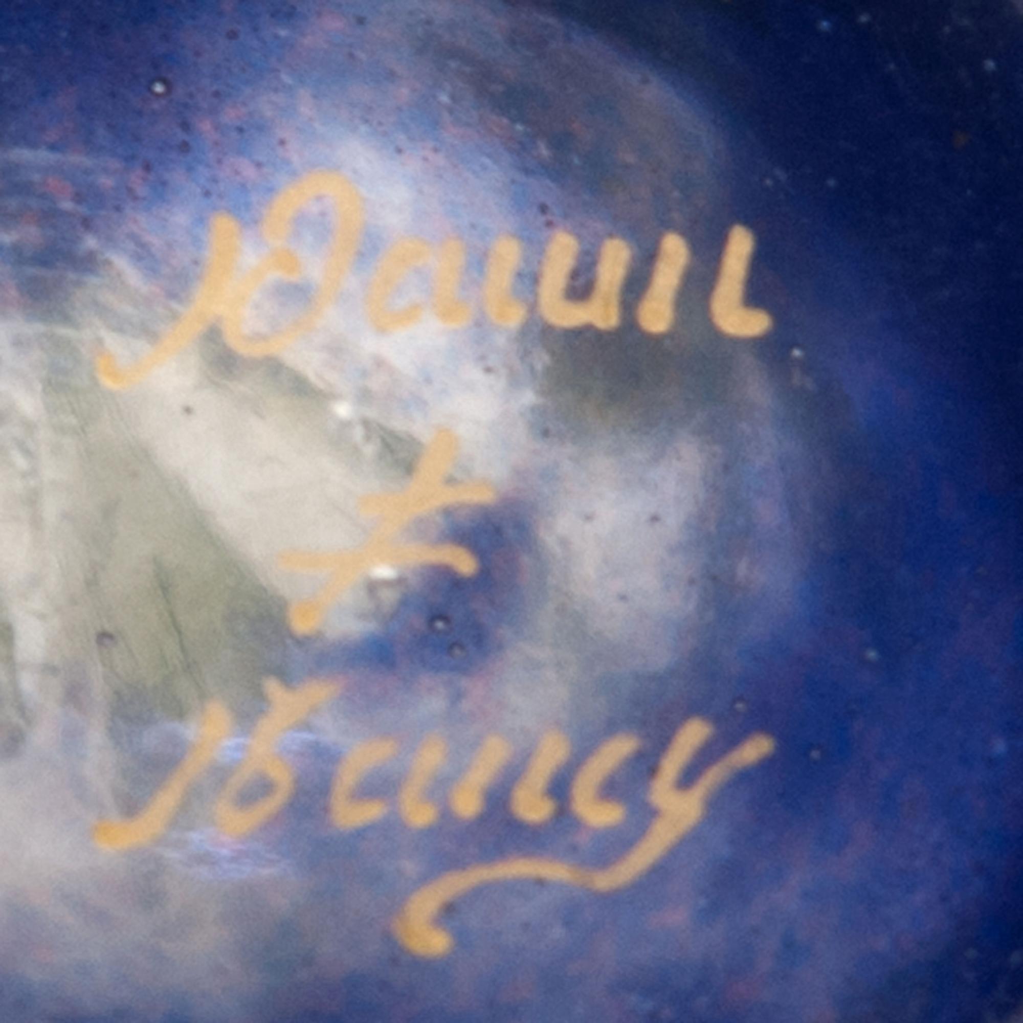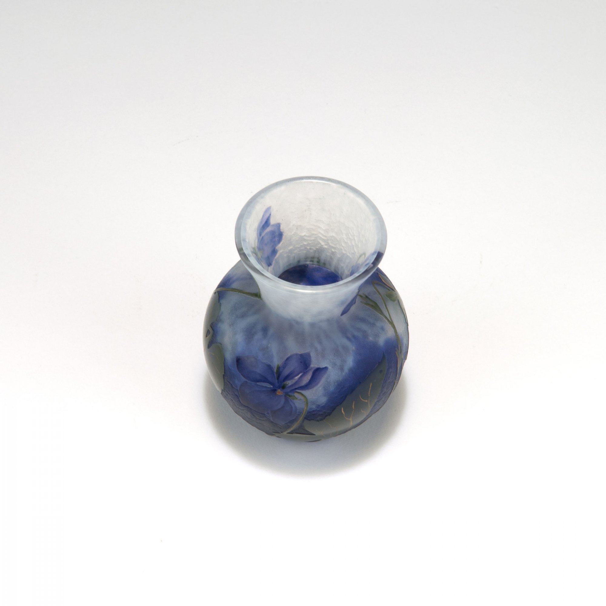 Daum Frères, Nancy. Small 'Violettes' vase, c1910. H. 8.5 cm. Cased glass, clear, milky white and blue powder inclusions. Etched and enamelled pattern with violets, gold hue. Rough ground. Signed: DAUM NANCY, cross of Lorraine.