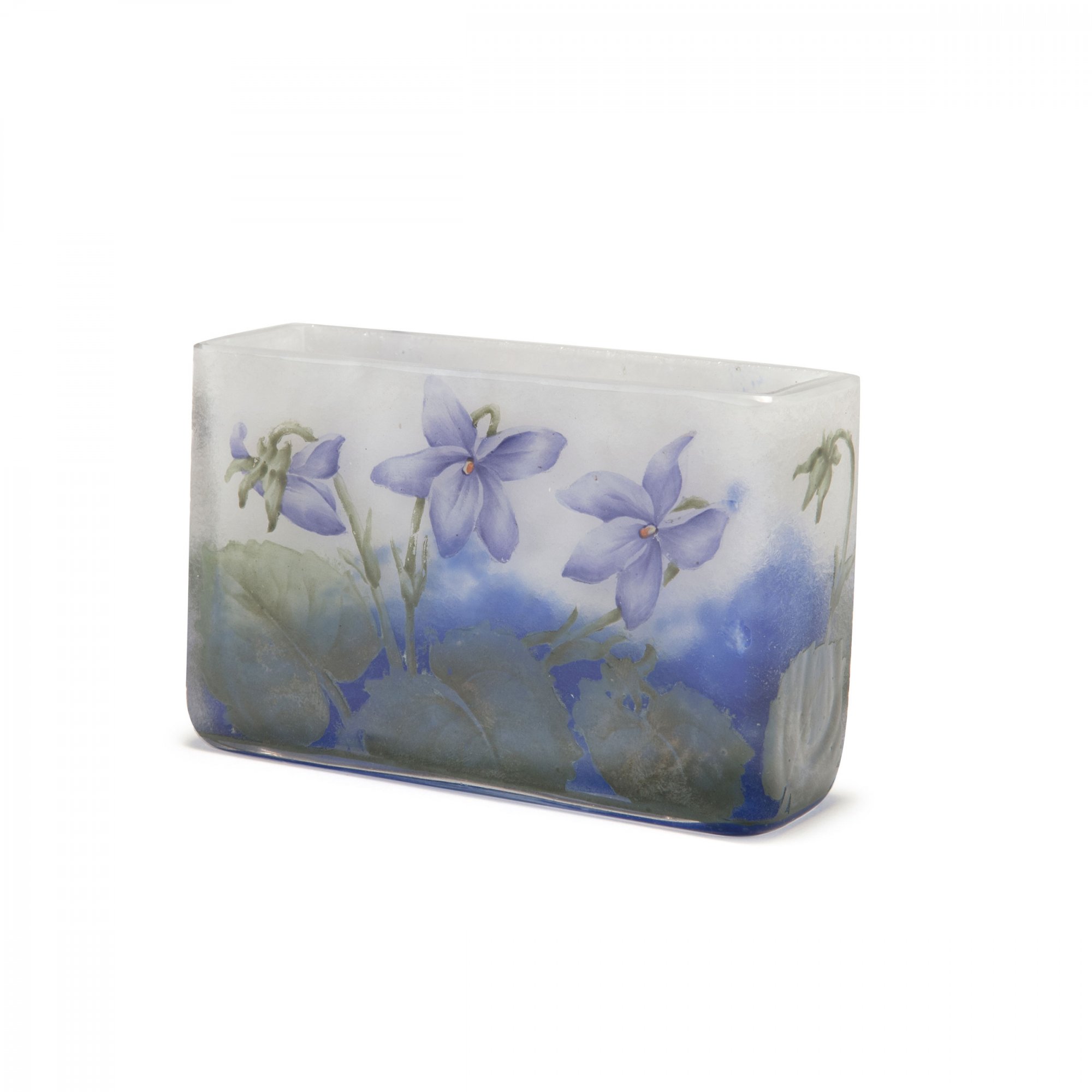 Daum Frères, Nancy. 'Violettes' jardiniere, c1910. H. 6 cm, 9 x 3 cm. Cased glass, clear, milky white and blue powder inclusions, etched and enamelled pattern with violets. Signed: DAUM NANCY, cross of Lorraine.