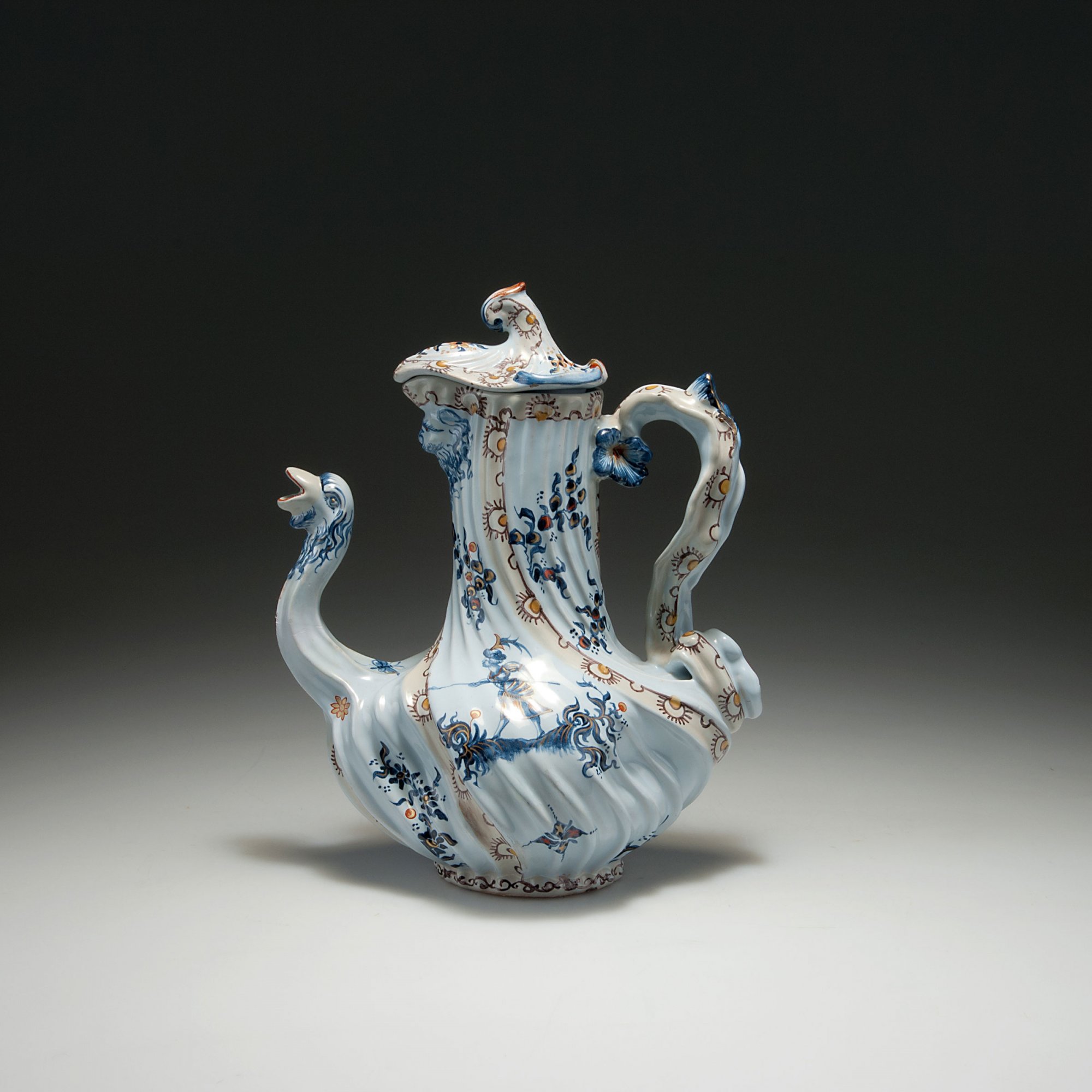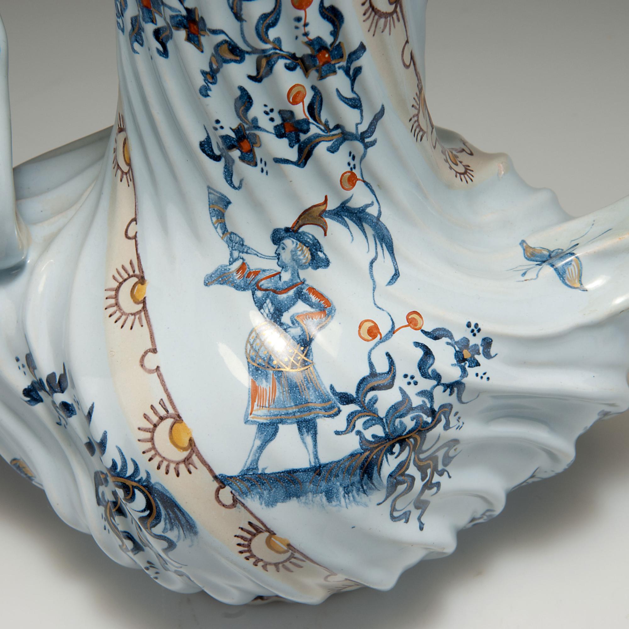 Emile Gallé, Nancy. Coffee pot, c1880. H. 27.5 cm. 'Terre de Lorraine' faience, white tin glaze. Painted, motif with two huntresses, tendrils, gold wash. Signed: E. Gallé à Nancy Déposé.