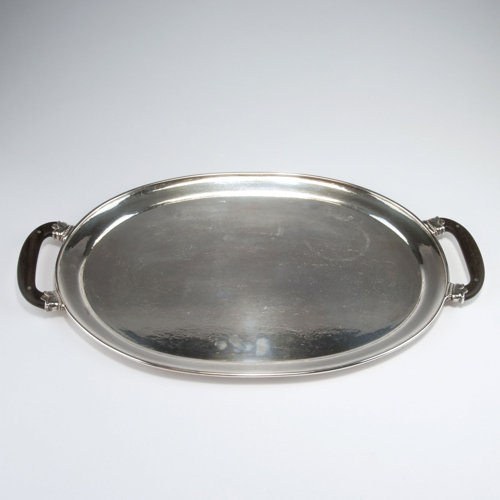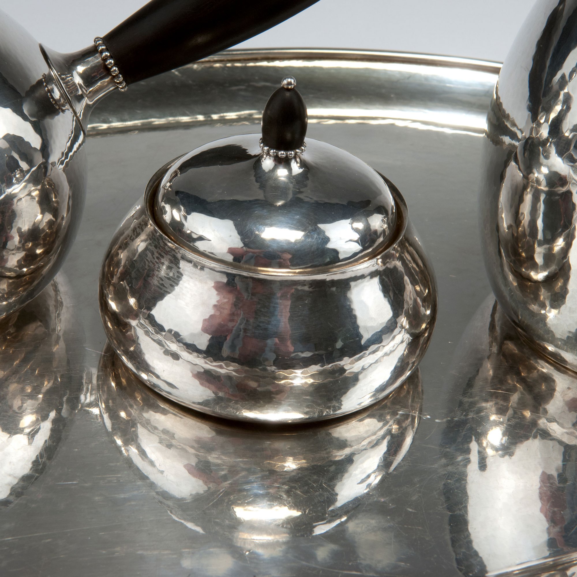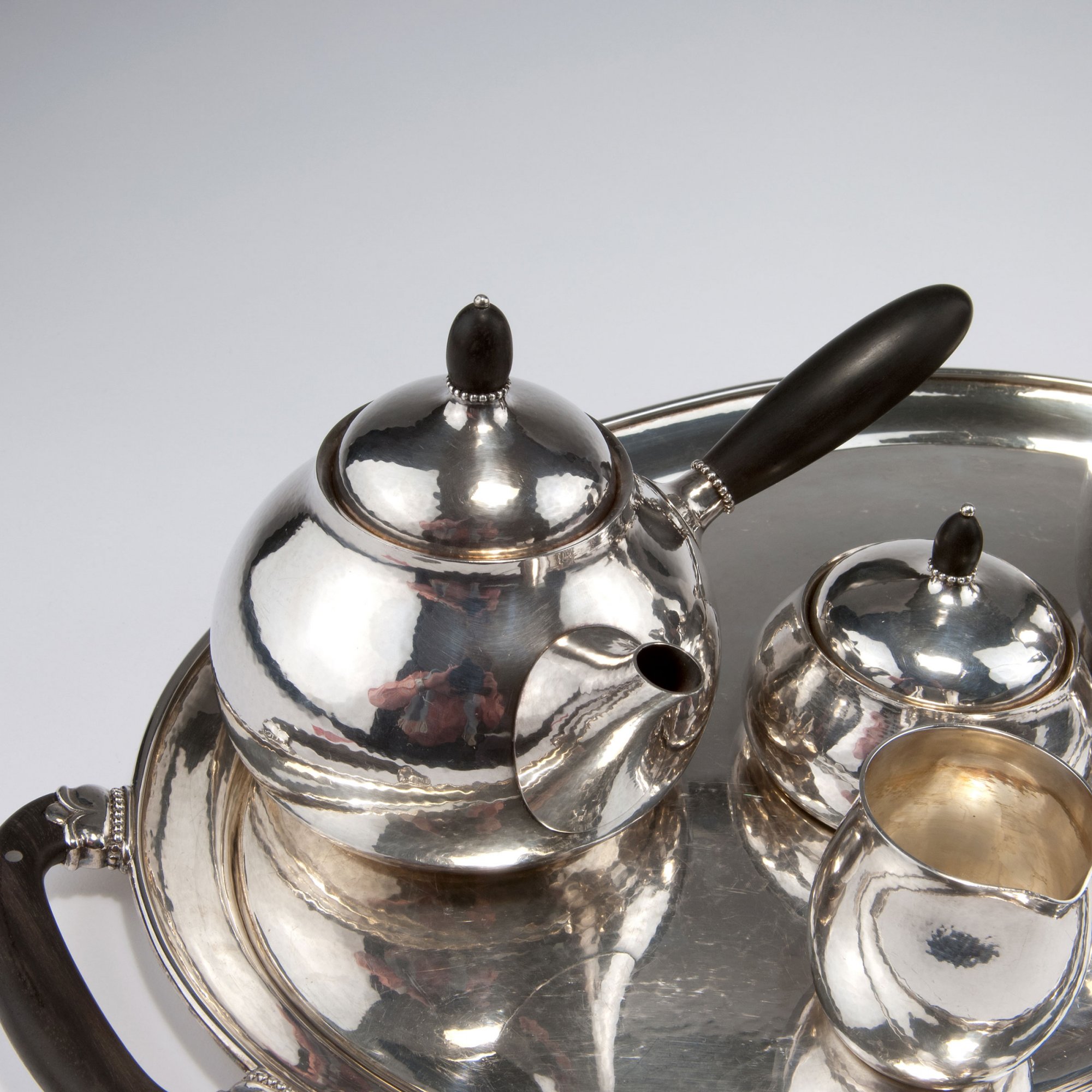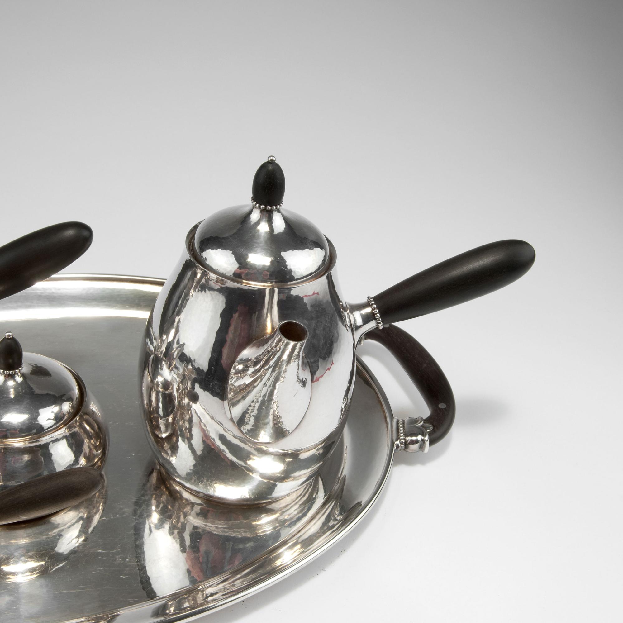 Georg Jensen, Copenhagen. 'Perl' coffee and teaset with tray, 1915. Five pieces. Coffeepot, H. 18.5 cm; teapot, H. 14.5 cm; creamer, H. 7.2 cm; sugar bowl, H. 9 cm; tray, 52.7 x 31.3 cm. Made by Georg Jensen, Copenhagen, past 1945. Silver, ebonised wood. Marked: 925 S, DENMARK, GEORG JENSEN, STERLING 80 A, B, C.
