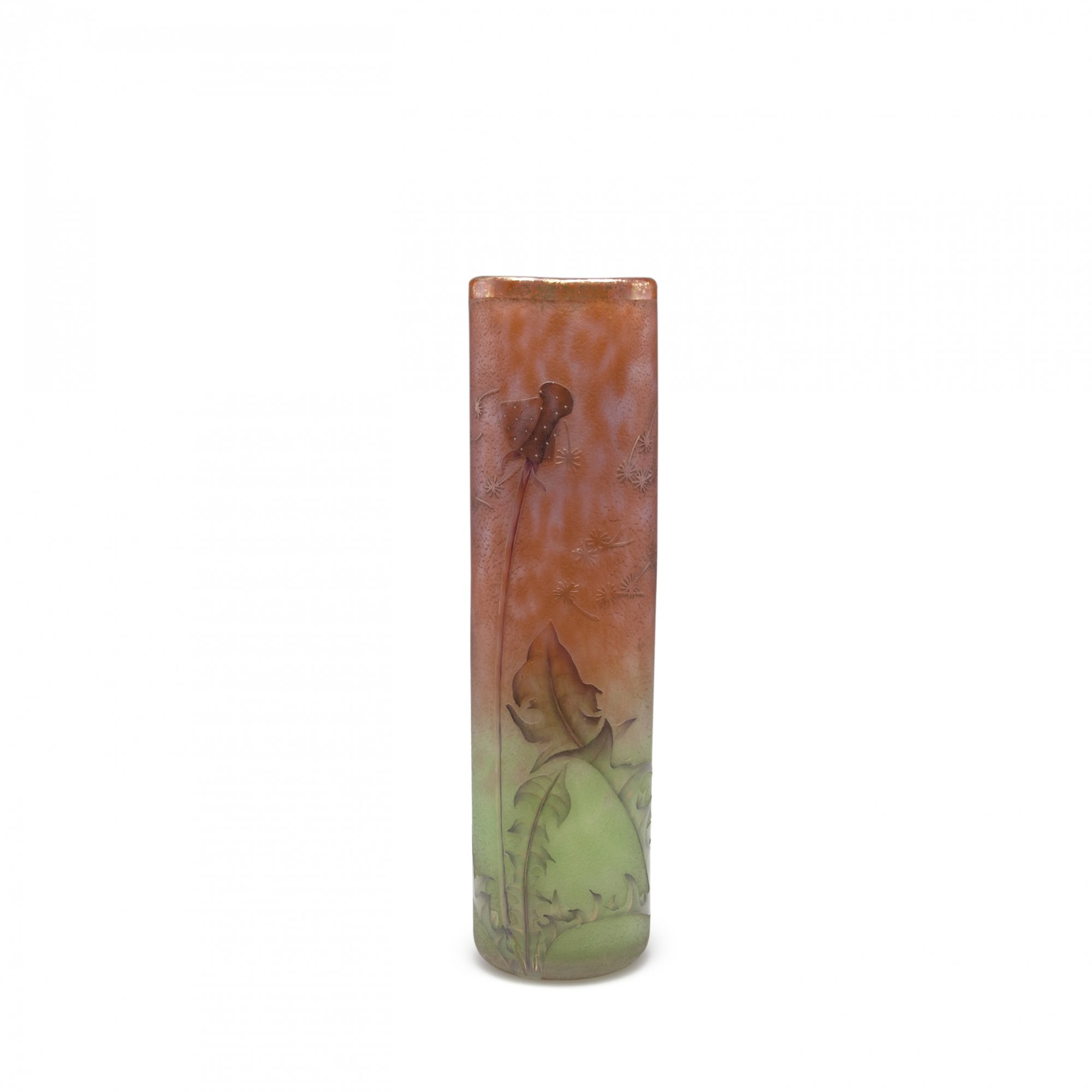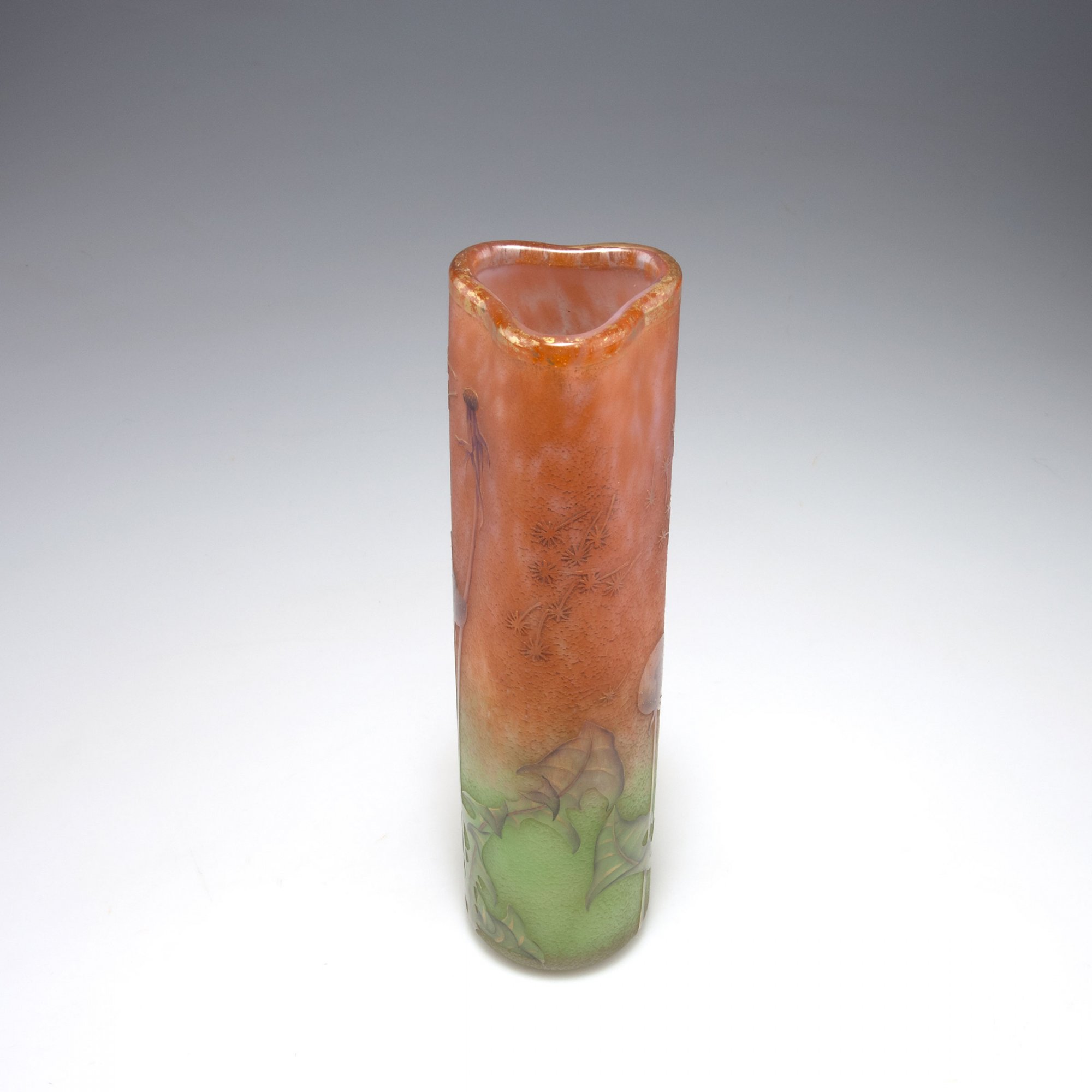 Daum Frères, Nancy. 'Chandelles' vase, c1903. H. 28.5 cm. Designed by Henri Bergé. Cased glass, milky white, pink and green powder inclusions. Etched pattern, Grisaille paint, gold. Dandelion, rough ground. Signed: Daum Nancy, cross of Lorraine.
