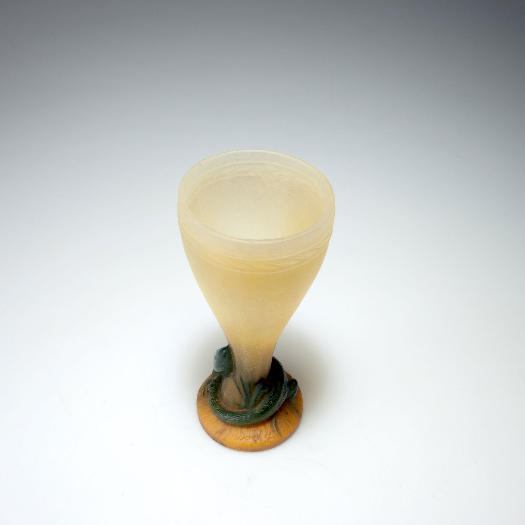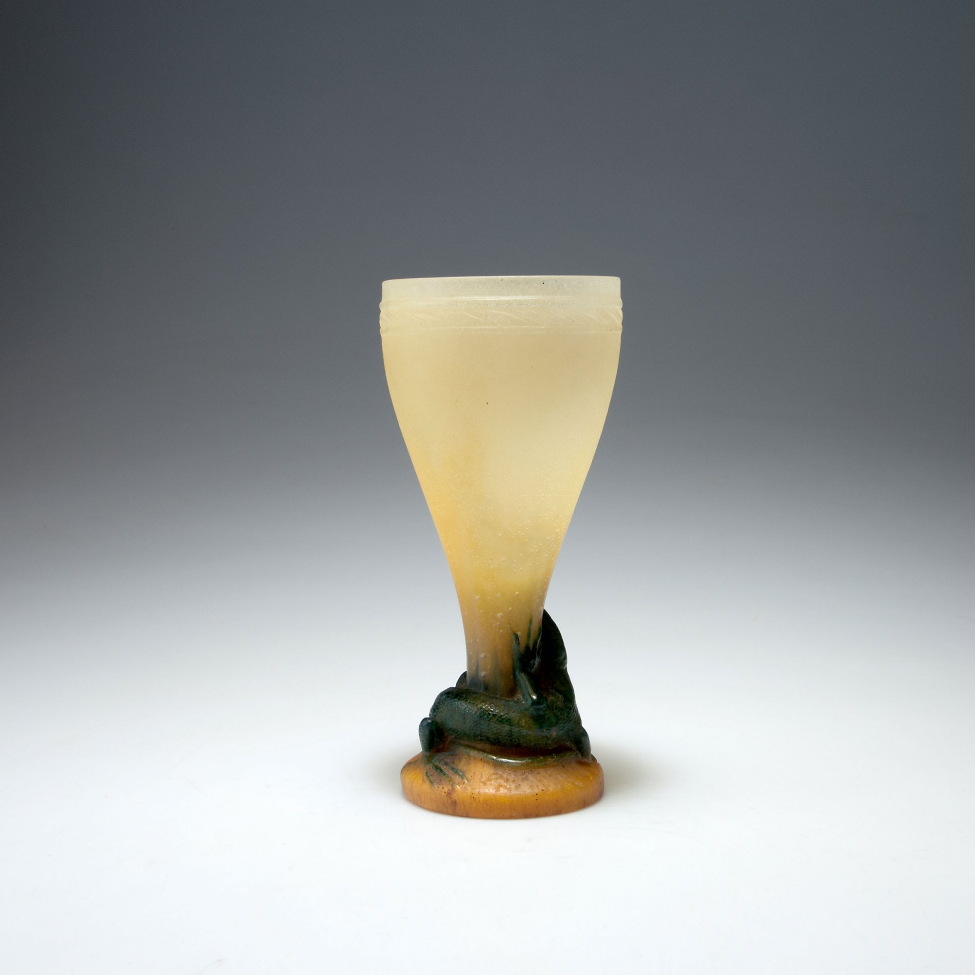 Amalric Walter, Nancy. 'Au lézard' vase, prior to 1914. H. 22.2 cm. Designed by Henri Bergé. Made c1920. Pâte de verre, translucid batch, yellow/orange, dark green lizard. Signed: AWALTER NANCY, H.Bergé SC.