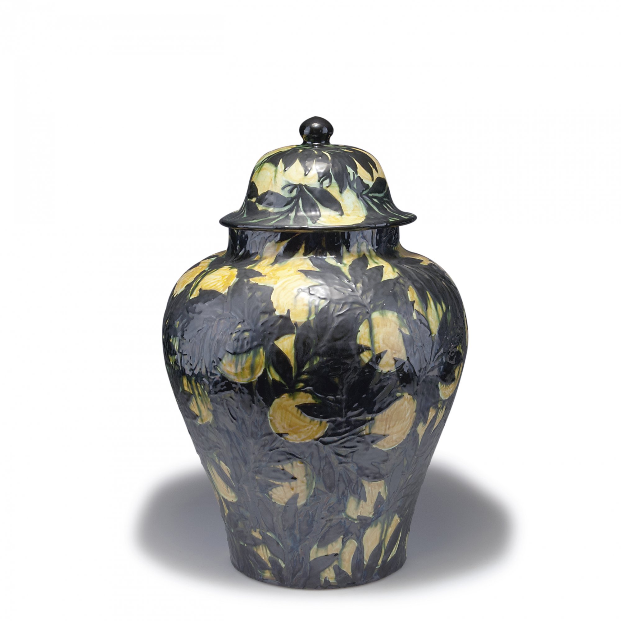 Max Laeuger. Large 'Lemons' vase with cover, 1921. H. 50 cm, D. 35 cm. Made by Majolikamanufaktur Karlsruhe, 1921-25. Majolica, slip glaze yellow and dark blue, almost black. Marked: Maker's mark, 1800, Baden (m), PROF. LÄUGER, b.