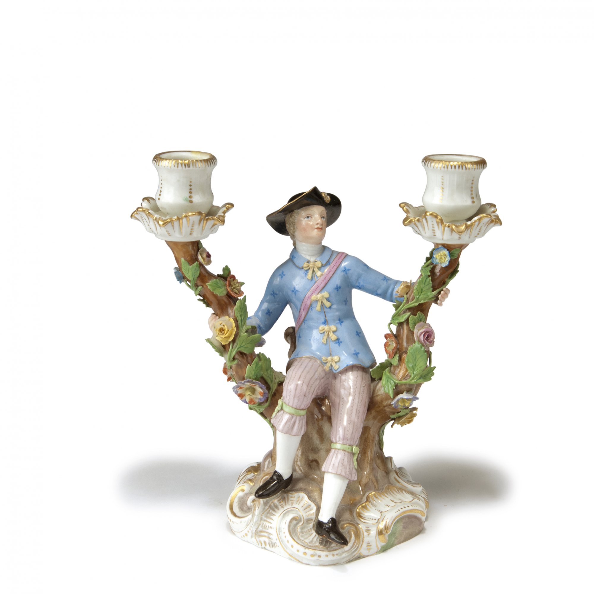 KPM Meissen. 'Chevalier' candlestick, c1880. H. 20 cm. Model by J. J. Kaendler. Porcelain, white, glazed. Polychromatic overglaze and gold. Marked: Maker's mark, 1129, 148.