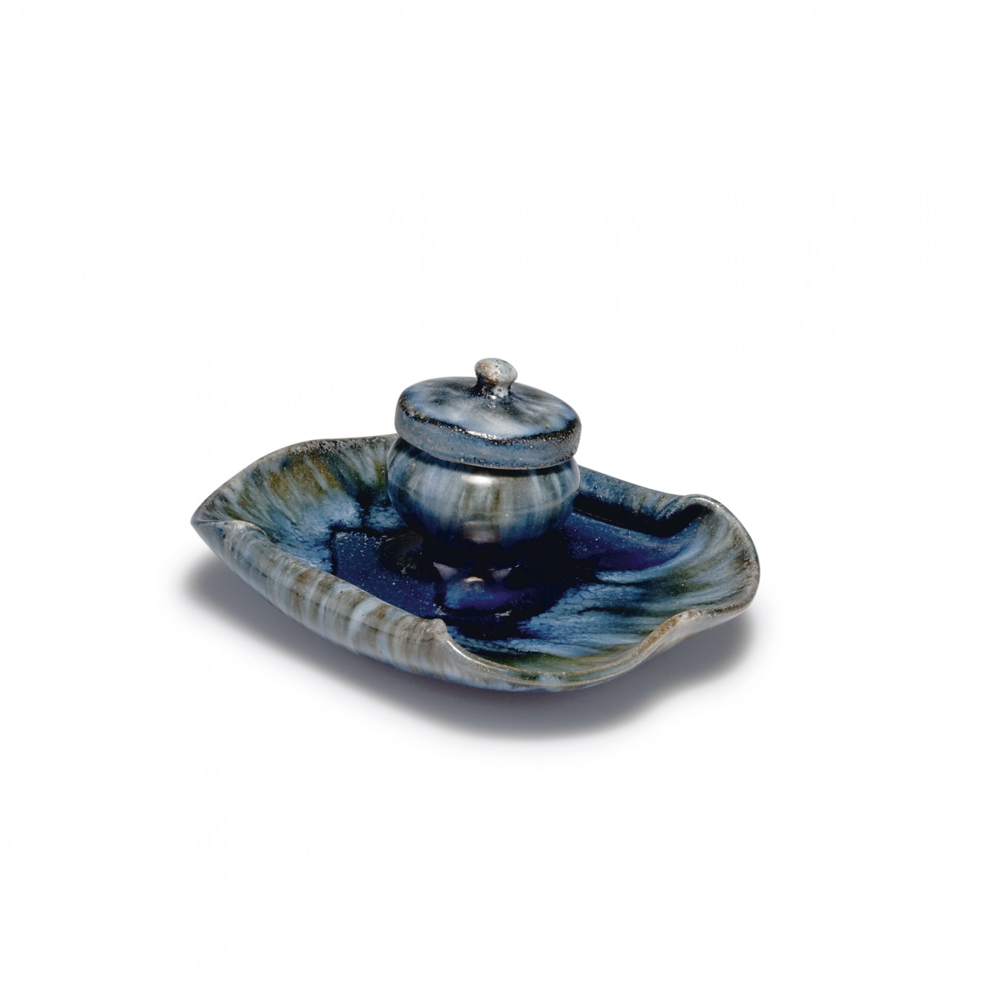 Hermann Mutz, Altona. Inkwell, 1902-13. H. 10 cm; 19.3 x 15 cm. Stoneware, glazed dark blue and green. Marked: MUTZ ALTONA, 614, HERMANN MUTZ (inscribed, probably added by a later hand).