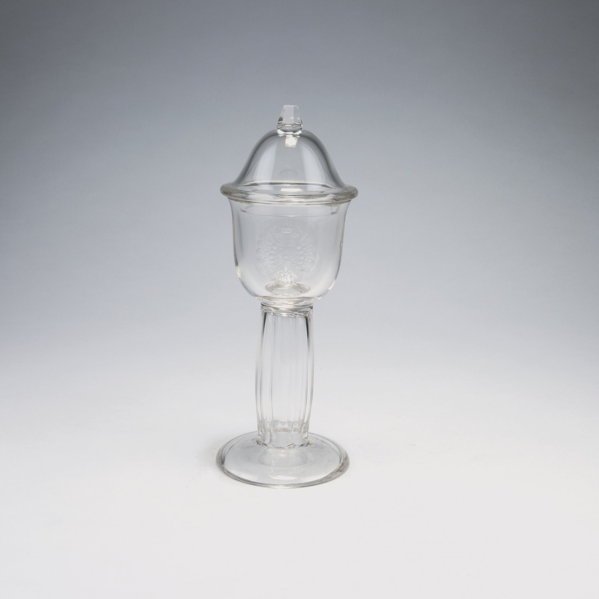Johann Oertel, Haida. Goblet and cover, 1913. H. 23.3 cm. Designed at technical college Haida. Clear glass, cut, engraved Austrian coat of arms with double eagle.
