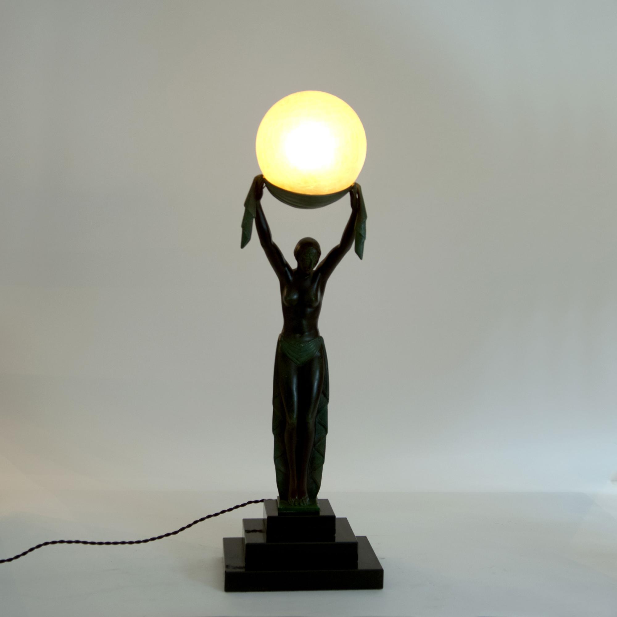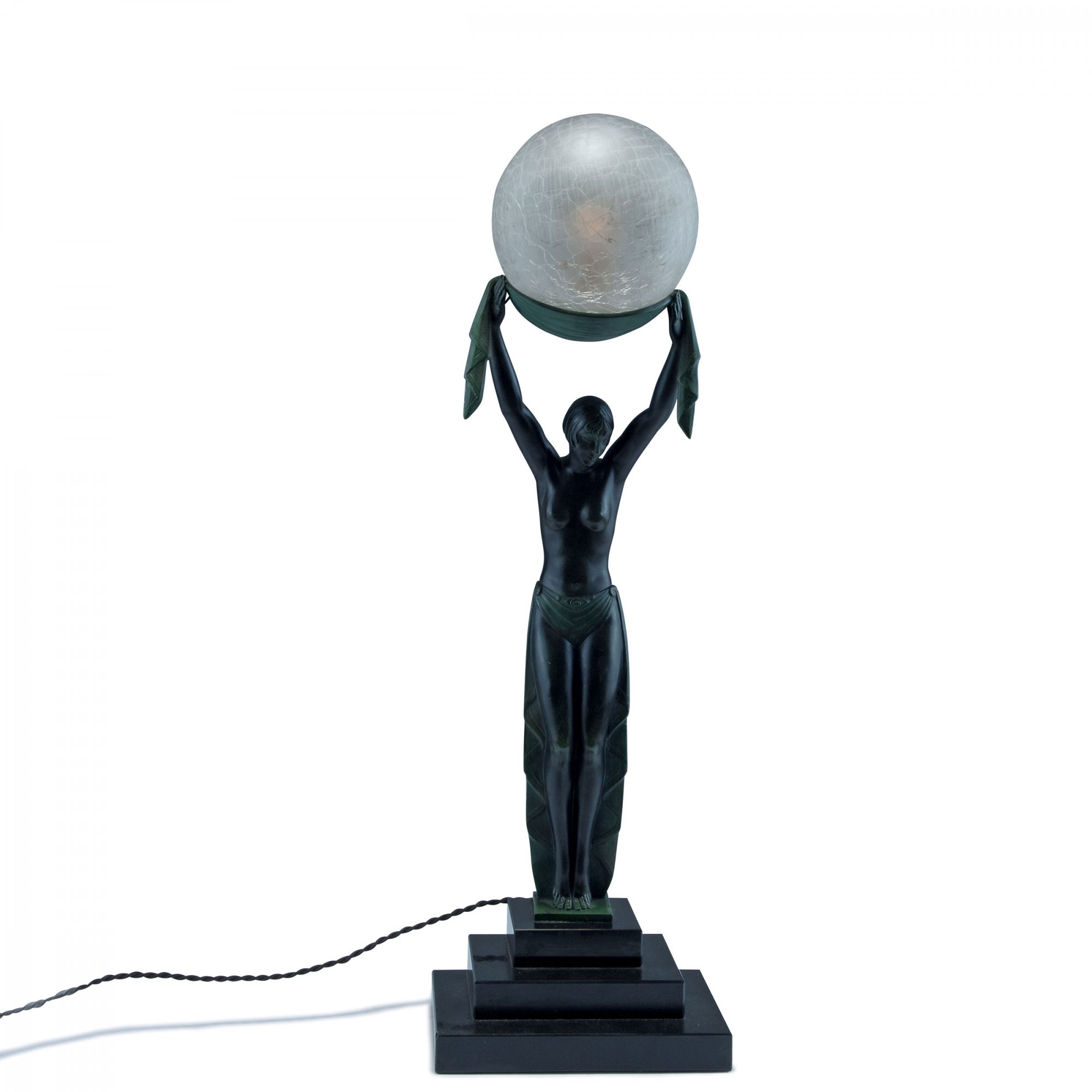 Pierre Le Faguays. 'Vérité' table light, c1930. H. 69 cm. Made by Max Le Verrier, Paris. Cast metal, green patina. Ball of clear, crizzled glass. Signed: Fayral, LE VERRERIER PARIS (founder's stamp).