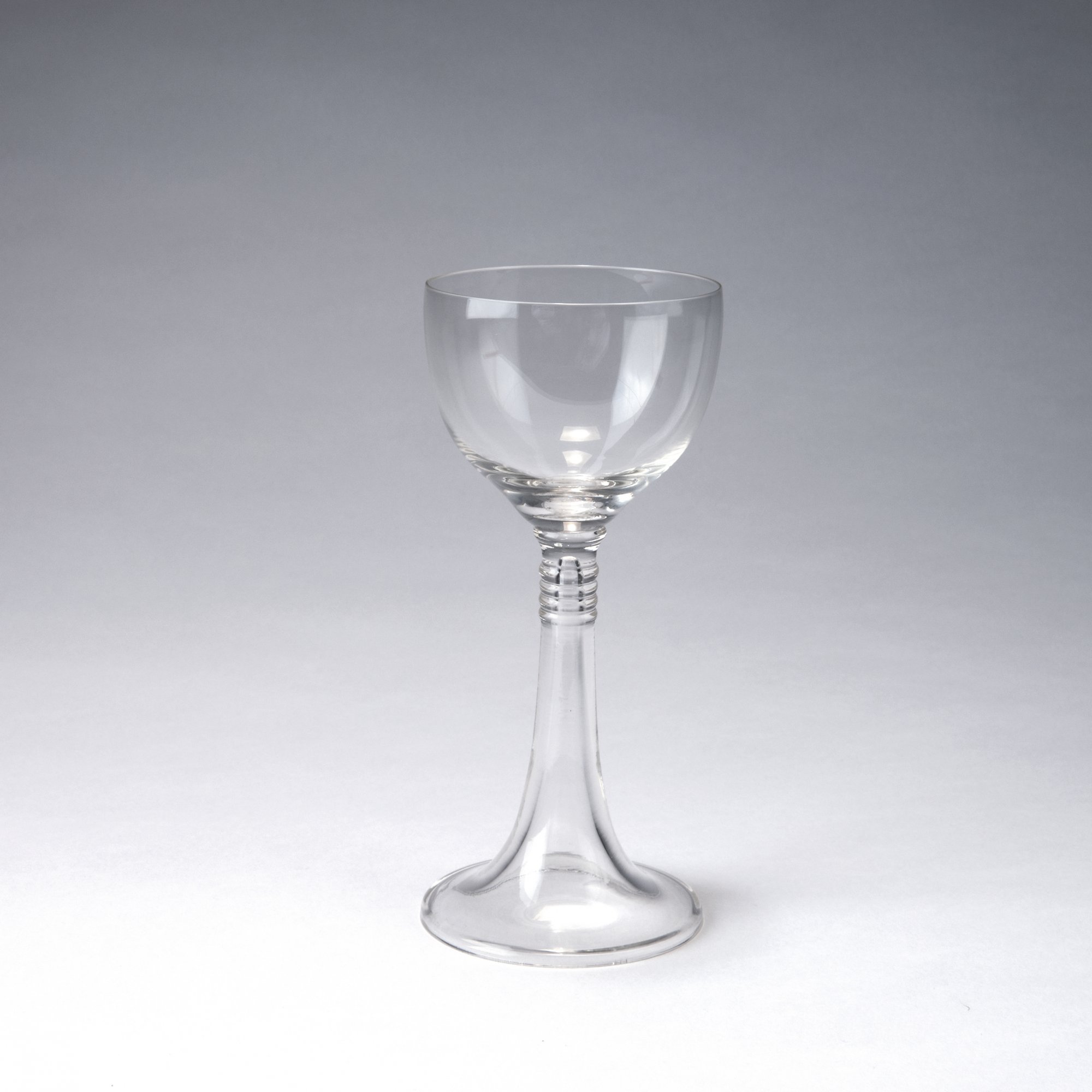 Richard Riemerschmid. 'Riemerschmid' white wine glass, c1900. H. 16.4 cm. Made by Benedikt von Poschinger, Oberzwieselau. Clear glass, horizontal ribs.