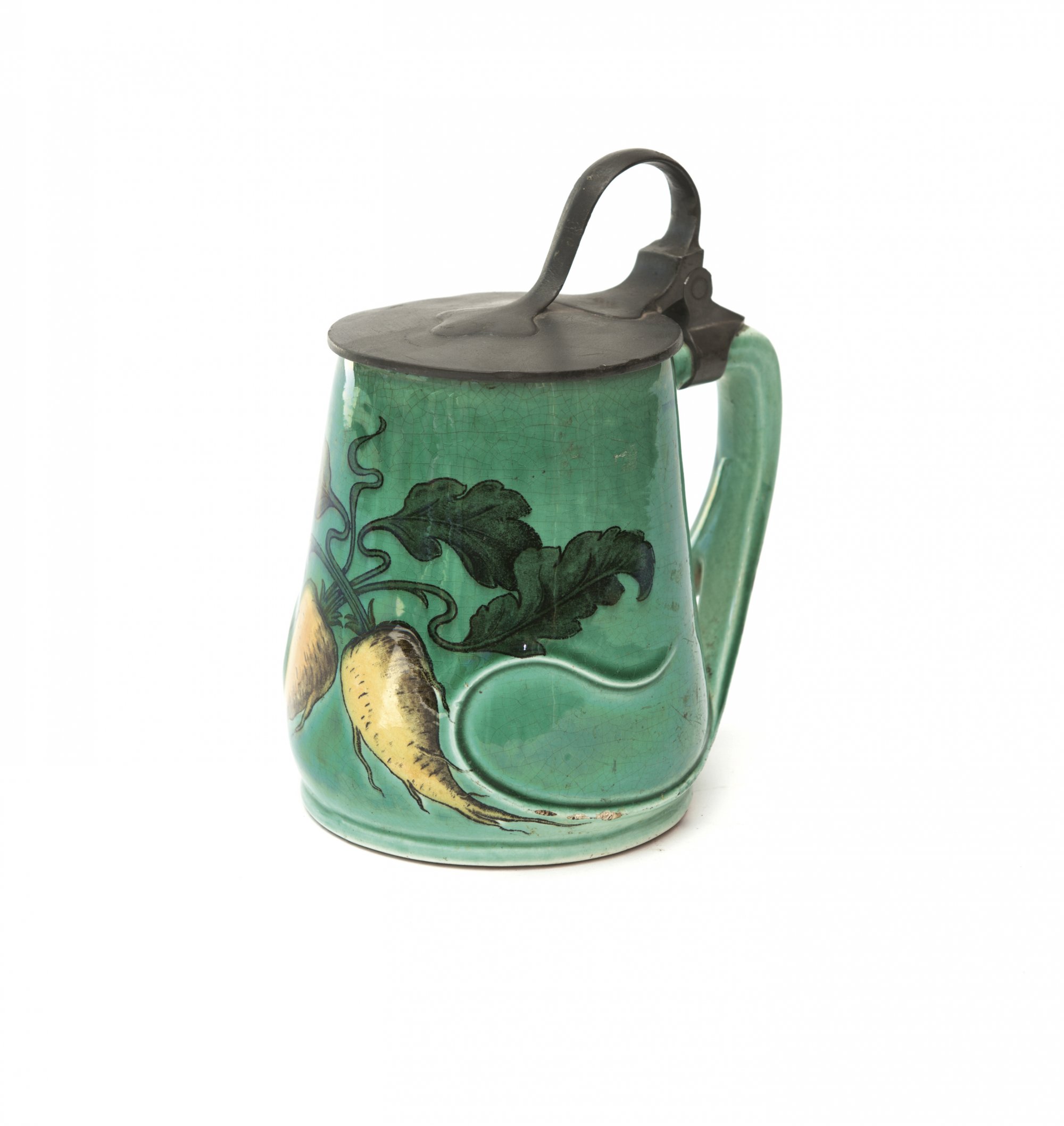 Richard Riemerschmid. 'Radish' beerstein, 1900. H. 16 cm. Made by Villeroy & Boch, Mettlach for Vereinigte Werkstätten, Munich. Faience, polychromatic glaze, two radishes. Marked: Maker's mark, Dec. 178, RR VW.